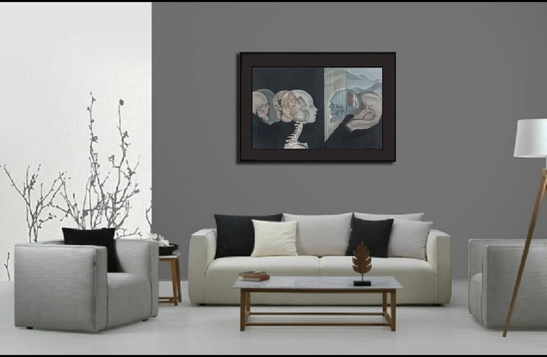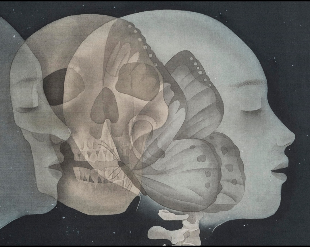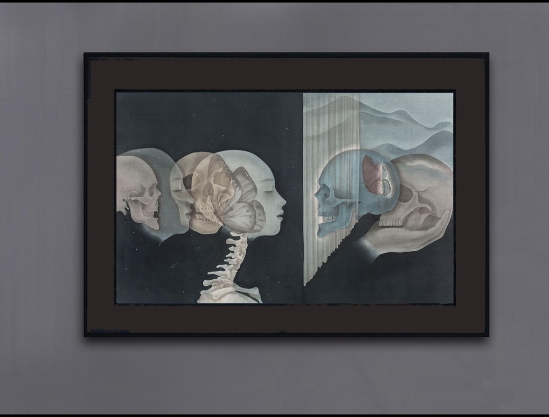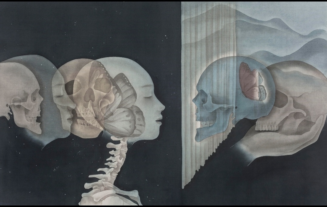 帷幔之后,是远古的山水,手托的层层头骨,一只渐入的蝴蝶是自我灵魂的象征,与之对视的头像内部那只蝴蝶已经长大扎根,一个个“本我”处在星空里,帷幔前后如同划分开了古与今,现在与未来,想象与现实,闭上双眼似乎是看破这一切虚无的本源。