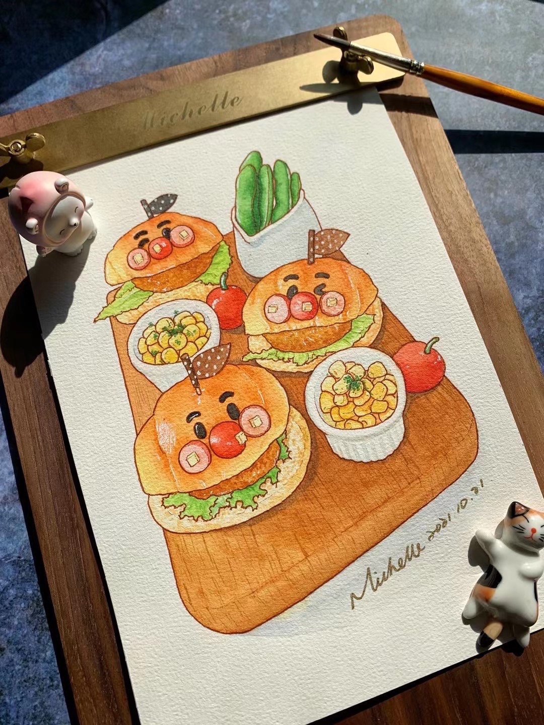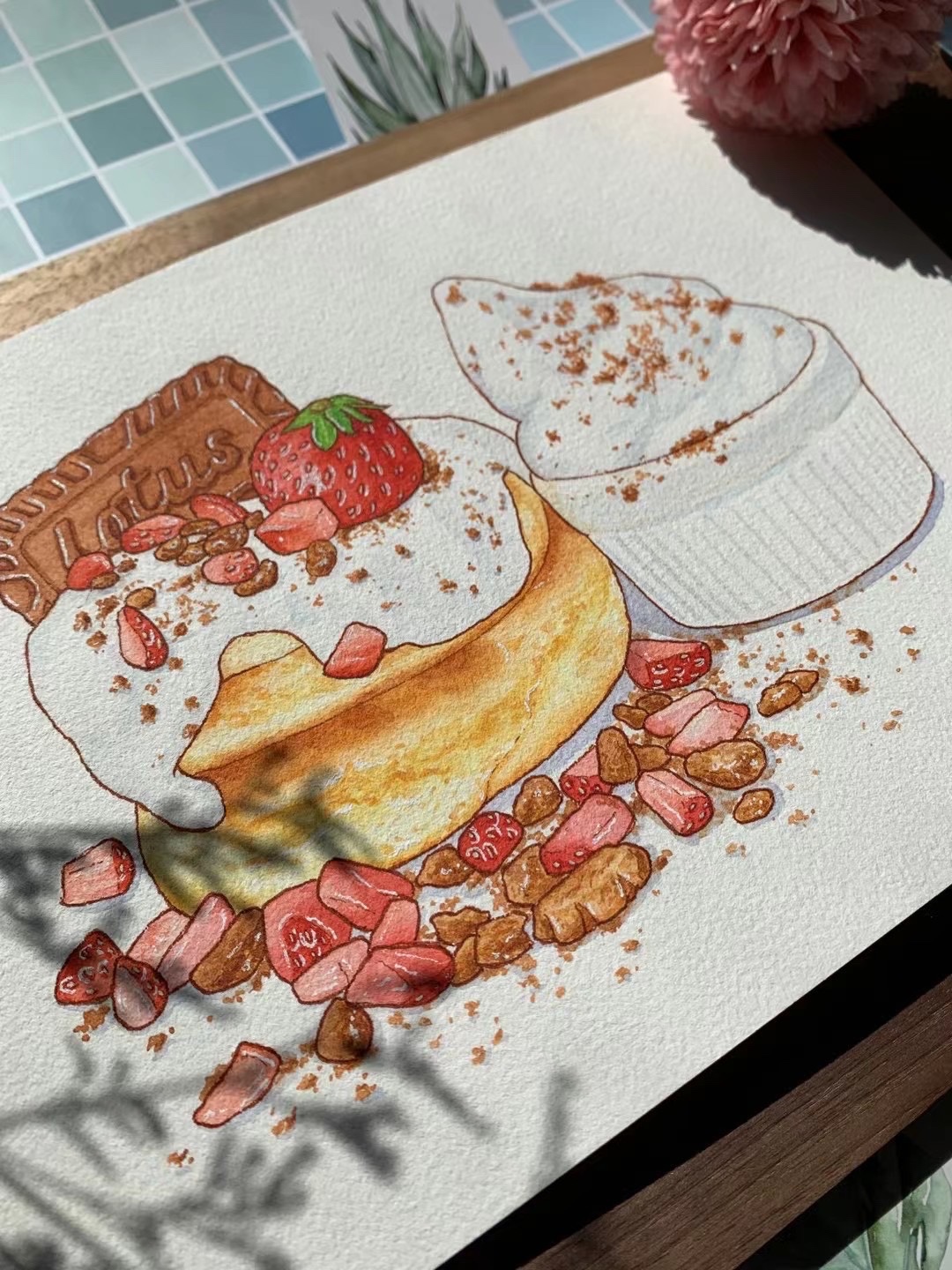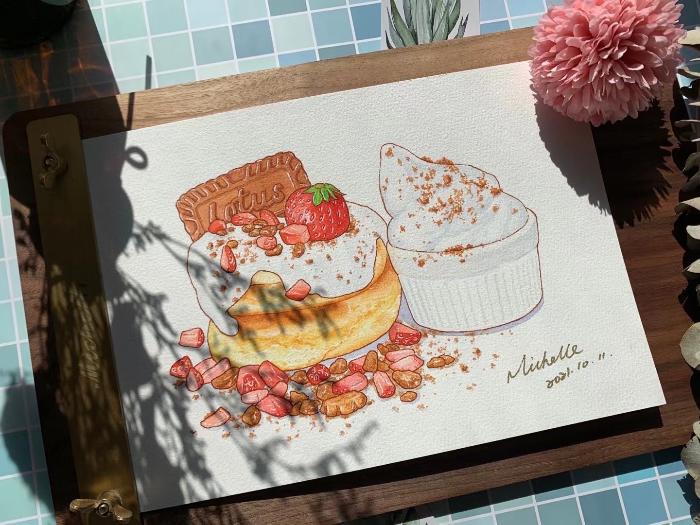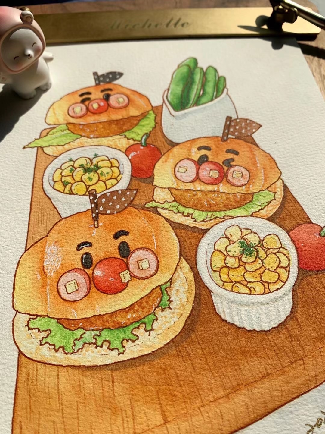 Michelle手绘水彩美食插画|焦糖奶油草莓舒芙蕾和面包超人汉堡