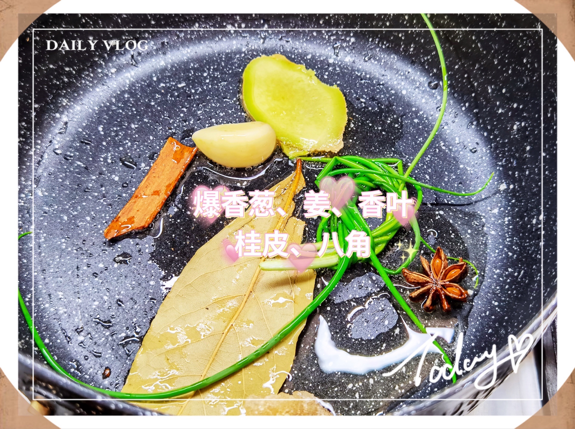 小锅加一勺油,爆香葱、姜、香叶、桂皮、八角。