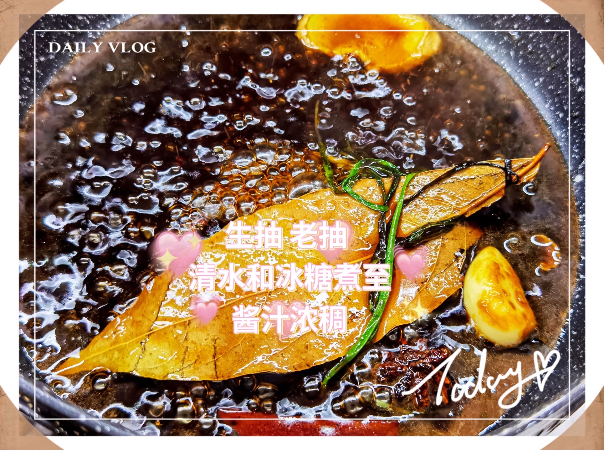 加入调好的酱汁,再加半碗清水和冰糖煮至冰糖溶化,酱汁浓稠。移火放凉备用。