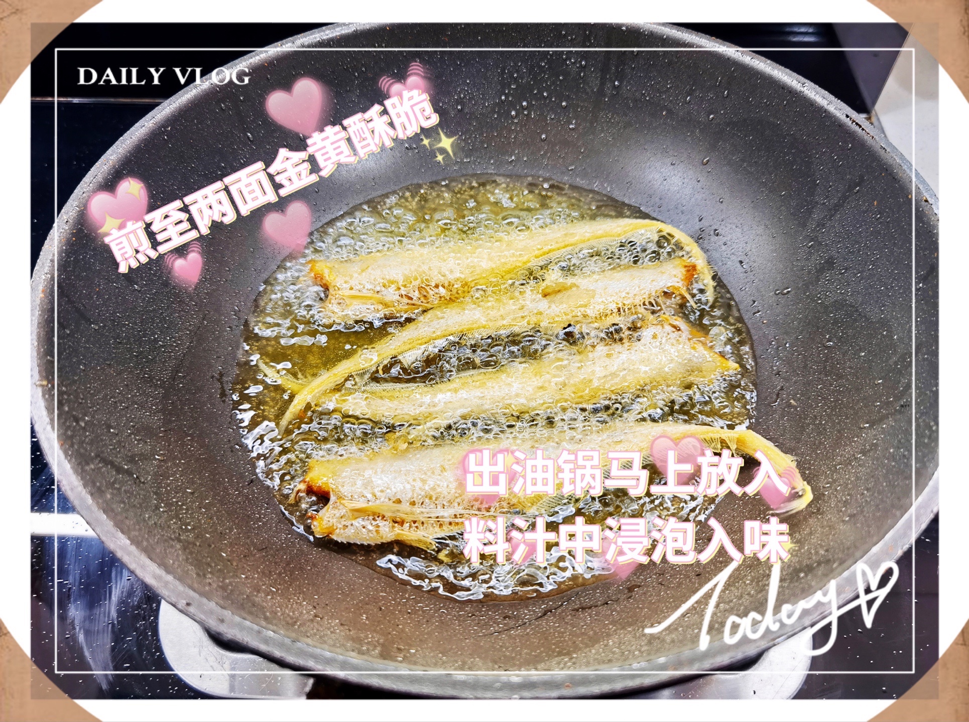 煎好的烤子鱼出油锅马上放入料汁中浸泡入味。
