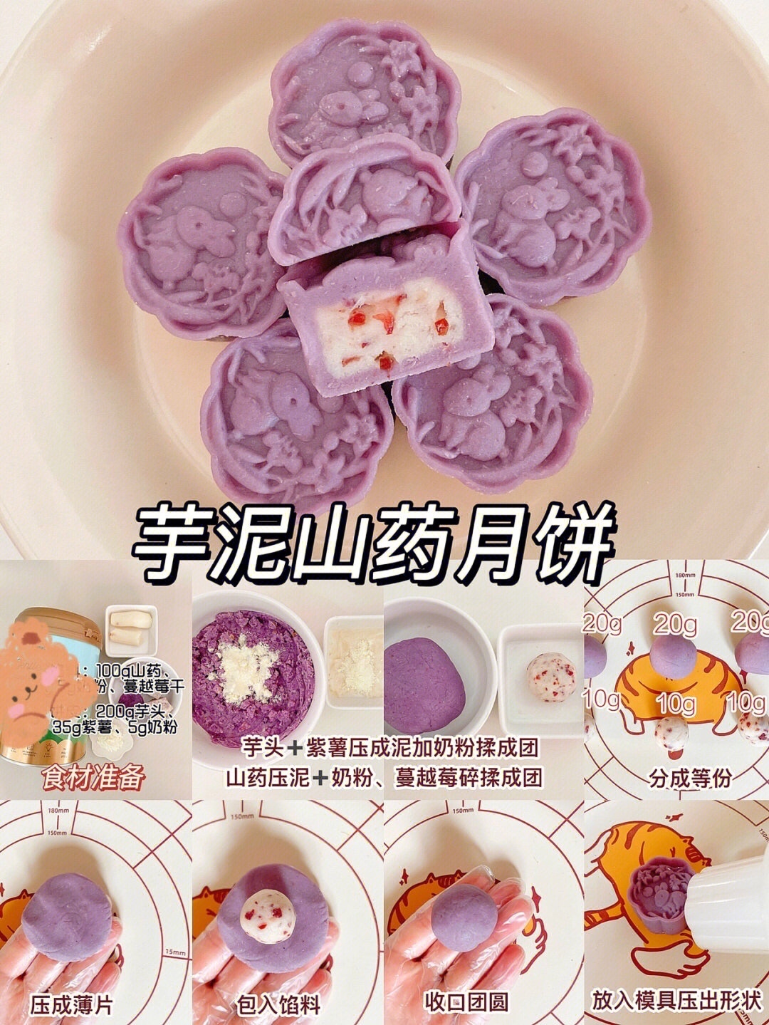 1、芋头、紫薯蒸熟压成泥加奶粉揉成团,分成等份,山药蒸熟压泥加奶粉,蔓越莓碎揉成团