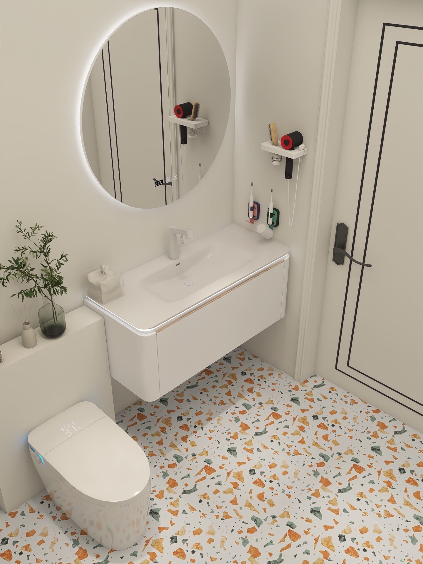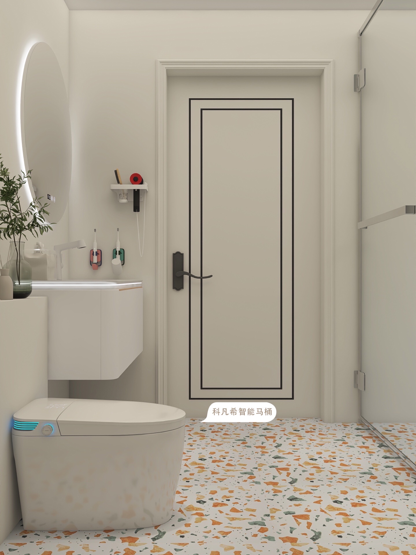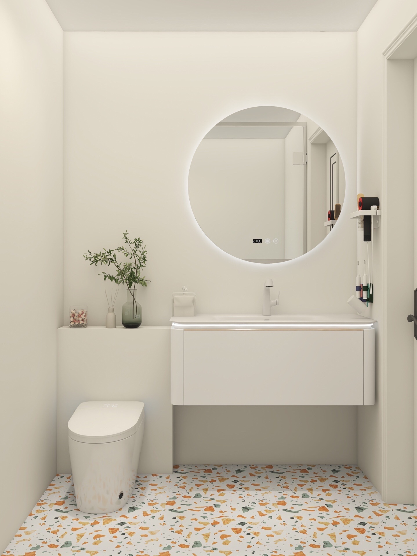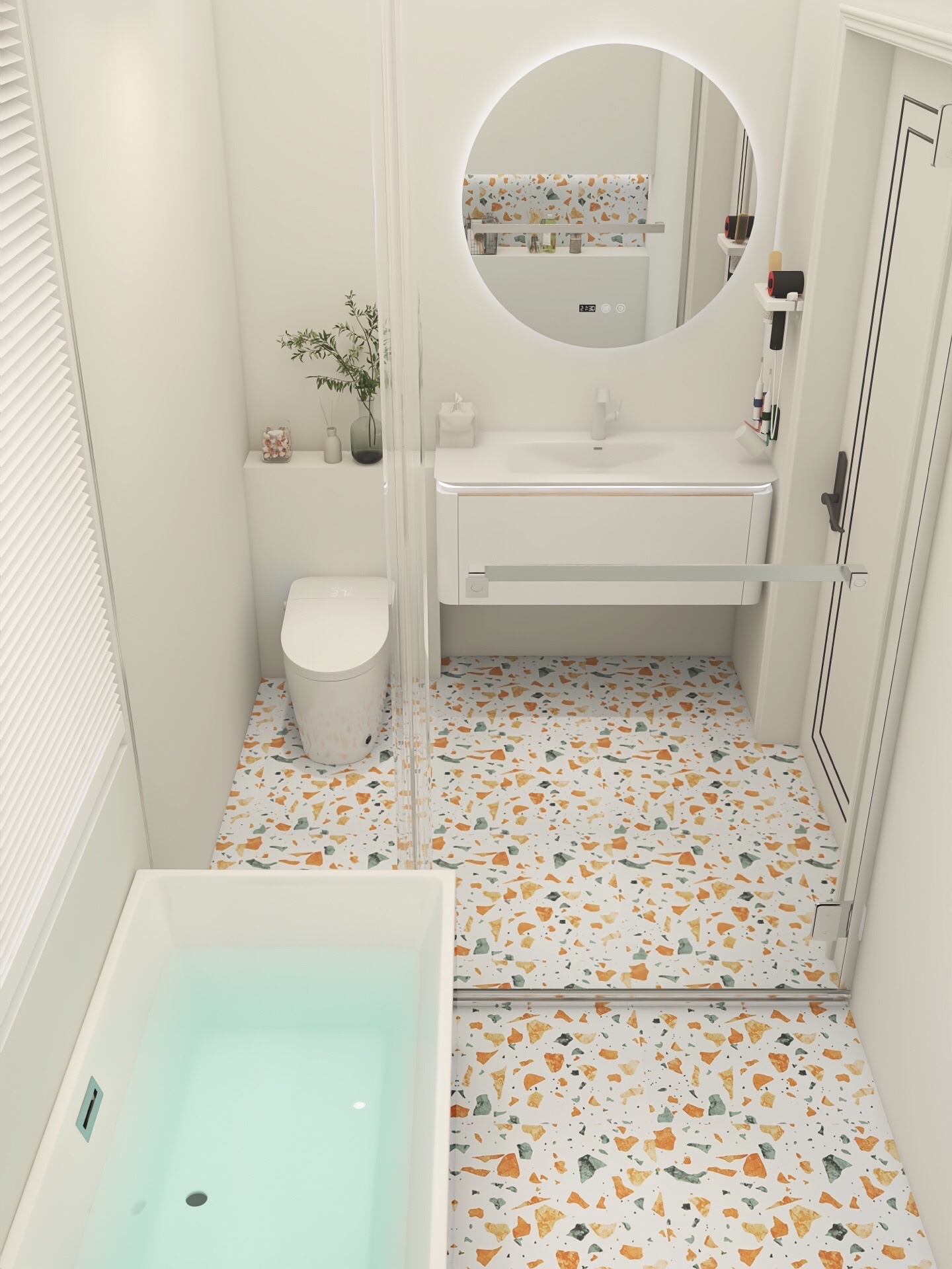 清新治愈,没错,是我喜欢的风格。碎花水磨石地砖、素雅高科技卫浴,让卫生间大气又实用