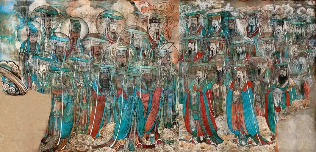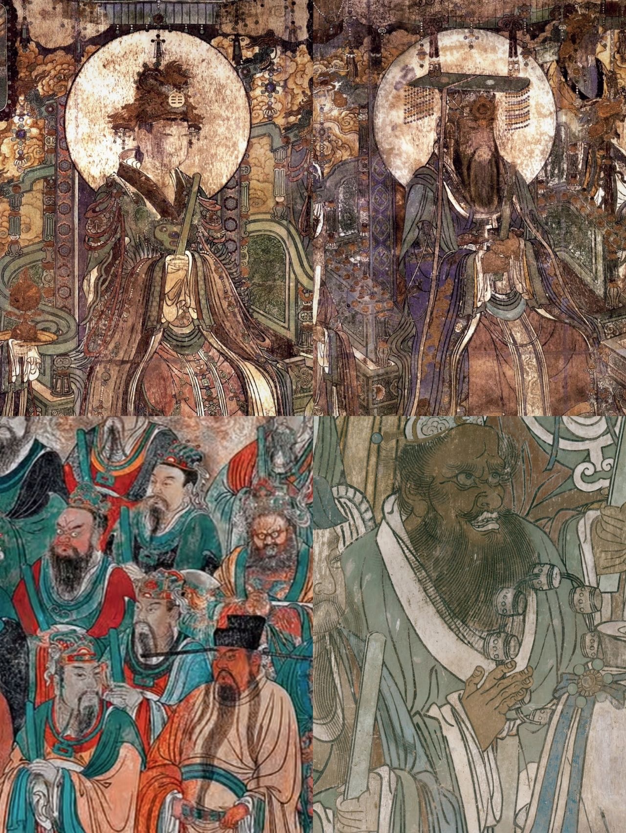 先来说说壁画。永乐宫是中国绘画史上的一座丰碑。永乐宫建于元代,一开始是为了纪念吕洞宾而建造的道观。其中最为震撼的是三清殿内的《朝元图》,展现了道教290位神祈朝拜元始天尊的盛大场面。该壁画气势恢宏且拥有丰富的细节,可以从各个神仙的神态动作中看出他们性格和情感。而三清殿后面的纯阳殿则是供奉着吕洞宾,并以壁画的形式展现了吕洞宾的生平。
