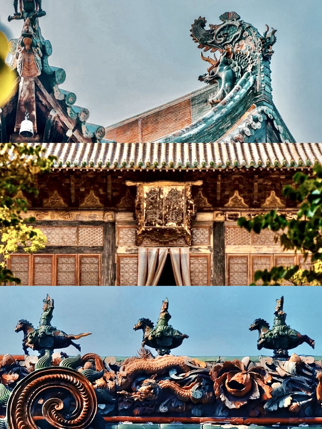 屋脊上的琉璃鸱吻,硕大无比,但为了保护文物,原件鸱吻已在搬迁时被拆下,保存于博物馆中,现在的鸱吻为现代补建。三座大殿中三清殿的体积最大,后面两殿体积逐渐缩小。