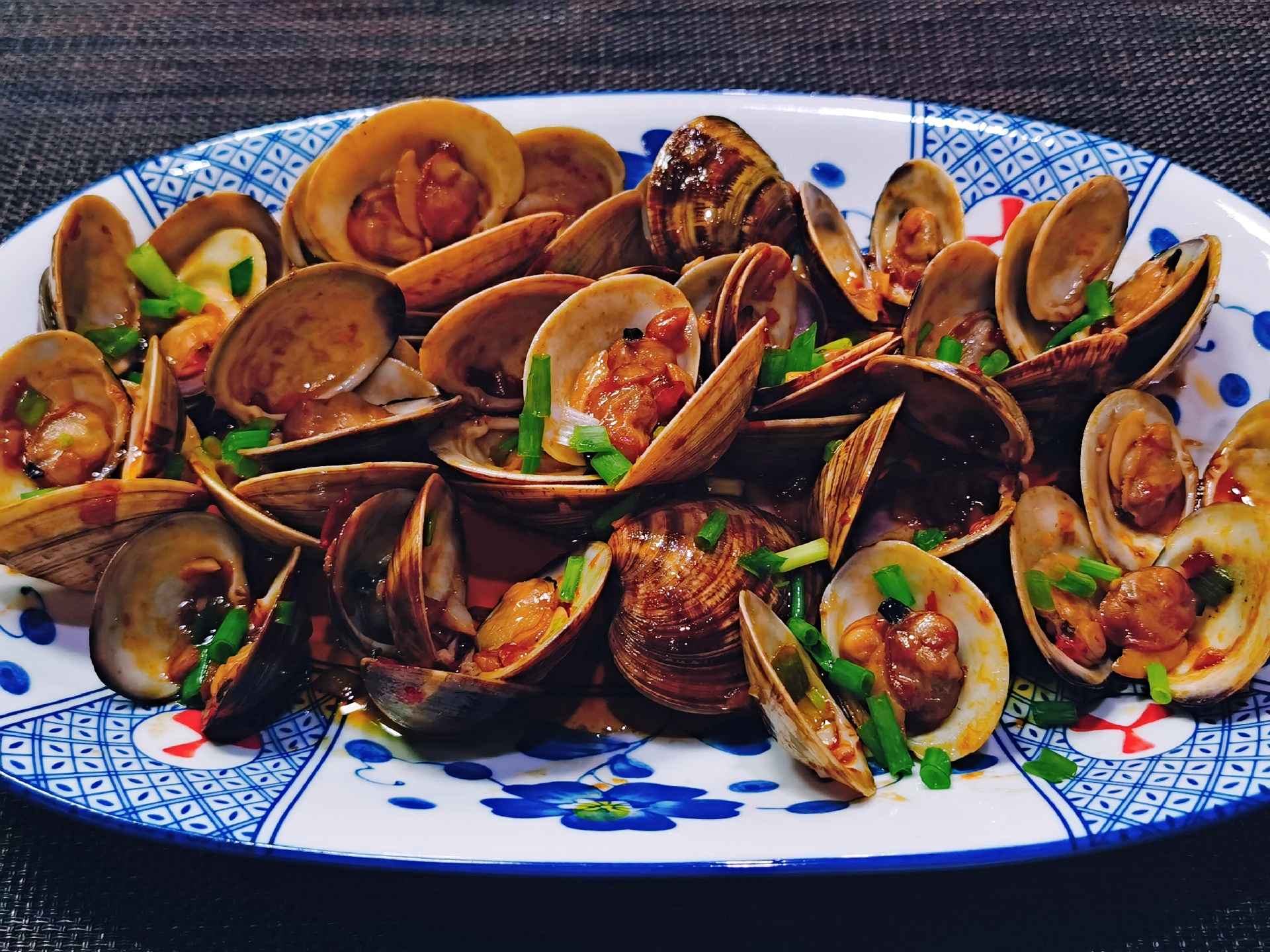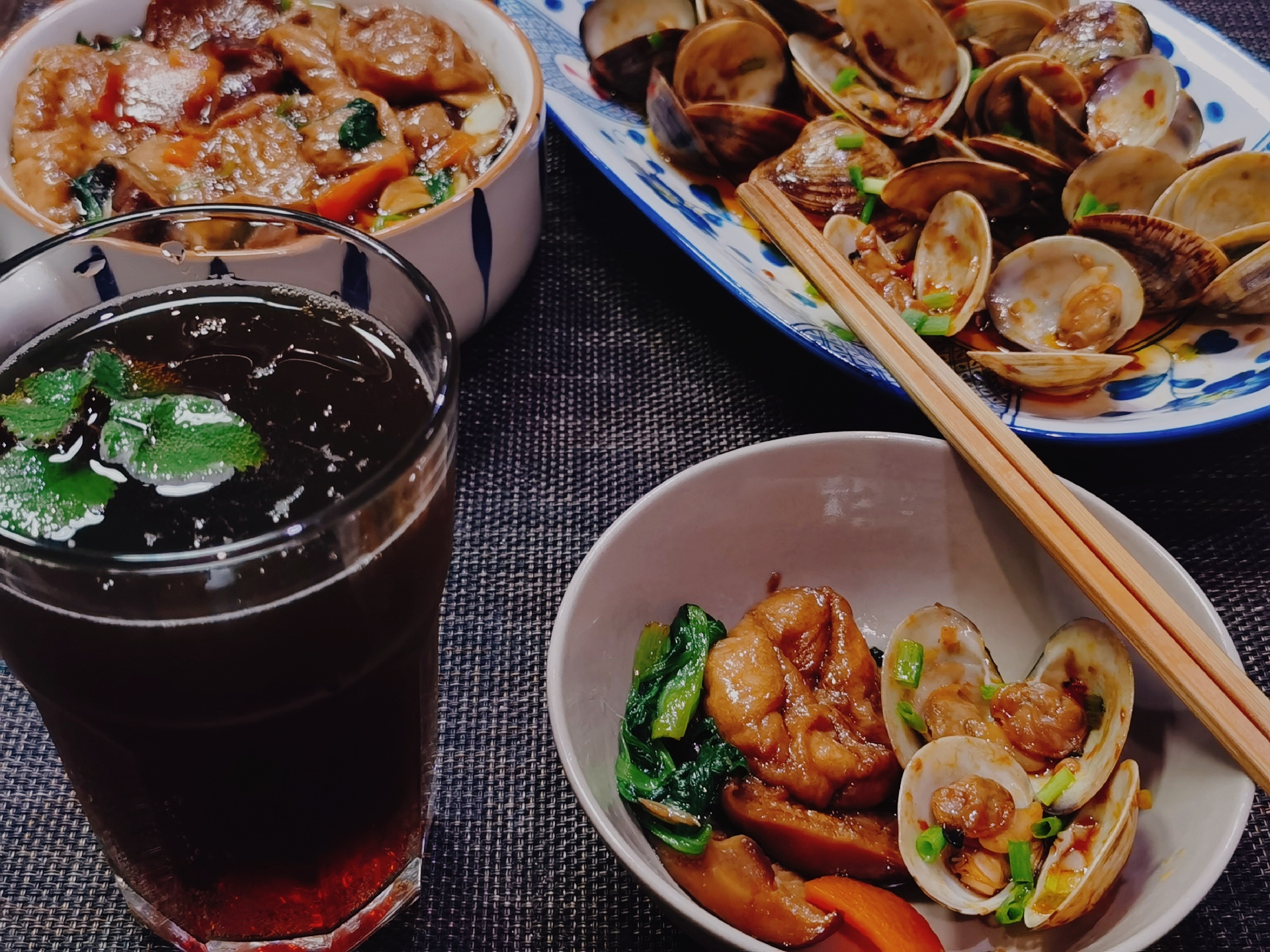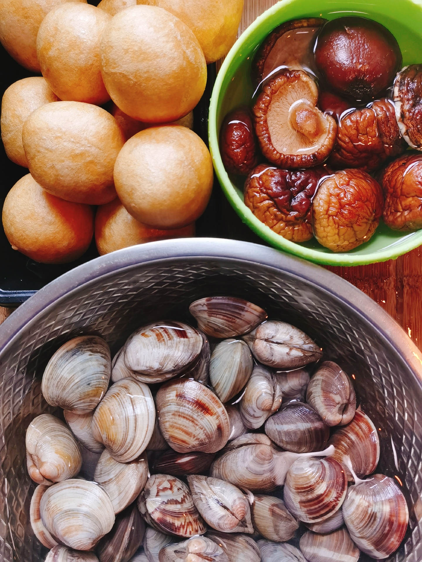 今晚做个香菇面筋煲、炝炒蛤蜊一起下酒。