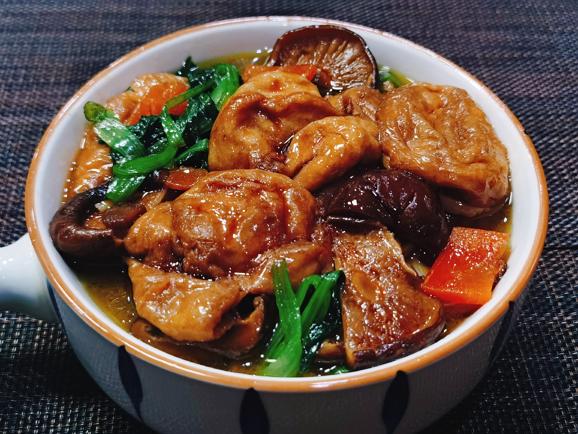 年龄还是个位数的时候吃了一次龙华寺的素面,浇头是香菇面筋,惊为天人,从此就是自己最爱吃的面浇头了,在自己做饭之后有机会就试做,总算做出了外貌和滋味口感都相仿的满意成品。