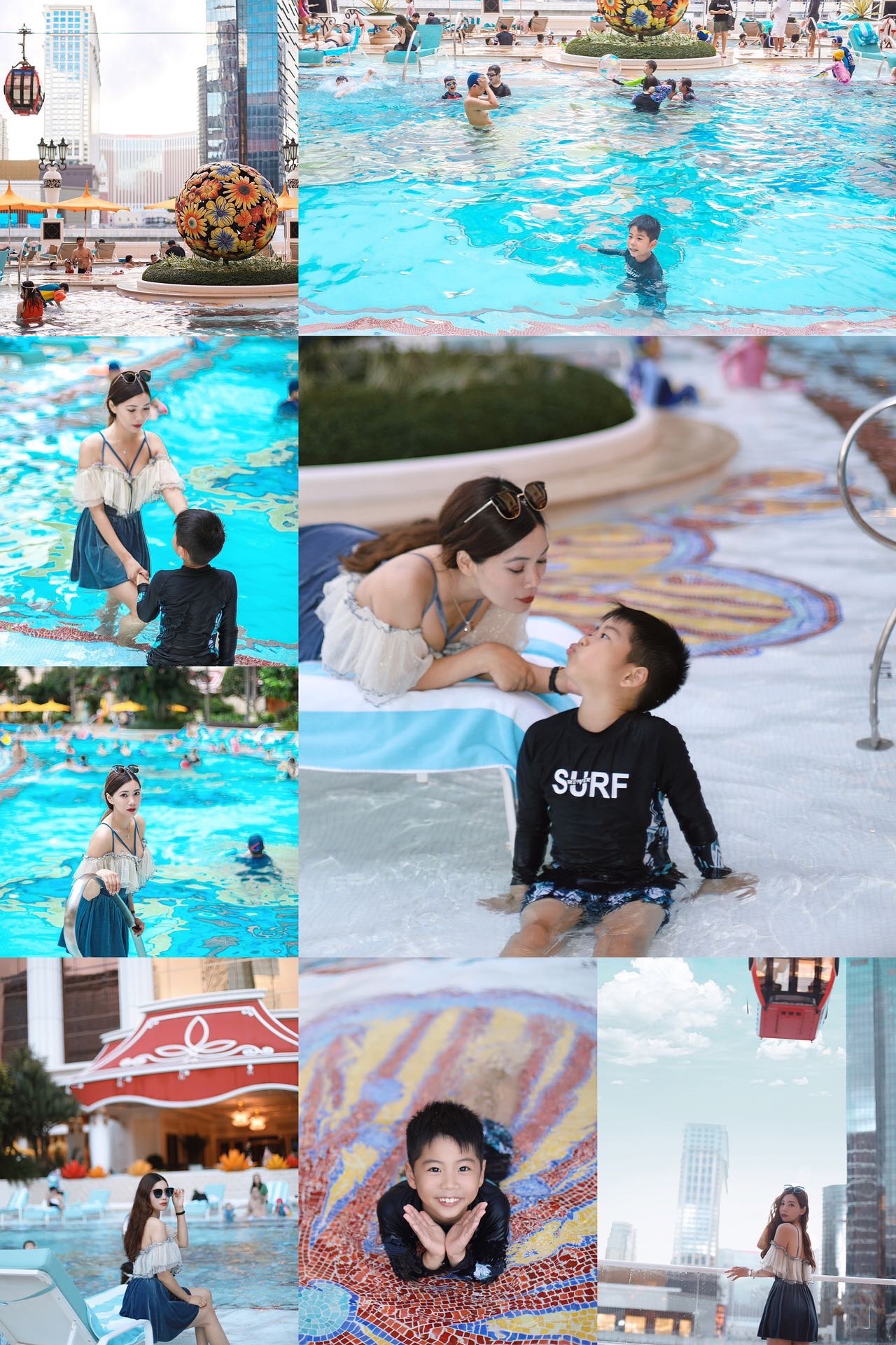 户外泳池能直接看到表演湖和缆车的美景,而且设有泳池和恒温按摩池,小肉包在这里玩到不想走。