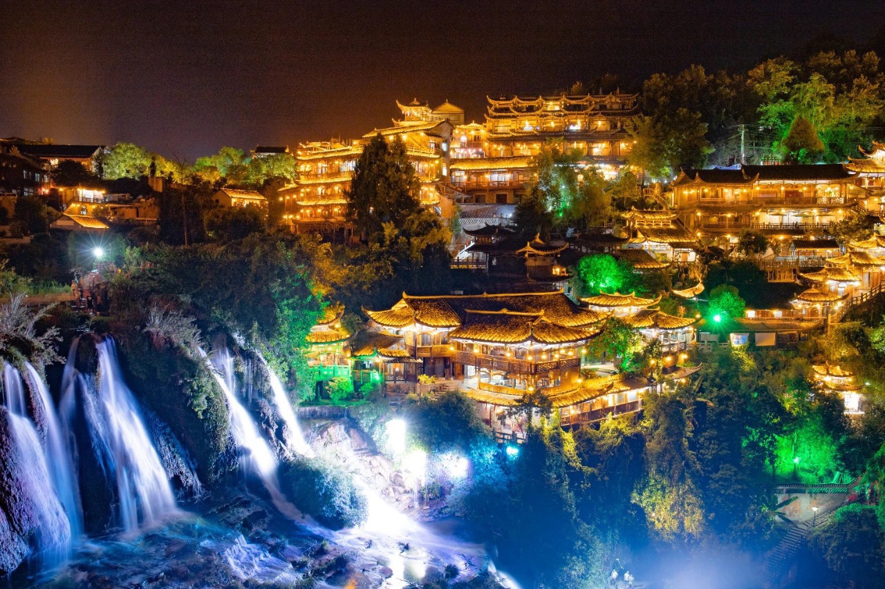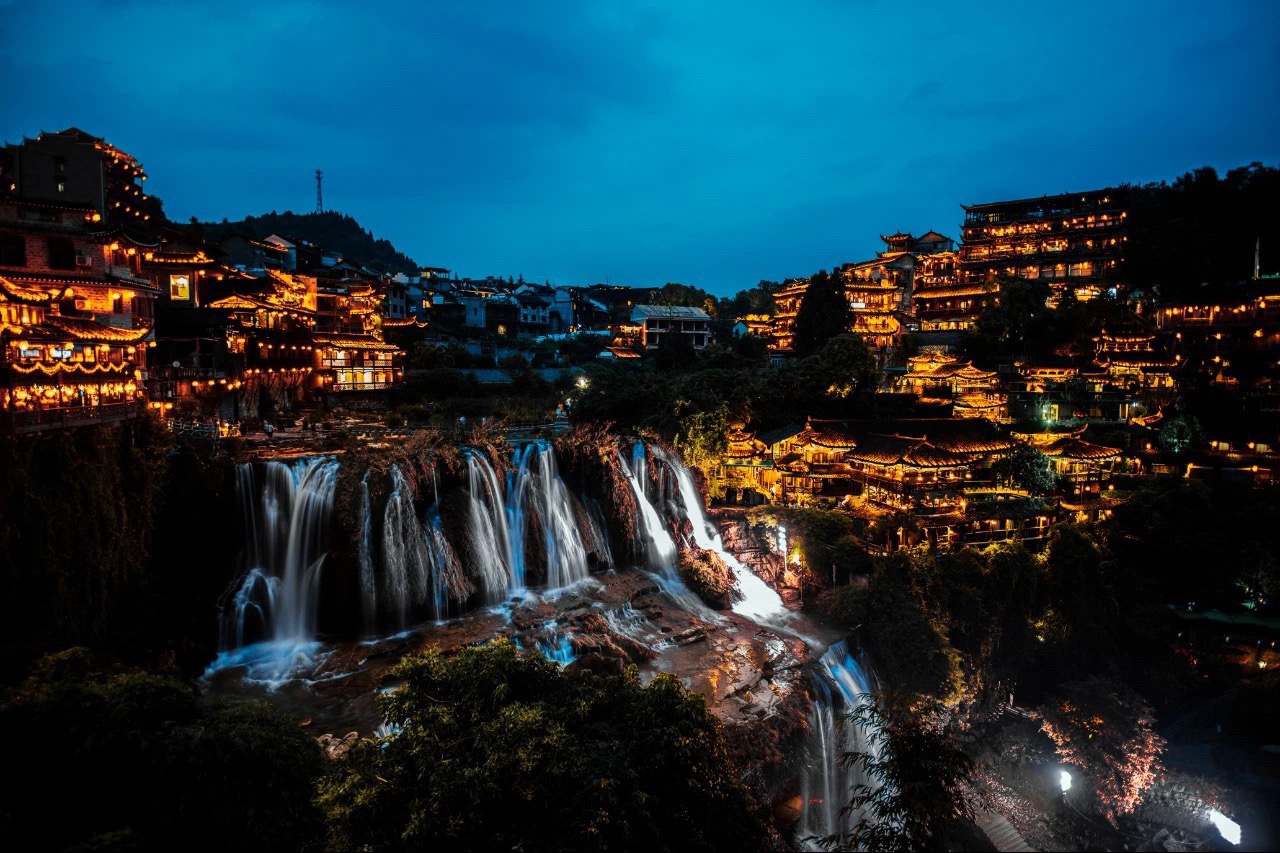 这里藏着一个现实版的《千与千寻》的世界,一到夜晚,古镇灯火依次亮起,勾勒出奇幻般的吊脚楼的轮廓,也照亮在夜色中轰鸣的瀑布。
