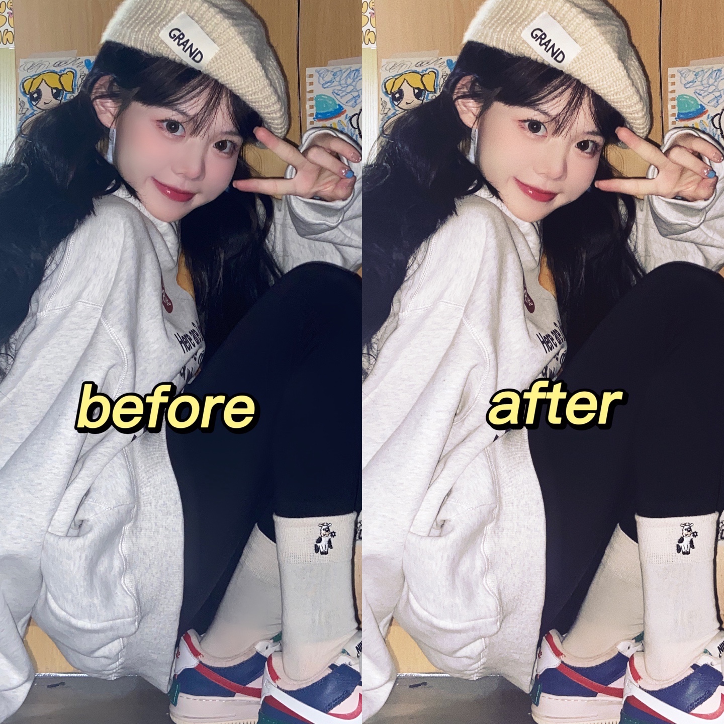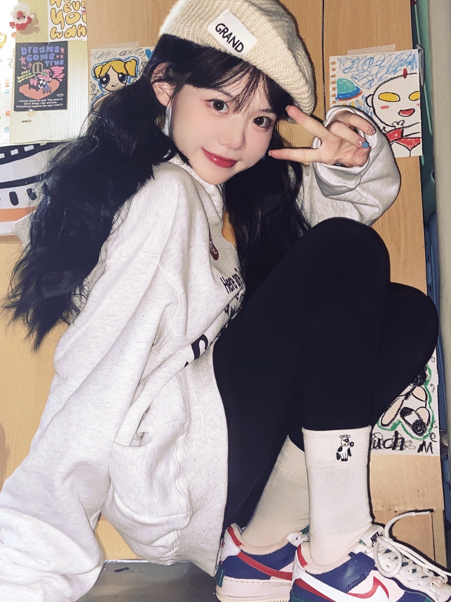旁边可以放点道具,增加氛围感,搭配和衣服相同颜色的发夹和袜子更加出片哦