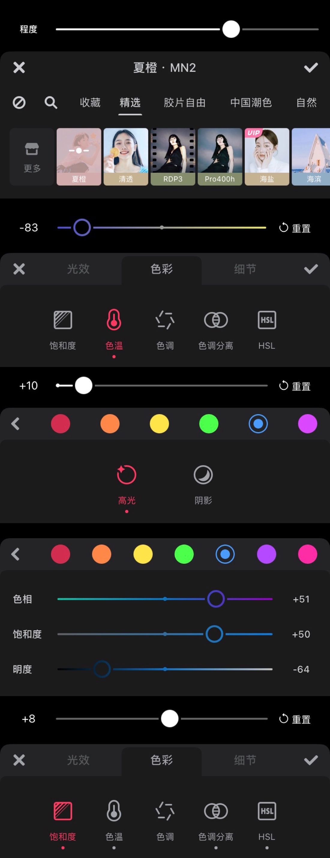 3⃣️找到调色-色彩-色温,往蓝色方向调至-83