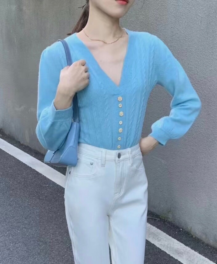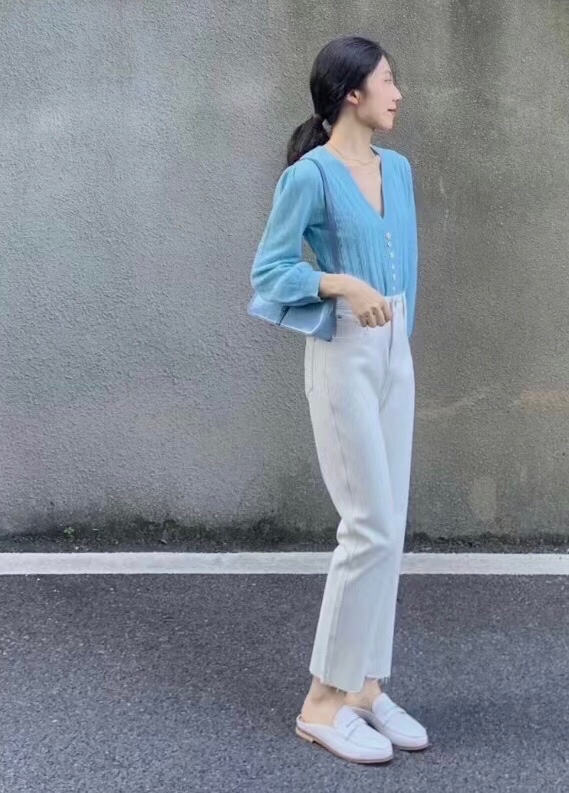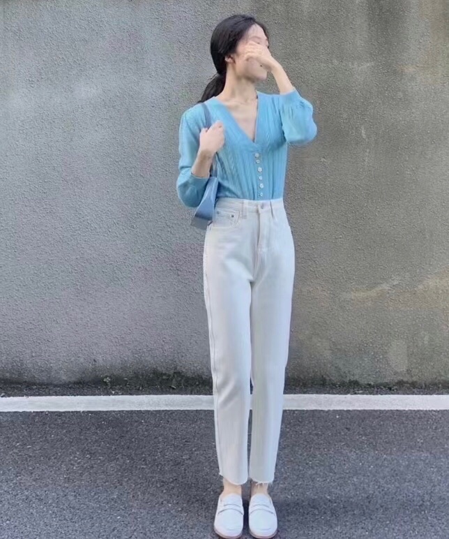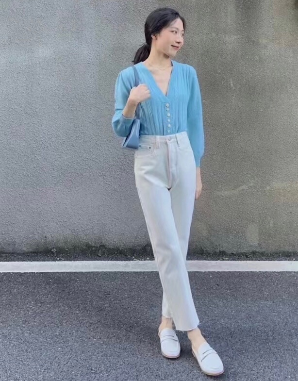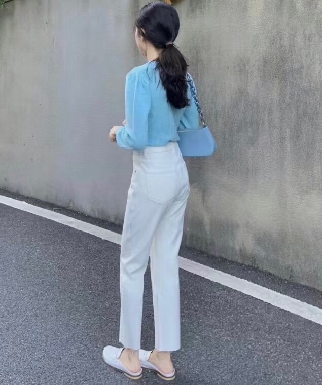 秋天就喜欢这种简单明了的搭配,白色牛仔裤搭配浅色针织上衣,想不吸睛都难。