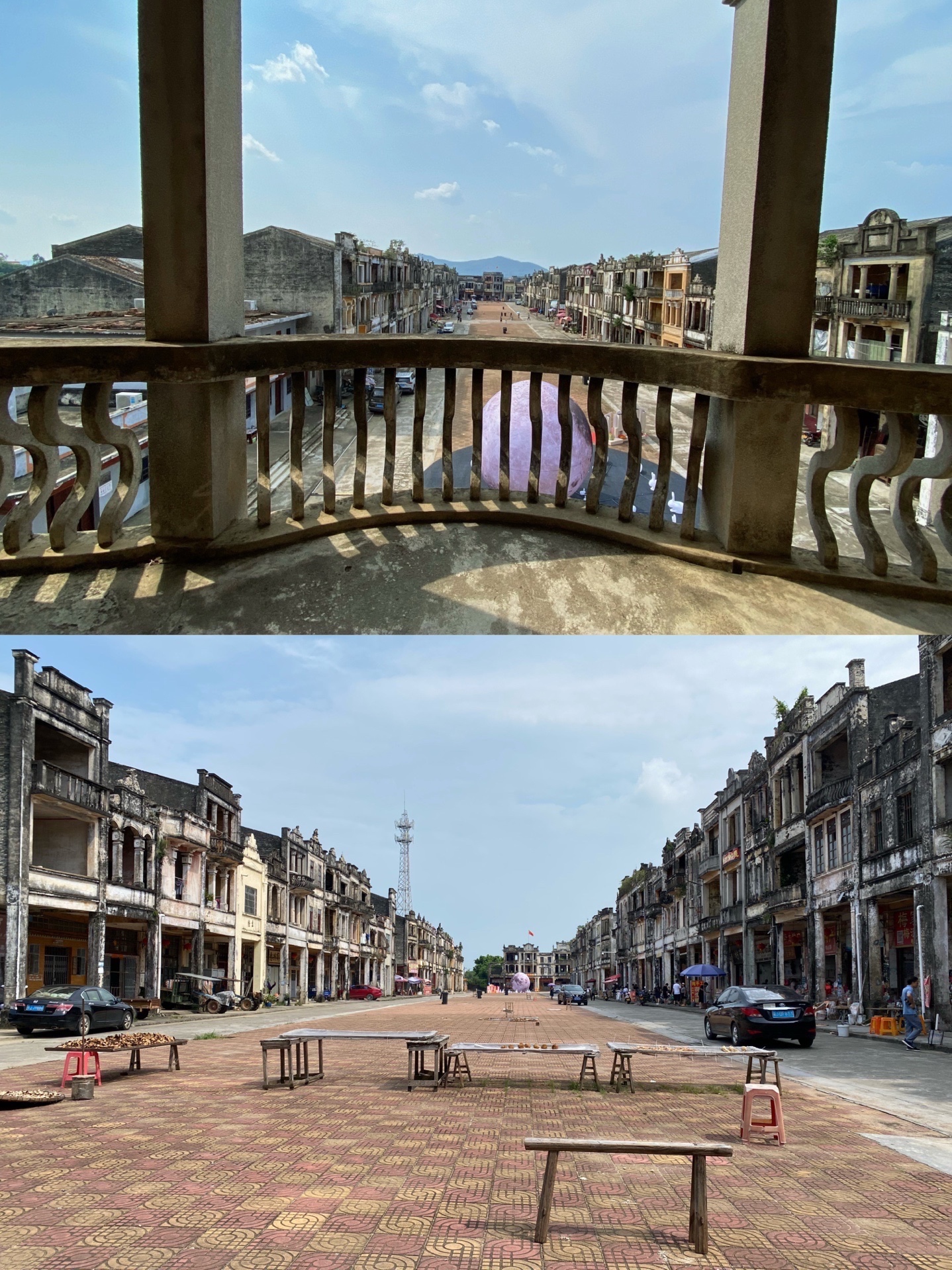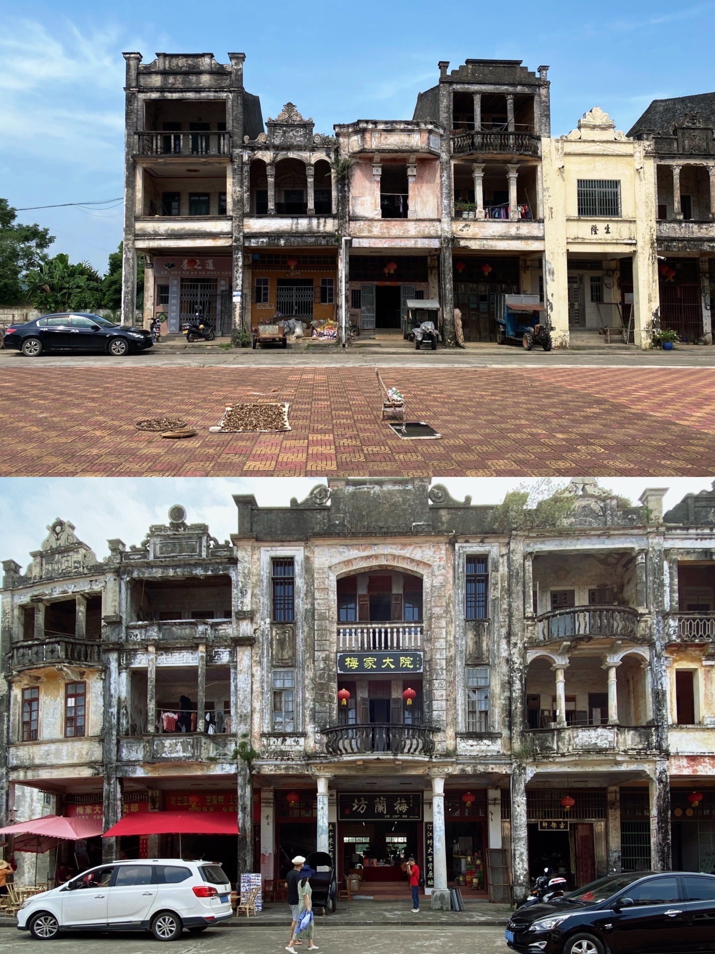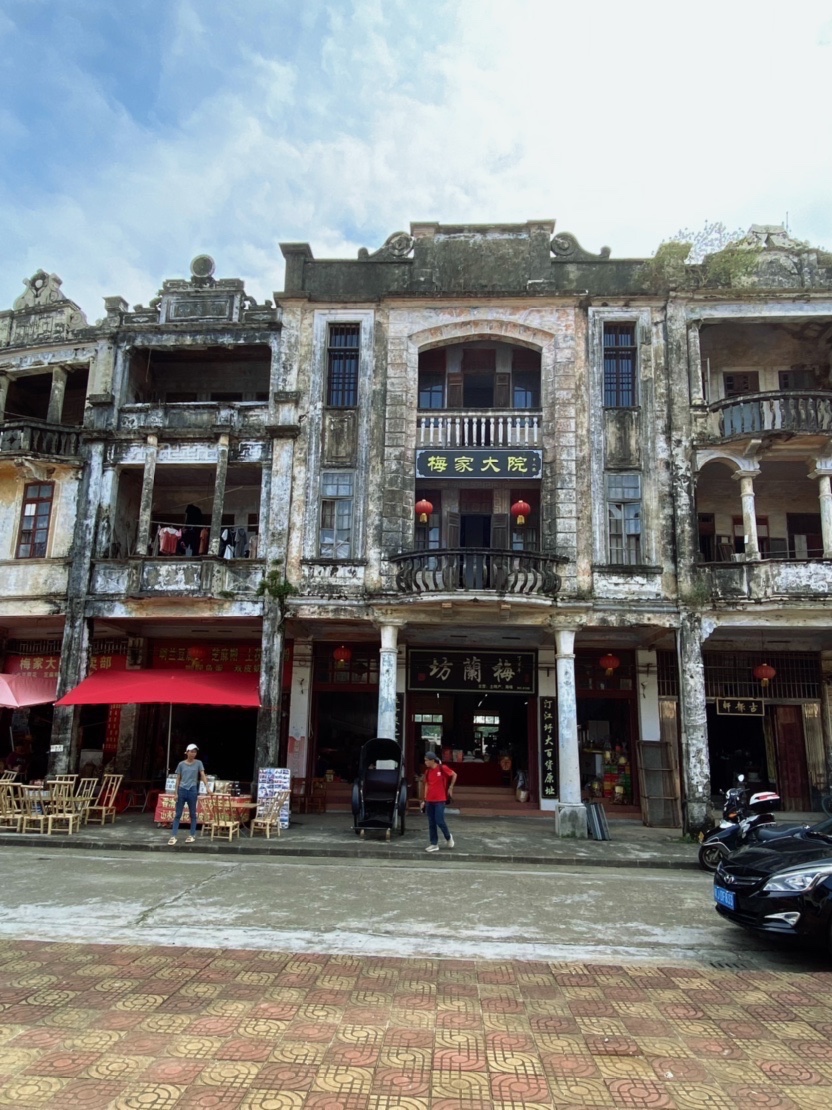 梅家大院(台山汀江圩华侨建筑群 )广阔的大院四周围着108栋骑楼的楼房保持着当年旧时代的华侨建筑文化,很壮观。历经过了近百年的风雨侵蚀,饱经沧桑,但原貌都保留较为完整。
