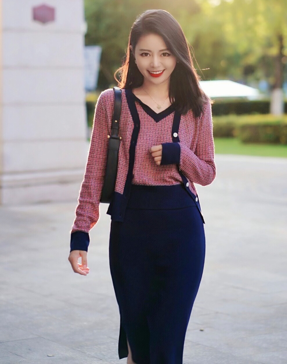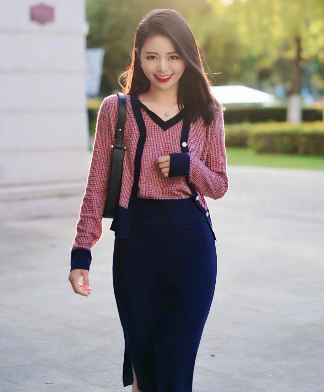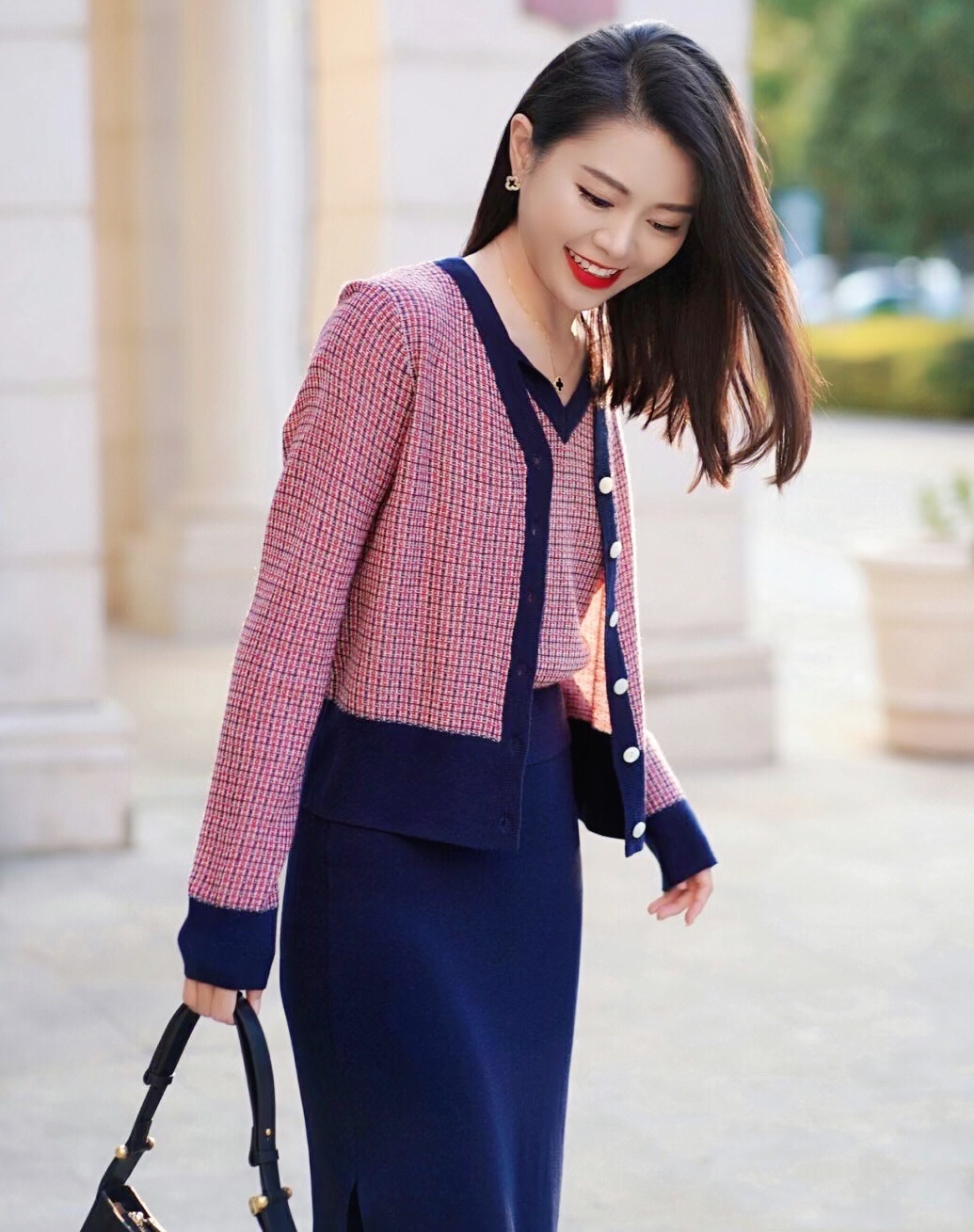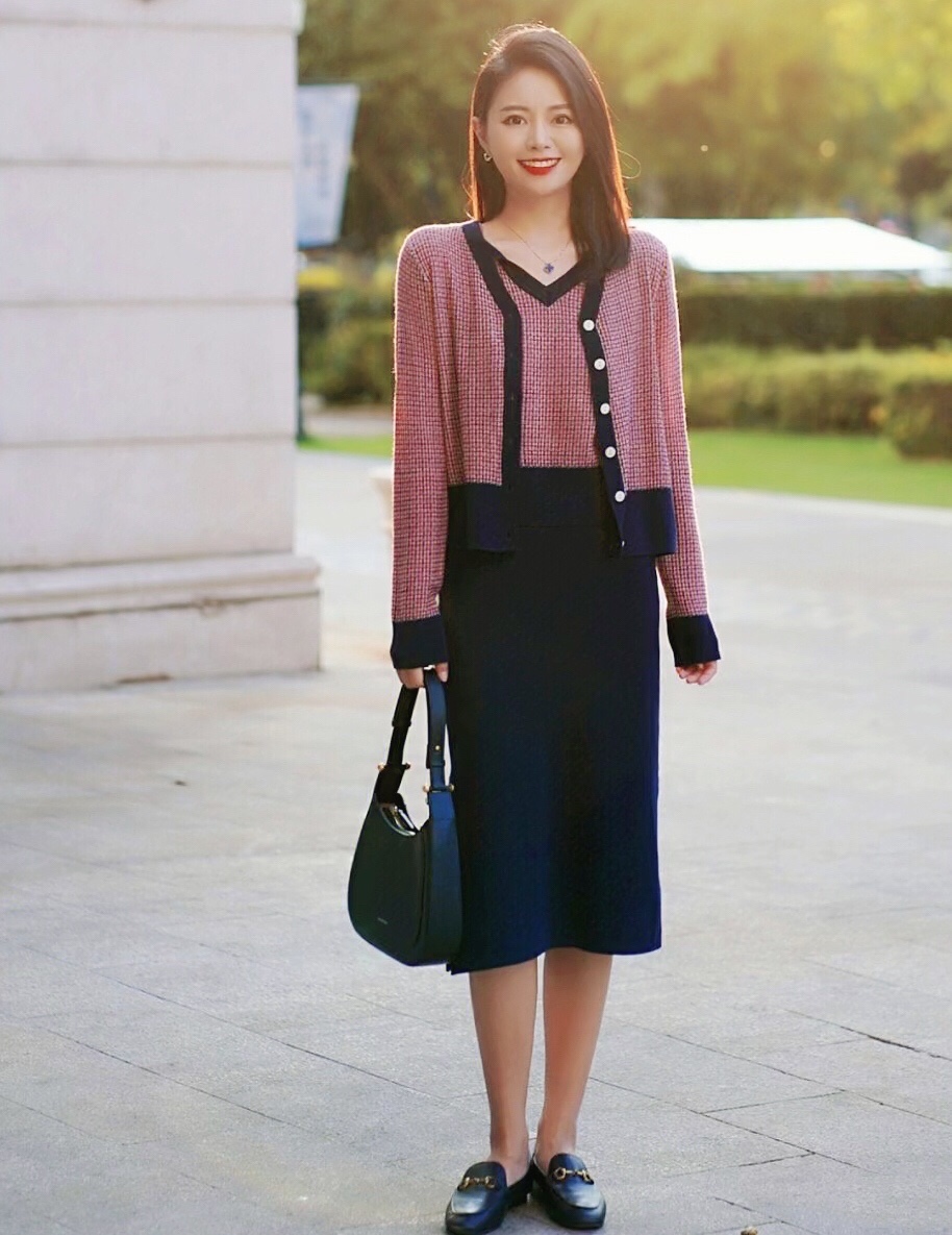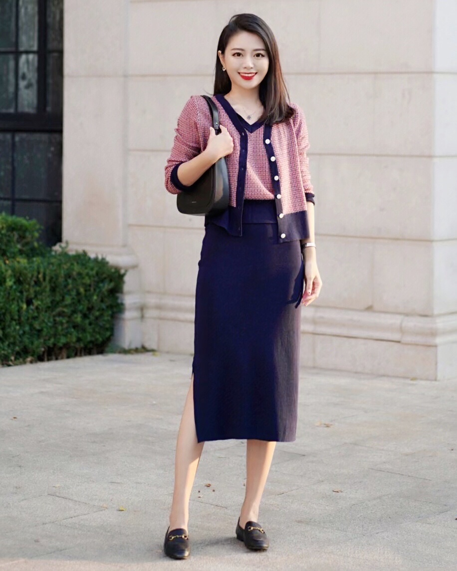 紫红色针织开衫搭配开叉半身裙,复古知性又优雅,两件叠穿,自古红蓝出CP。