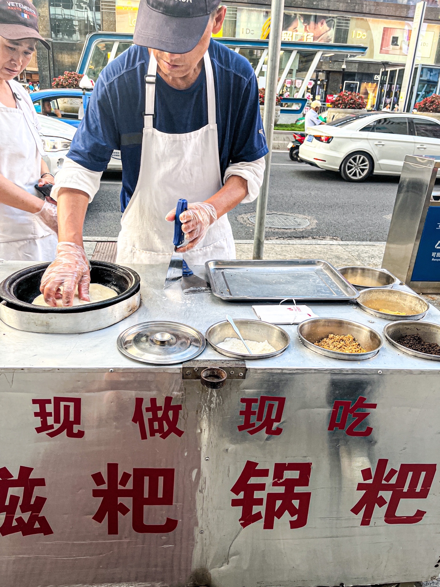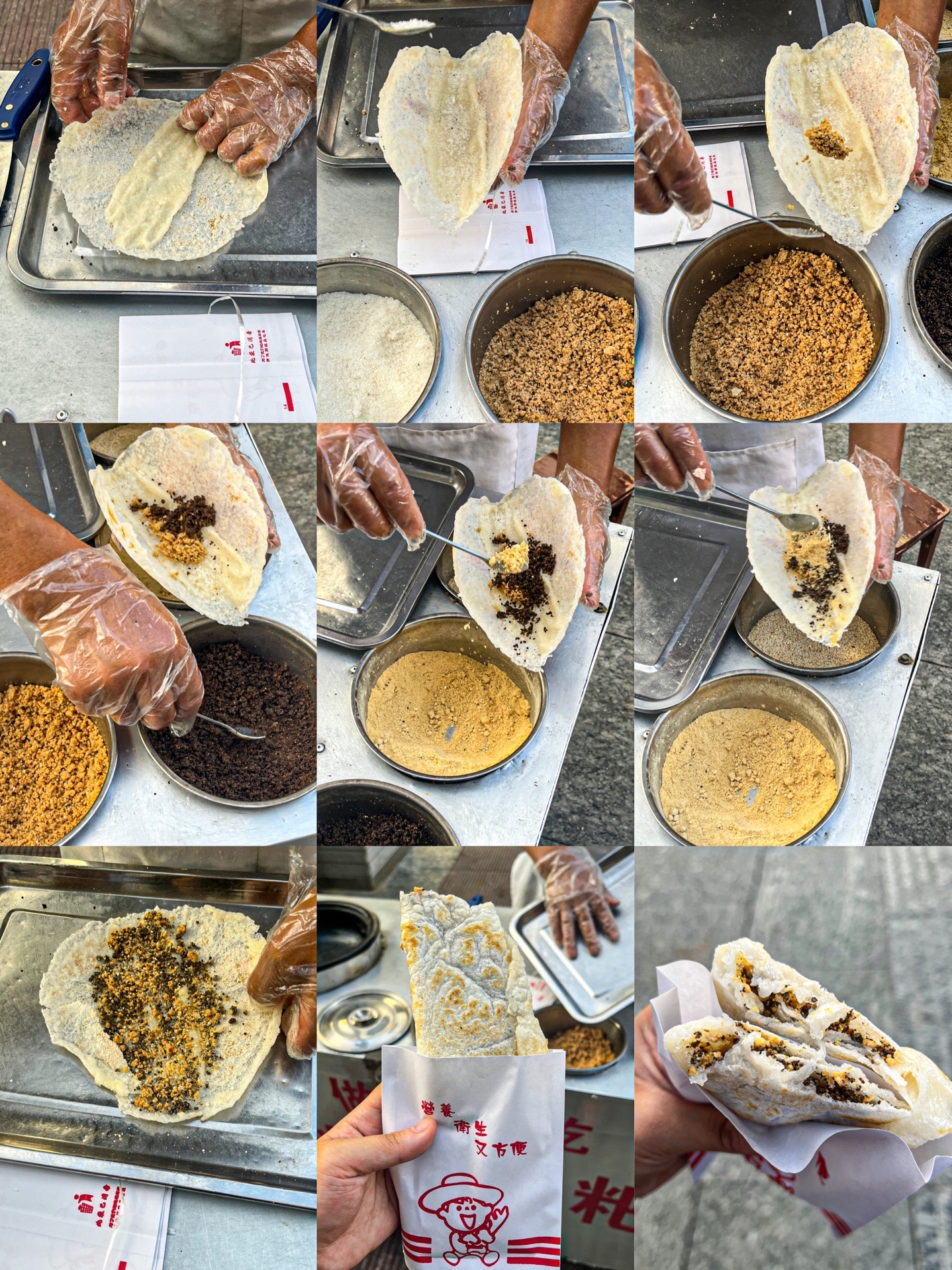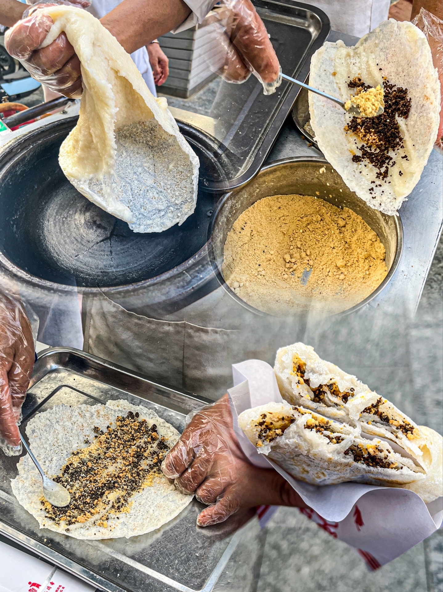 在贵阳的街头,去地铁站的路上,碰到一个大叔在卖糍粑锅巴,看着好有意思,糍粑拉的老长了,然后烙一个薄薄的饼,裹上些糍粑、里面加上些白糖、花生、引子、酥麻、黄豆、芝麻,最后把饼叠起来。