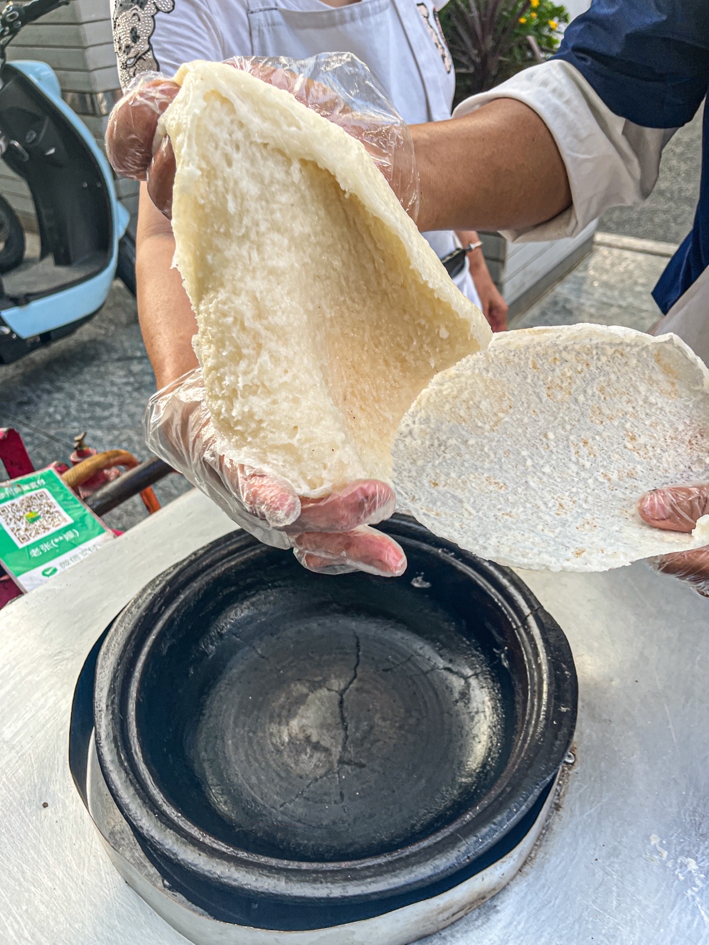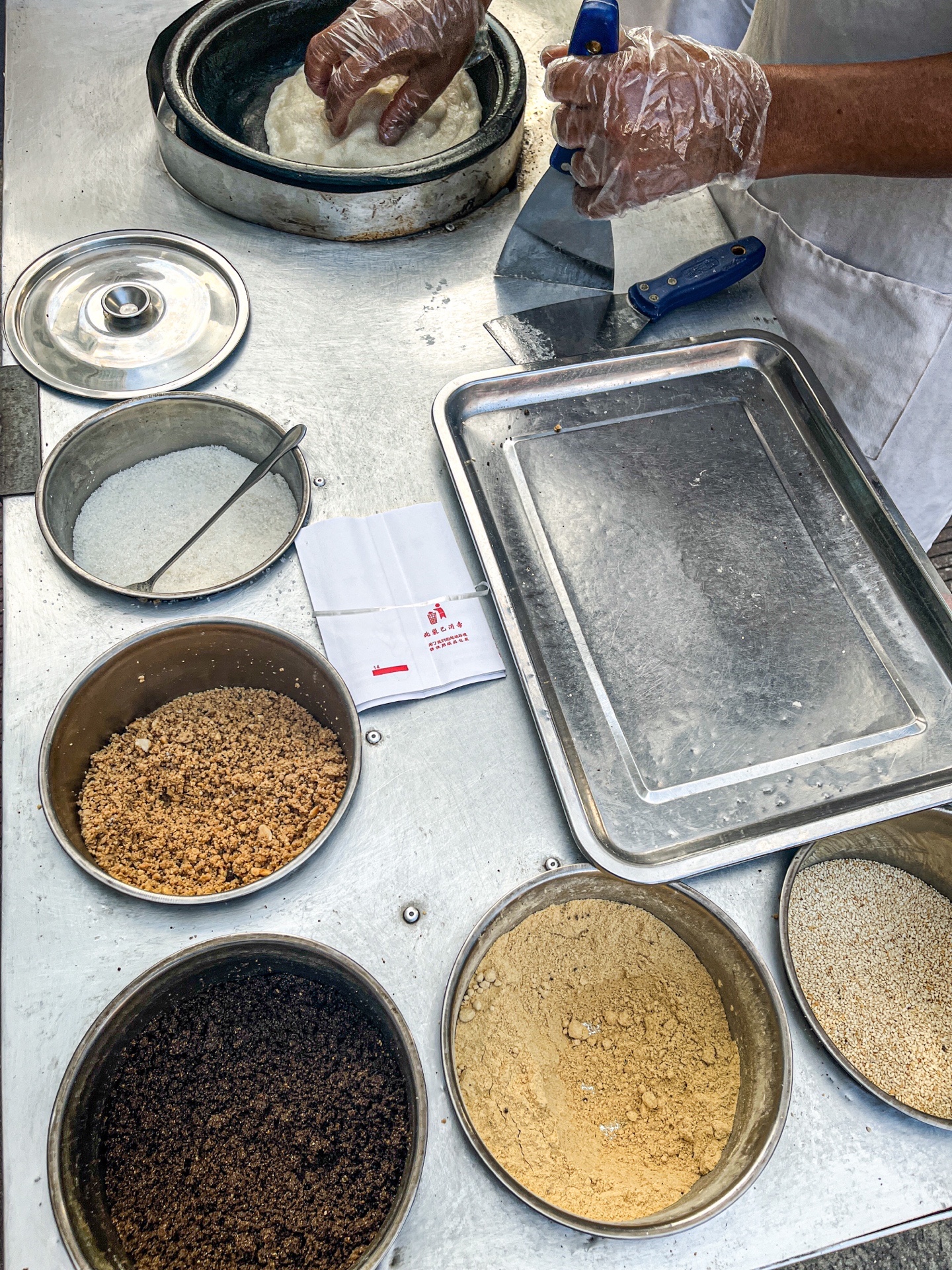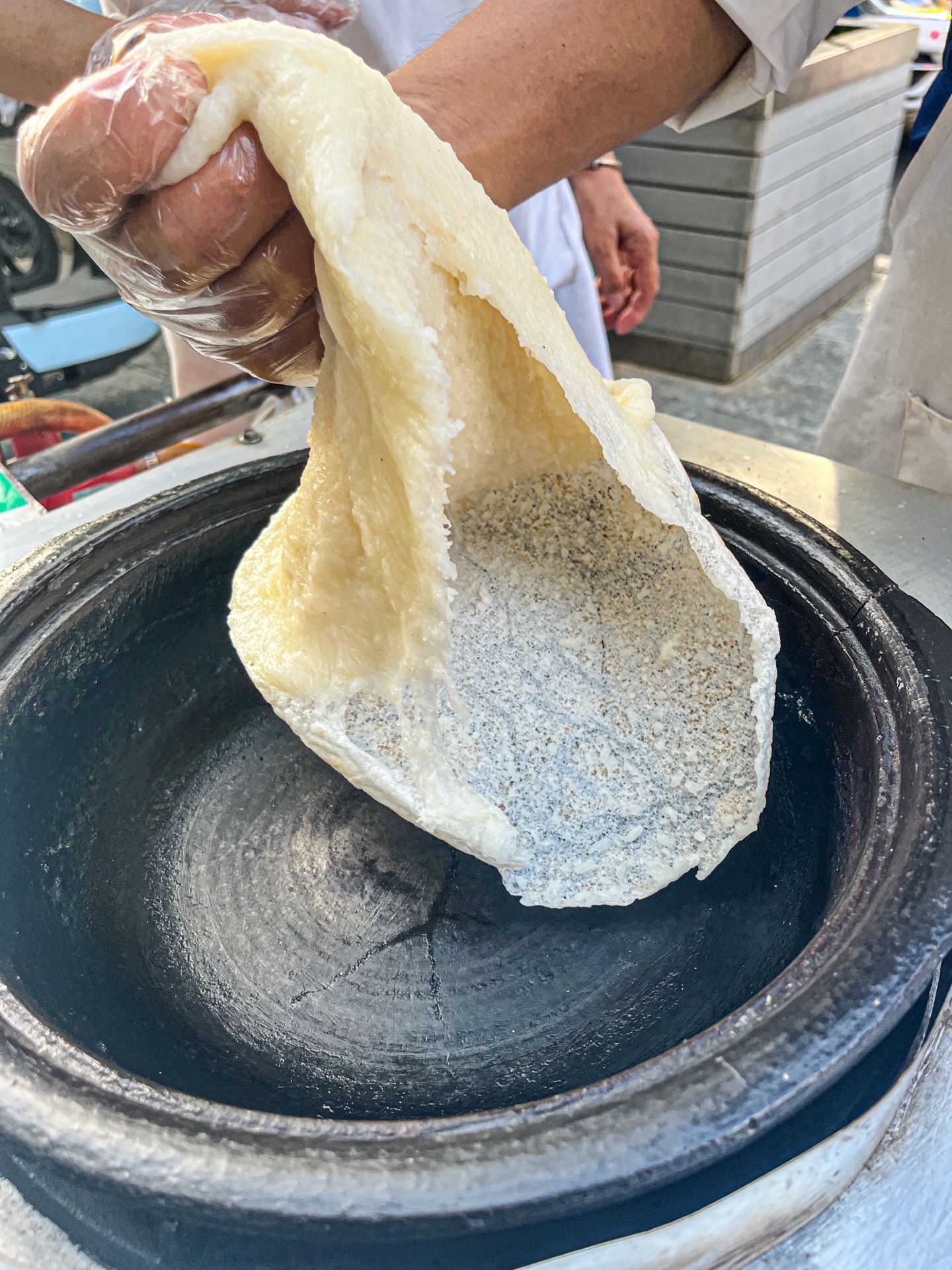 在贵阳的街头,去地铁站的路上,碰到一个大叔在卖糍粑锅巴,看着好有意思,糍粑拉的老长了,然后烙一个薄薄的饼,裹上些糍粑、里面加上些白糖、花生、引子、酥麻、黄豆、芝麻,最后把饼叠起来。