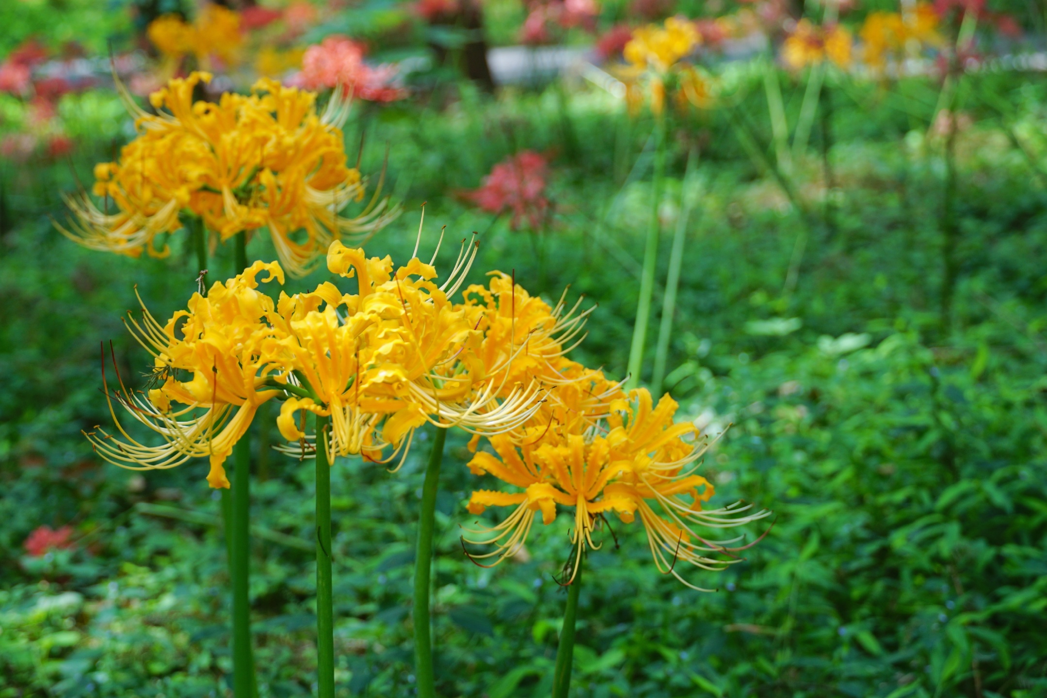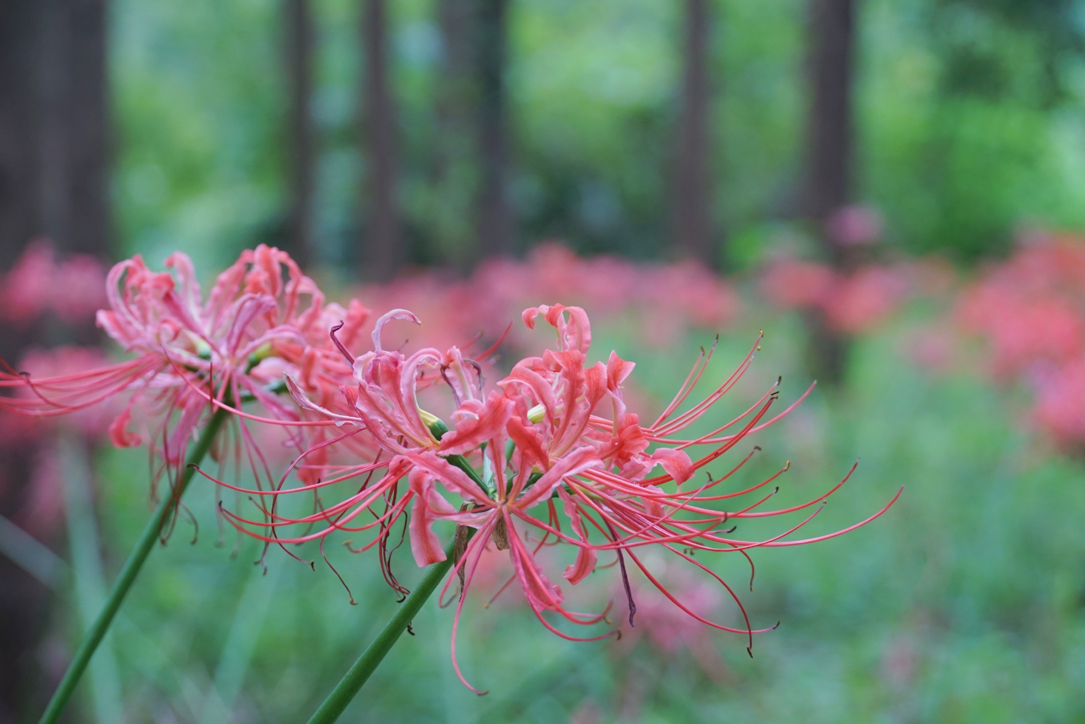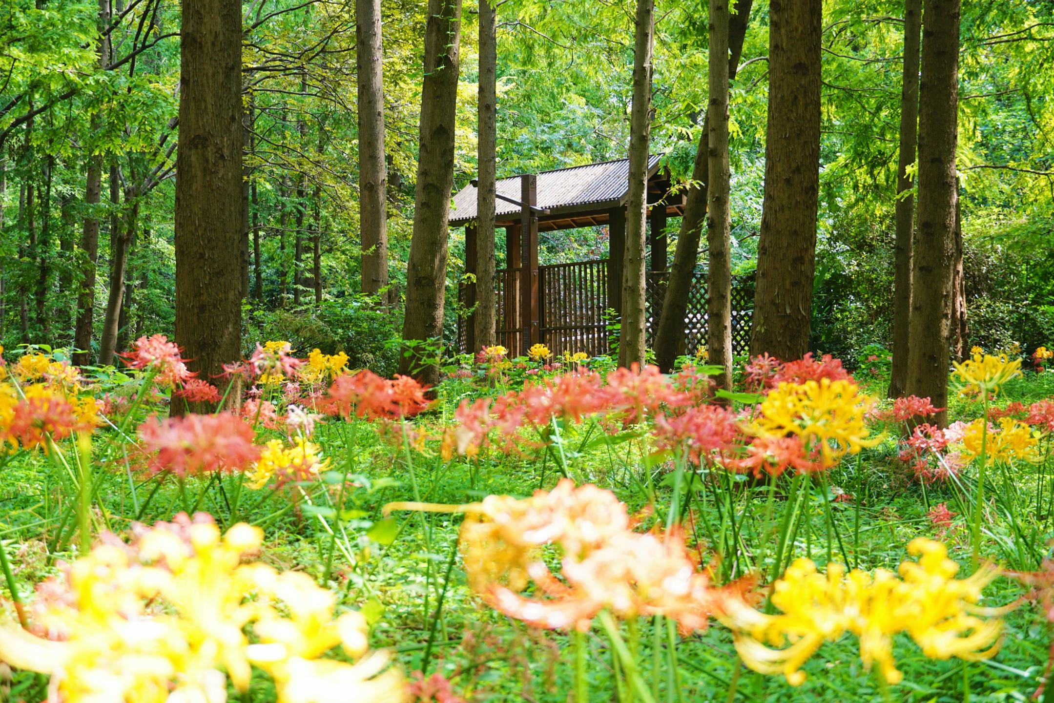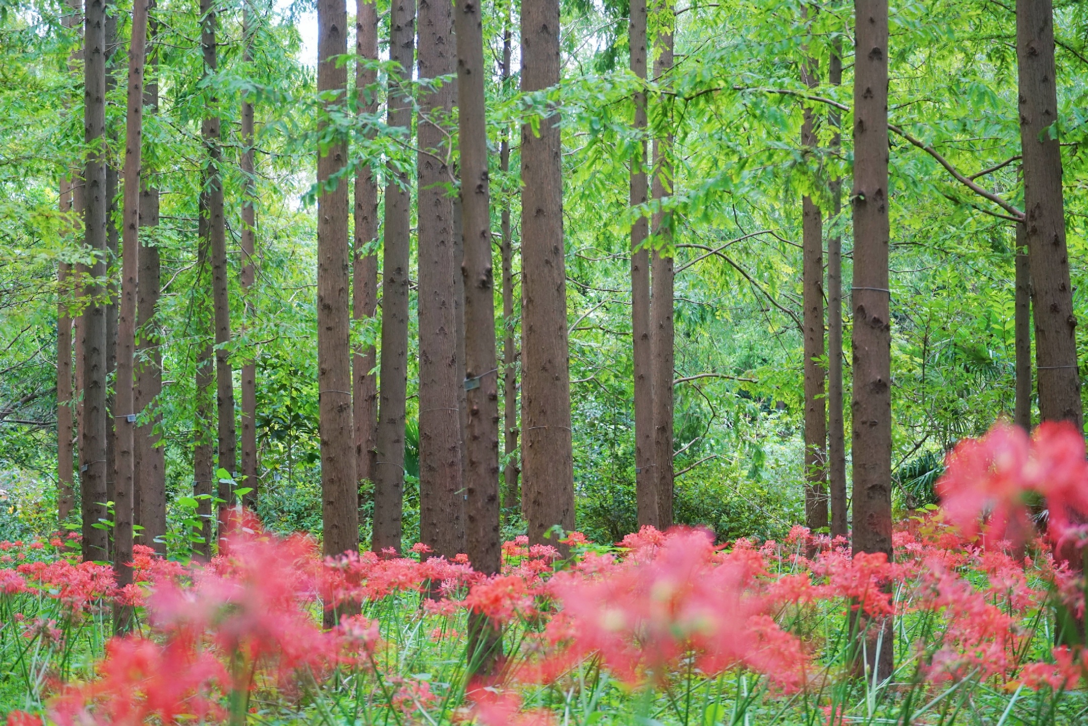 森林里成片的彼岸花、红色的、黄色的、粉色的、白色的…在穿过高高的大树顶洒下的阳光里,静静的娇媚的绽放着…