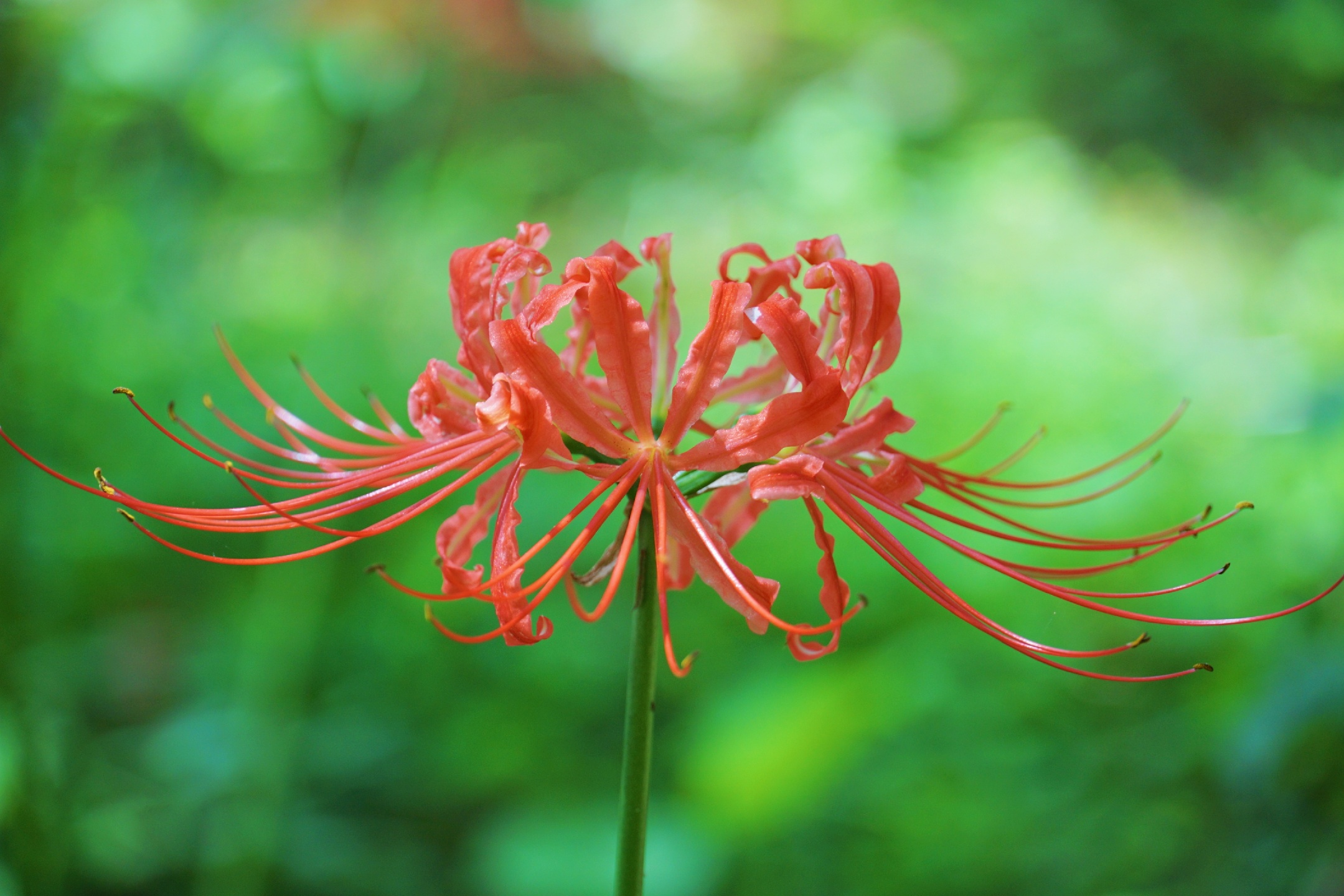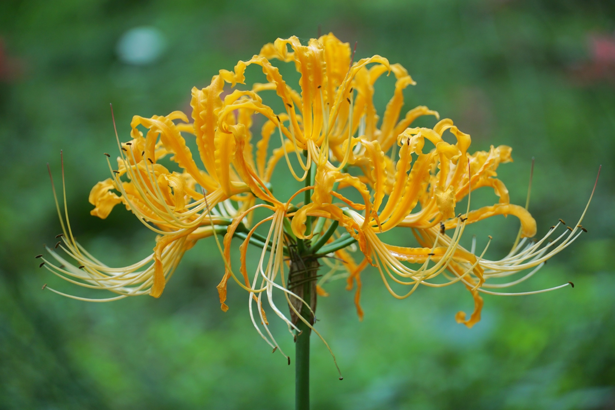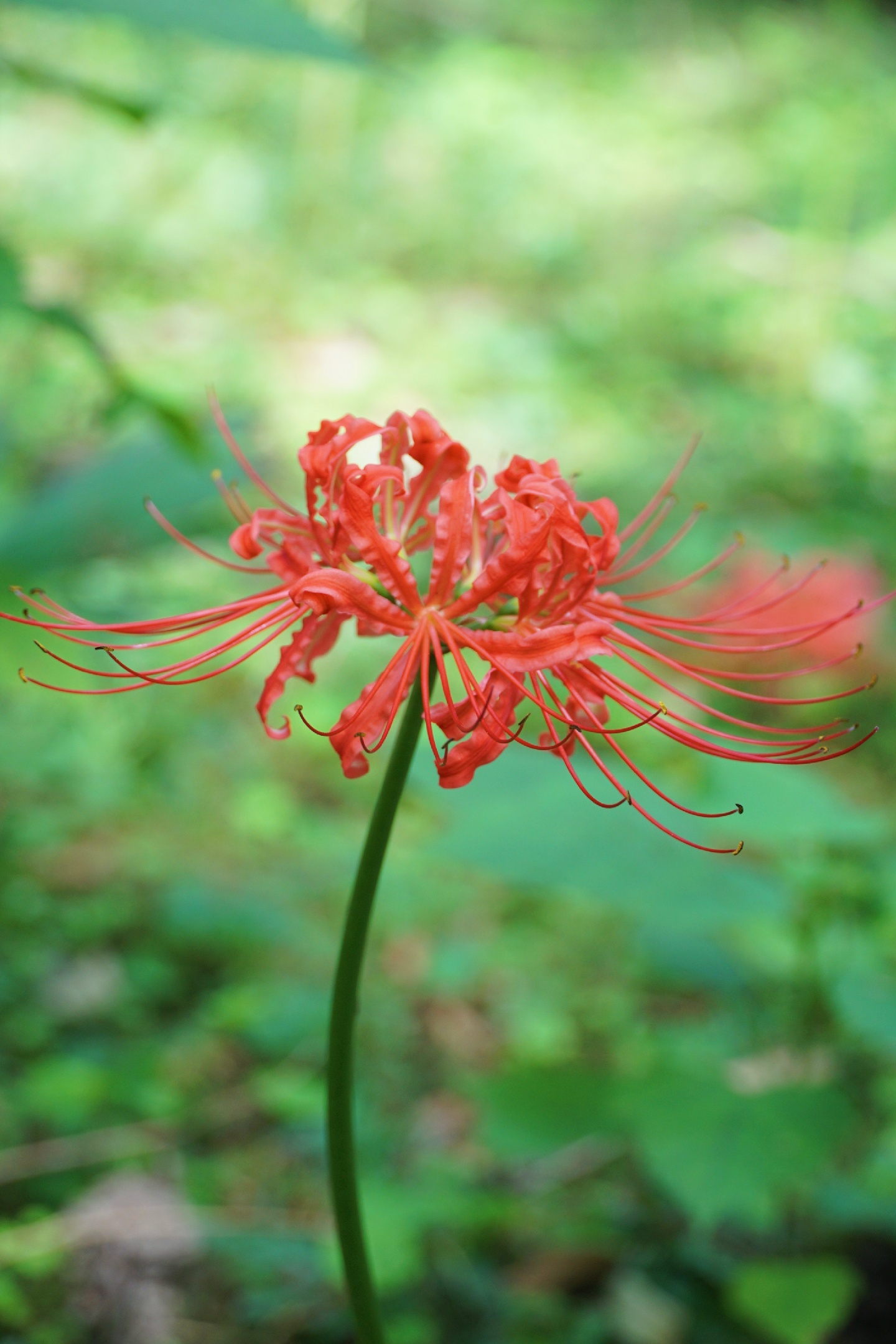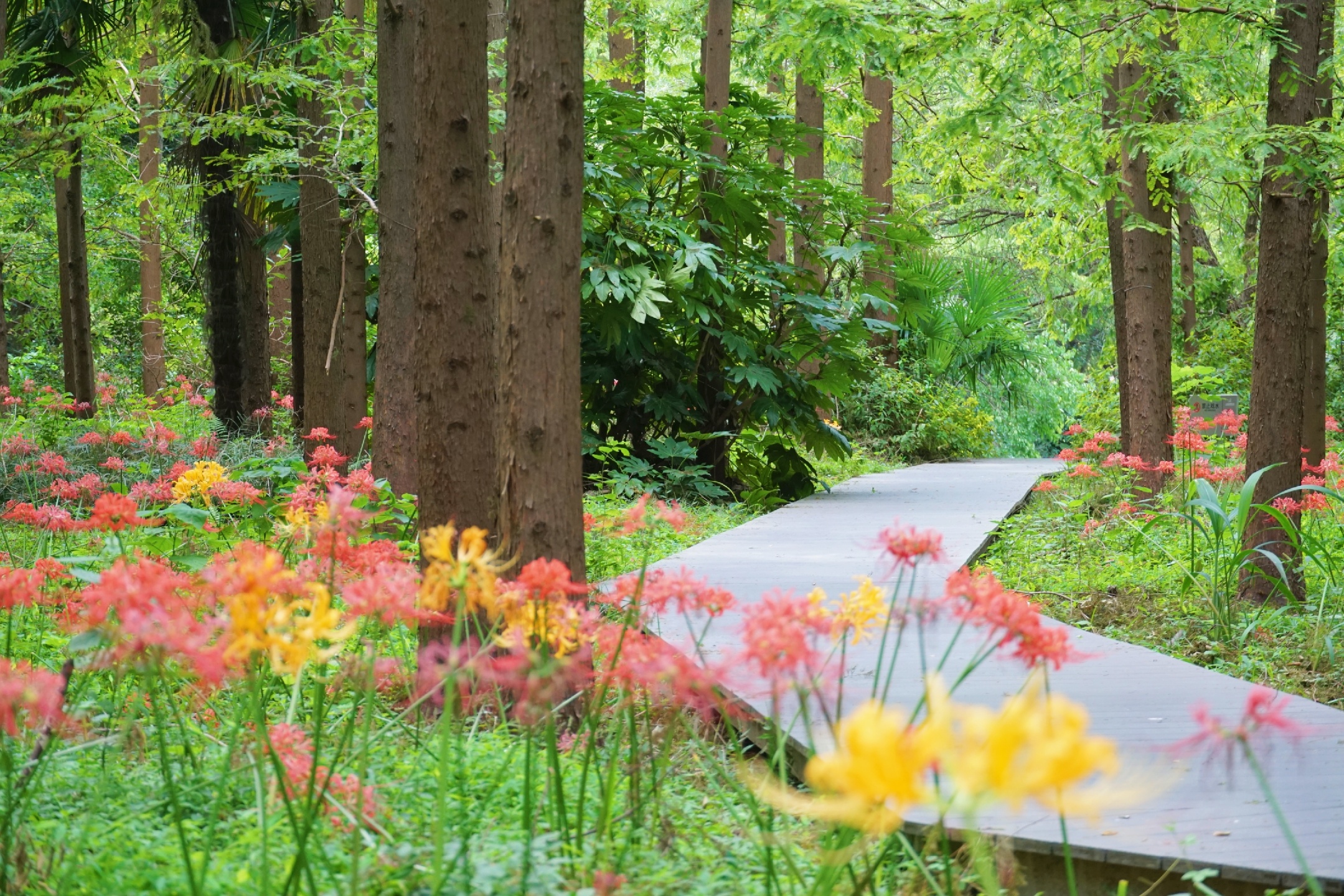 森林里成片的彼岸花、红色的、黄色的、粉色的、白色的…在穿过高高的大树顶洒下的阳光里,静静的娇媚的绽放着…
