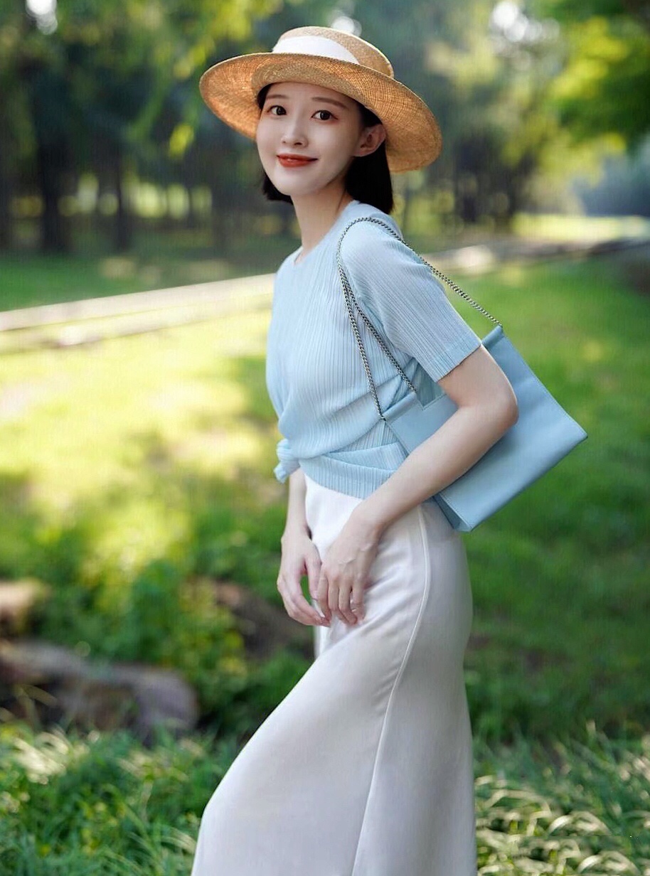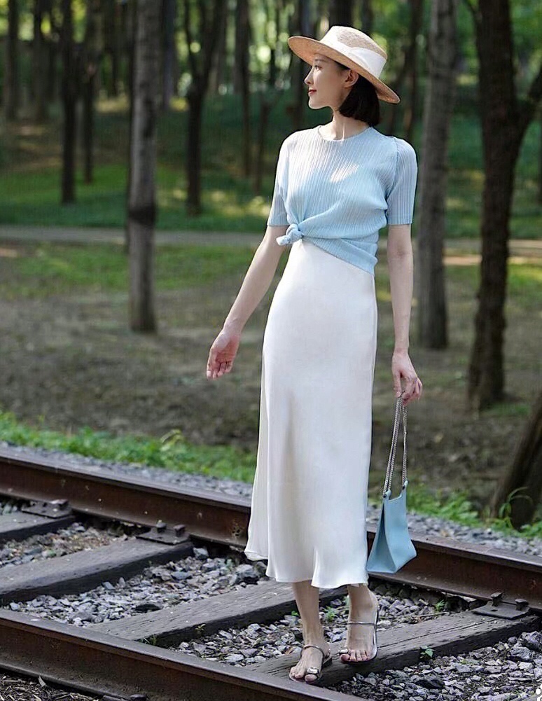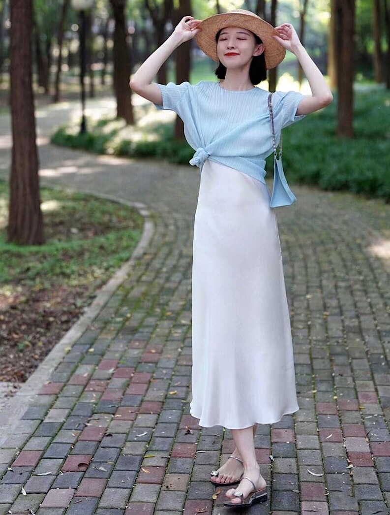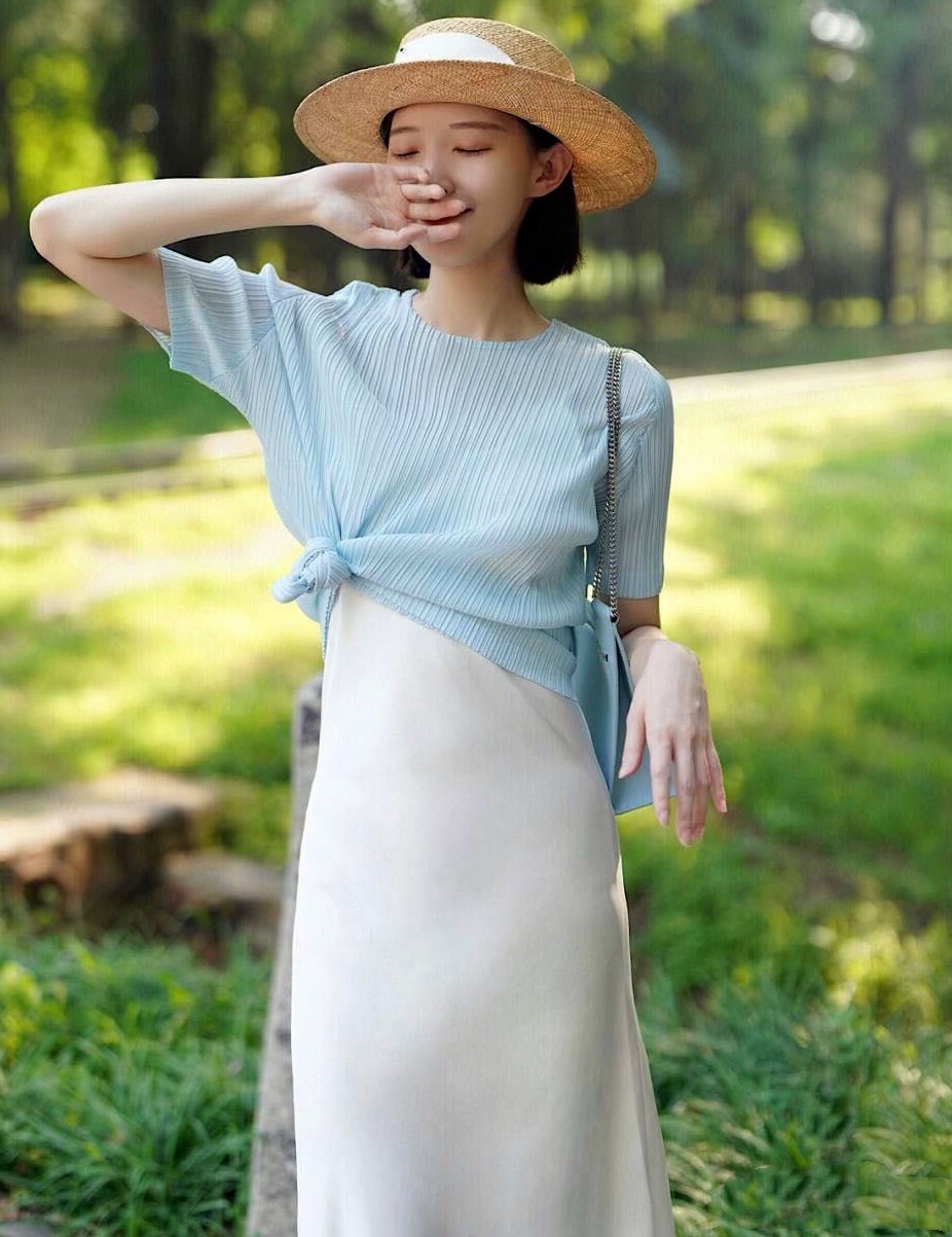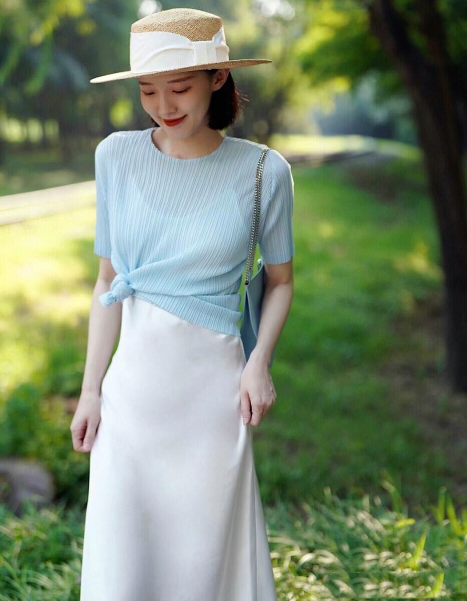 浅蓝色的半袖雪纺衫,穿搭舒服又没有身型的约束。搭配白色高腰半身裙,大方优雅又显气质的早秋时尚,通勤休闲风十足。