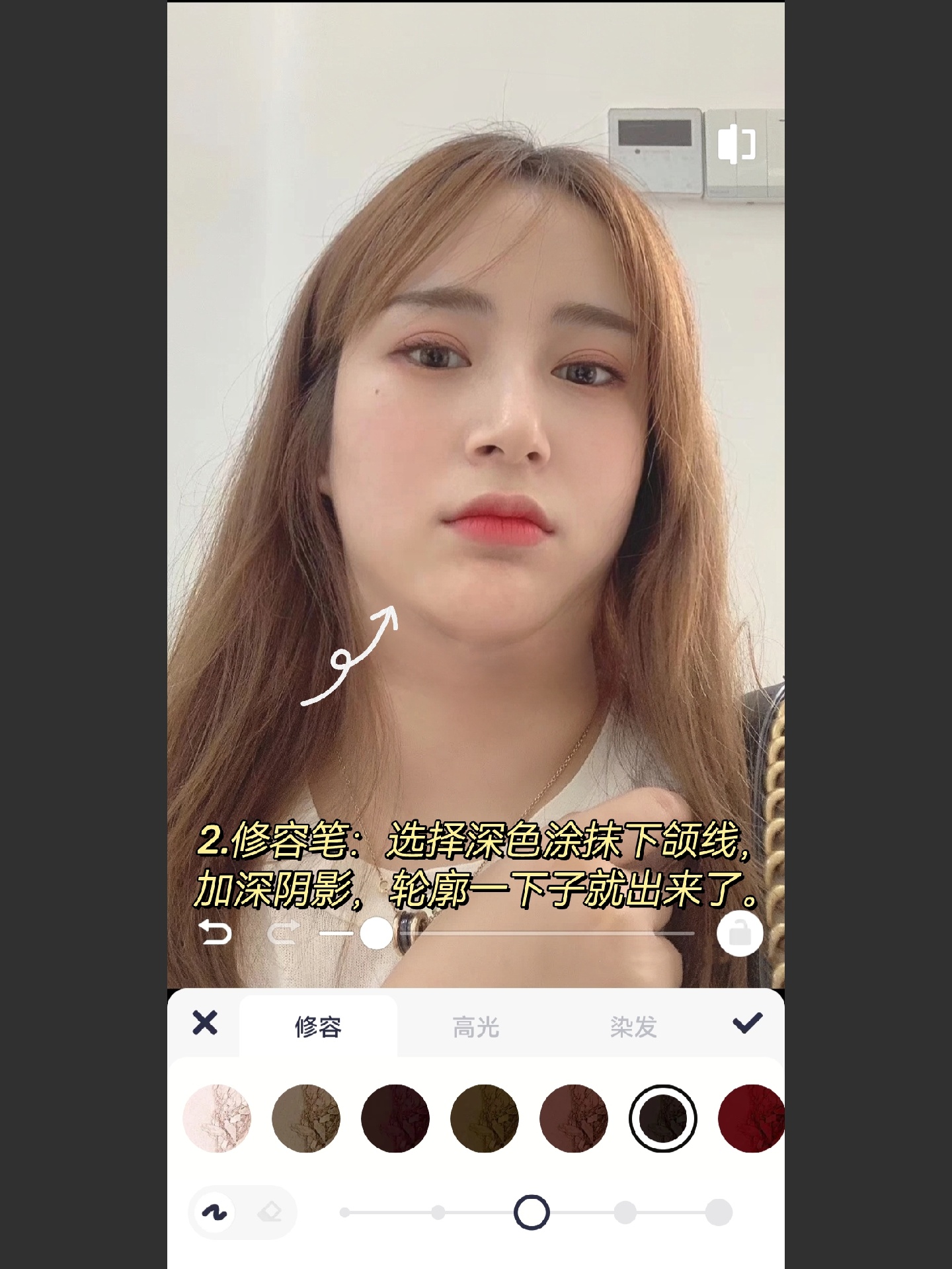 选择深色涂抹下颌线,加深阴影,轮廓一下子就出来了。