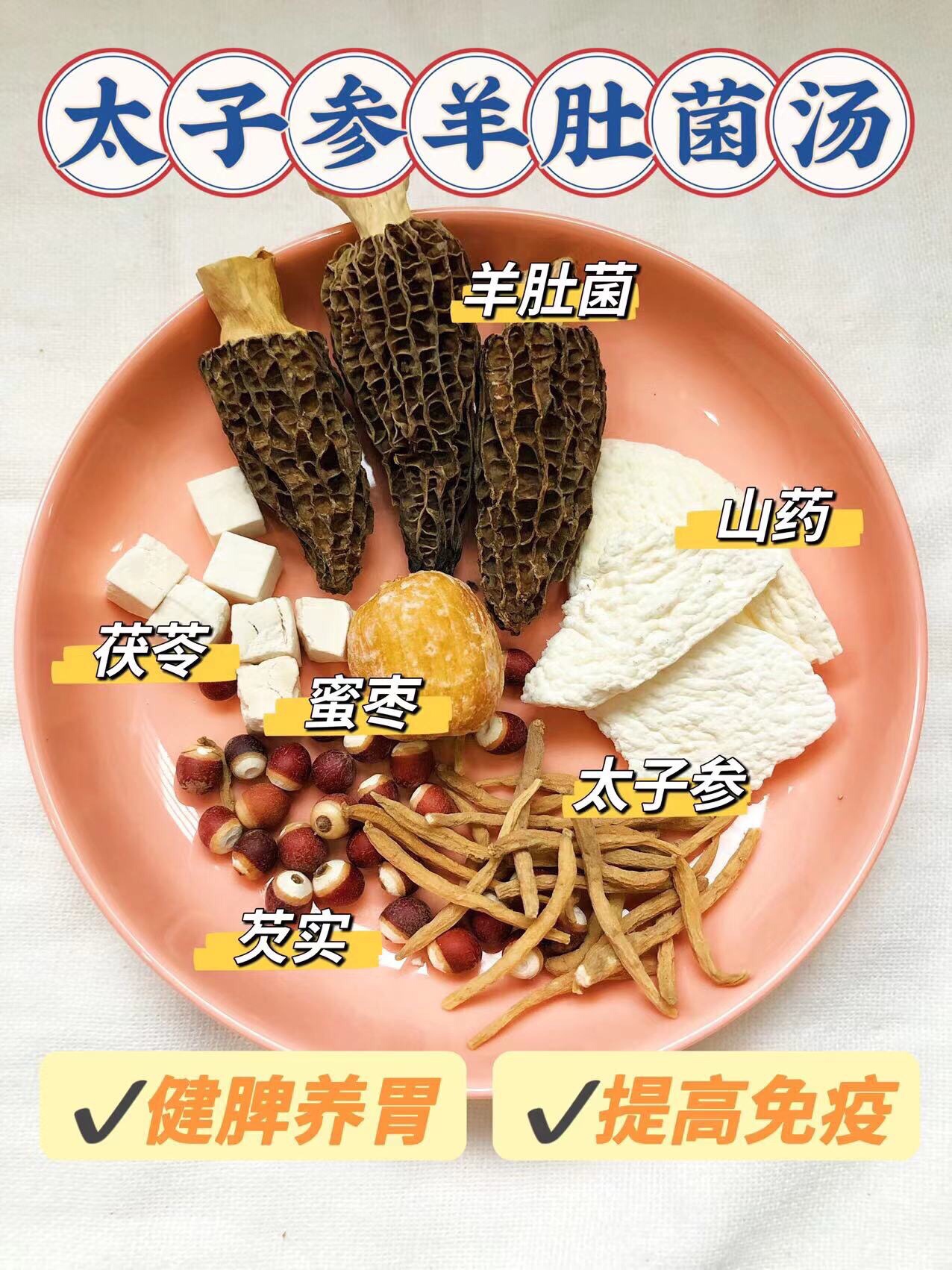 🌈材料:羊肚菌、太子叁、芡实、淮山片、茯苓、蜜枣