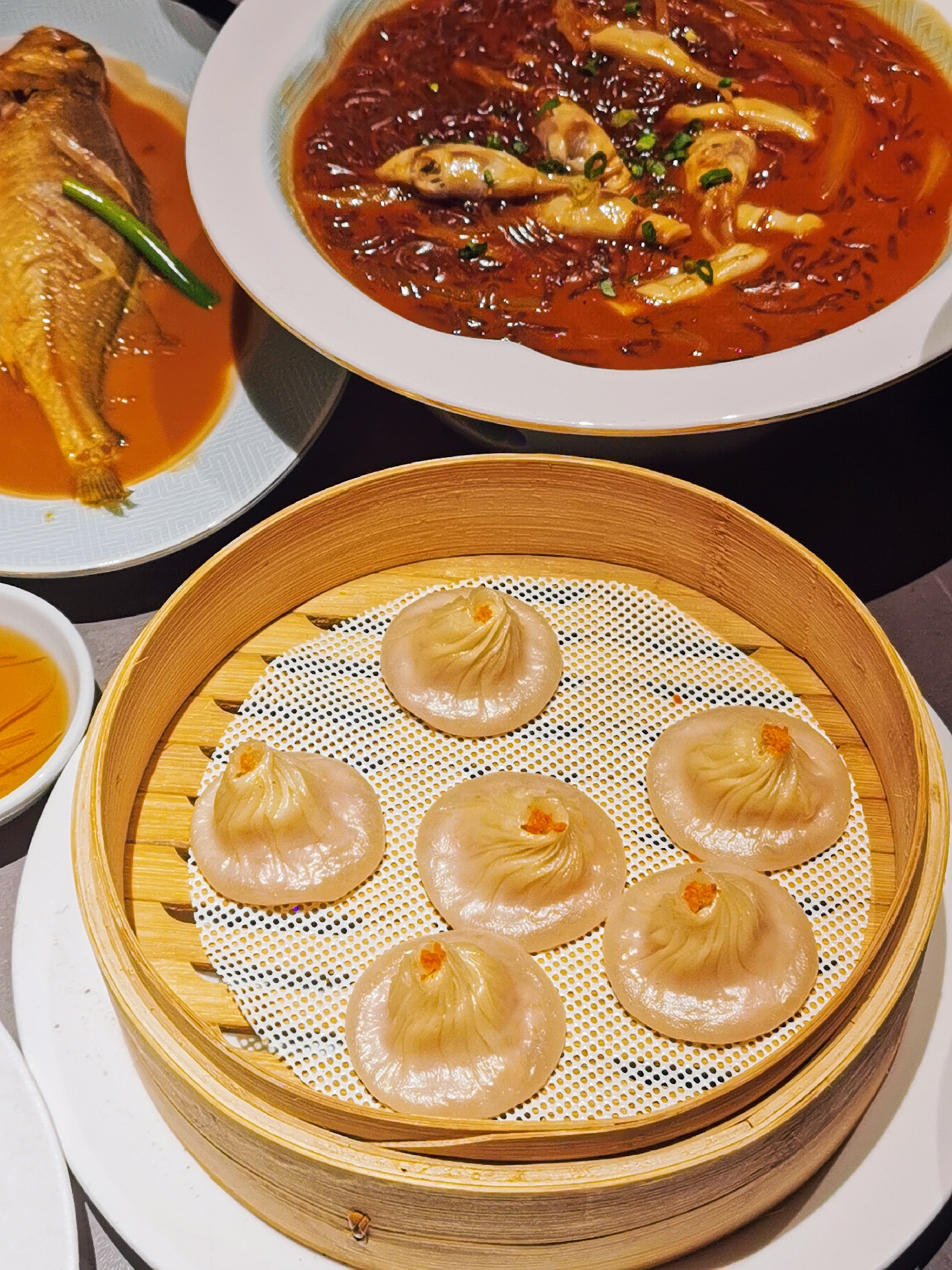 这小笼包可以说本帮菜必点之一了,一笼里🈶六个,端上来的时候热腾腾搭配料水,汤汁鲜亮,口感美味~