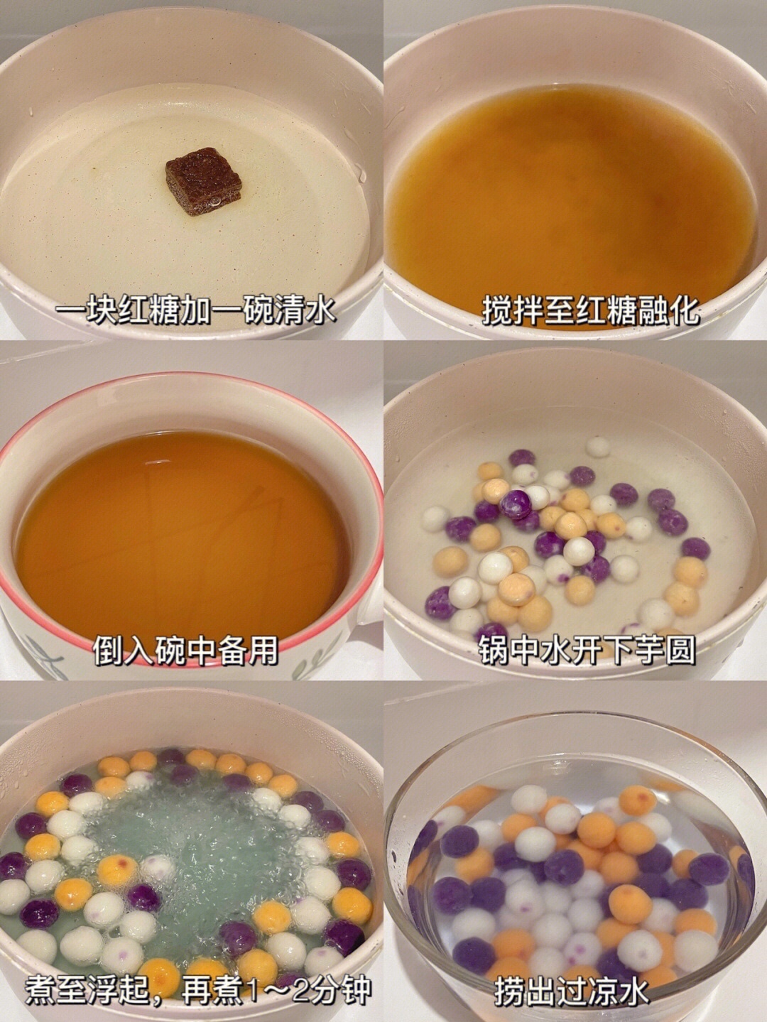 2、锅中水开下芋圆,煮至芋圆浮起,再煮1-2分钟,捞出过凉水备用。