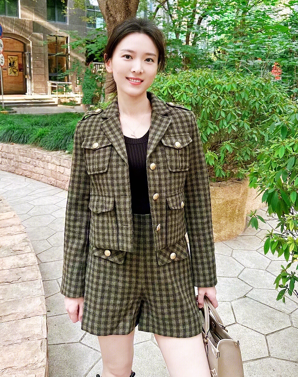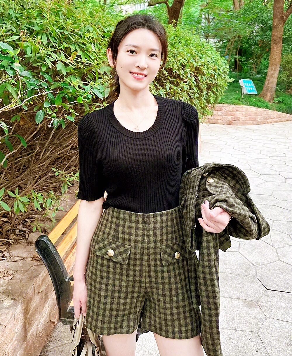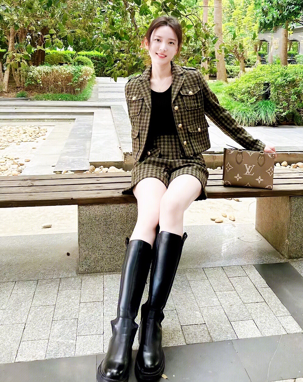 小香风套装搭配黑色针织衫,穿搭一双黑色高筒靴,魅力十足。