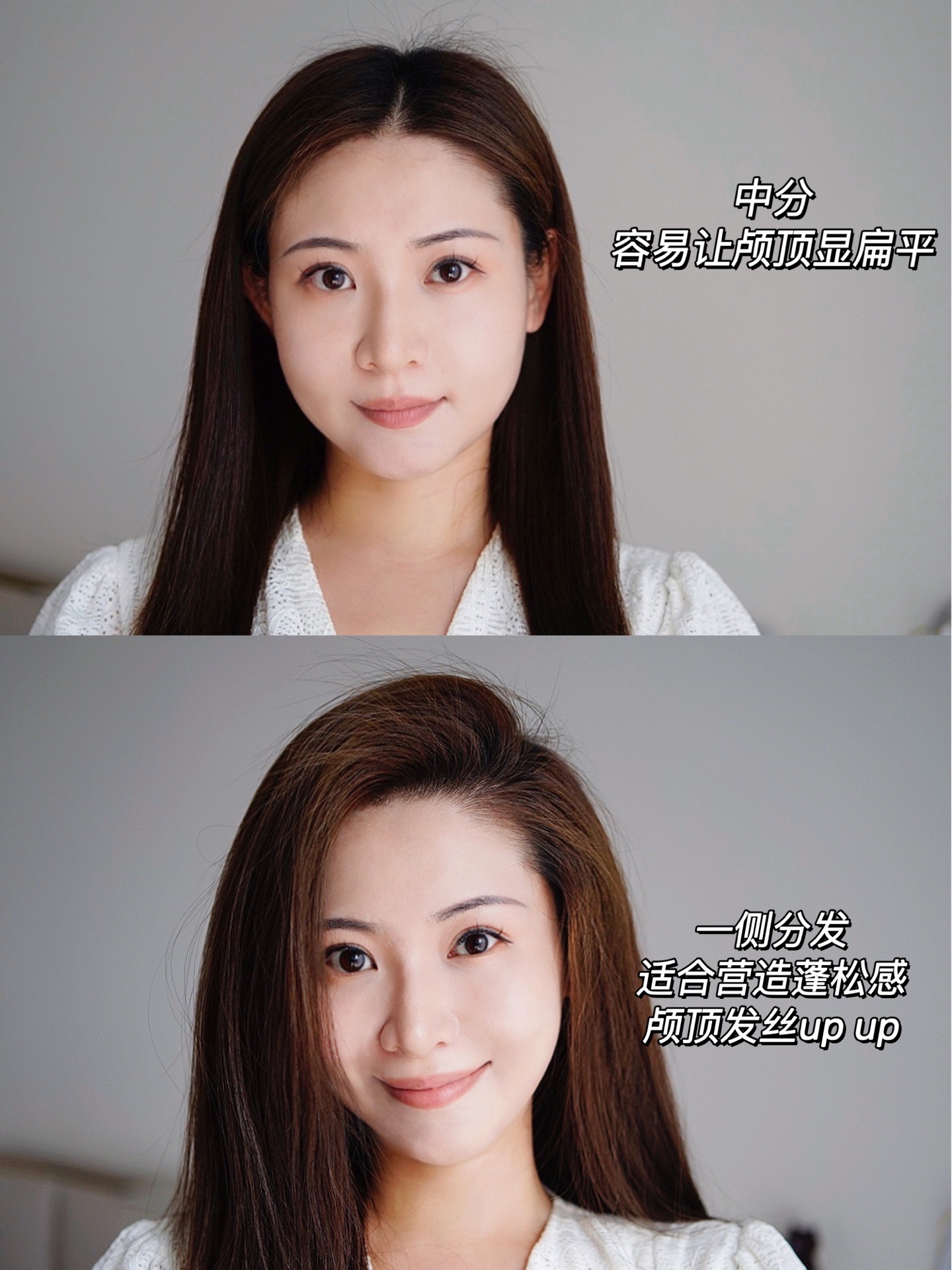 经常做造型的姐妹就会发现,中分比较显头顶扁塌,而侧分发更容易打造高颅顶。