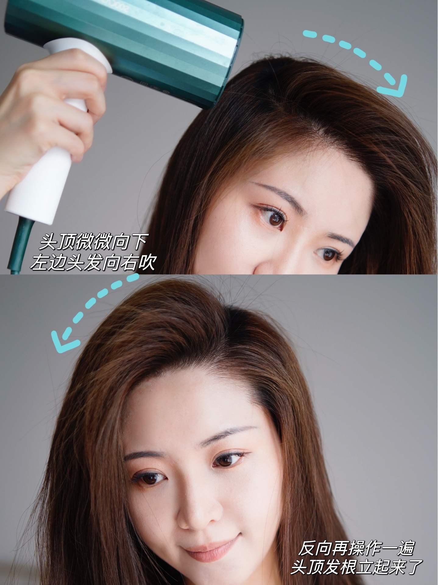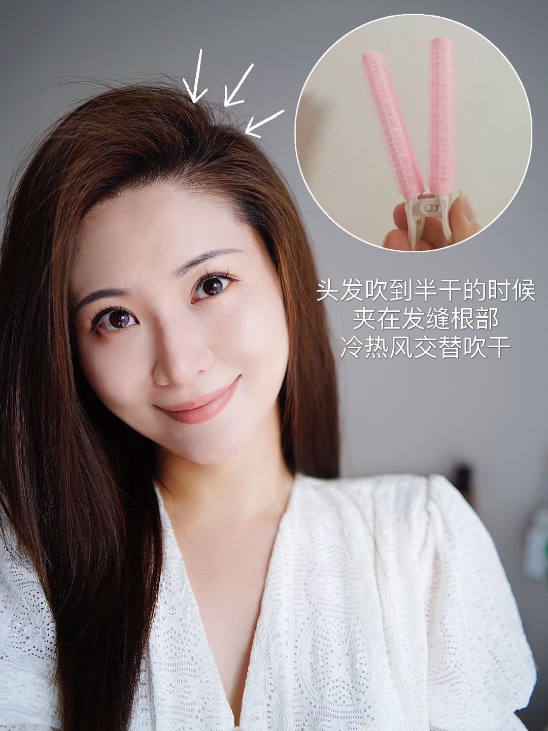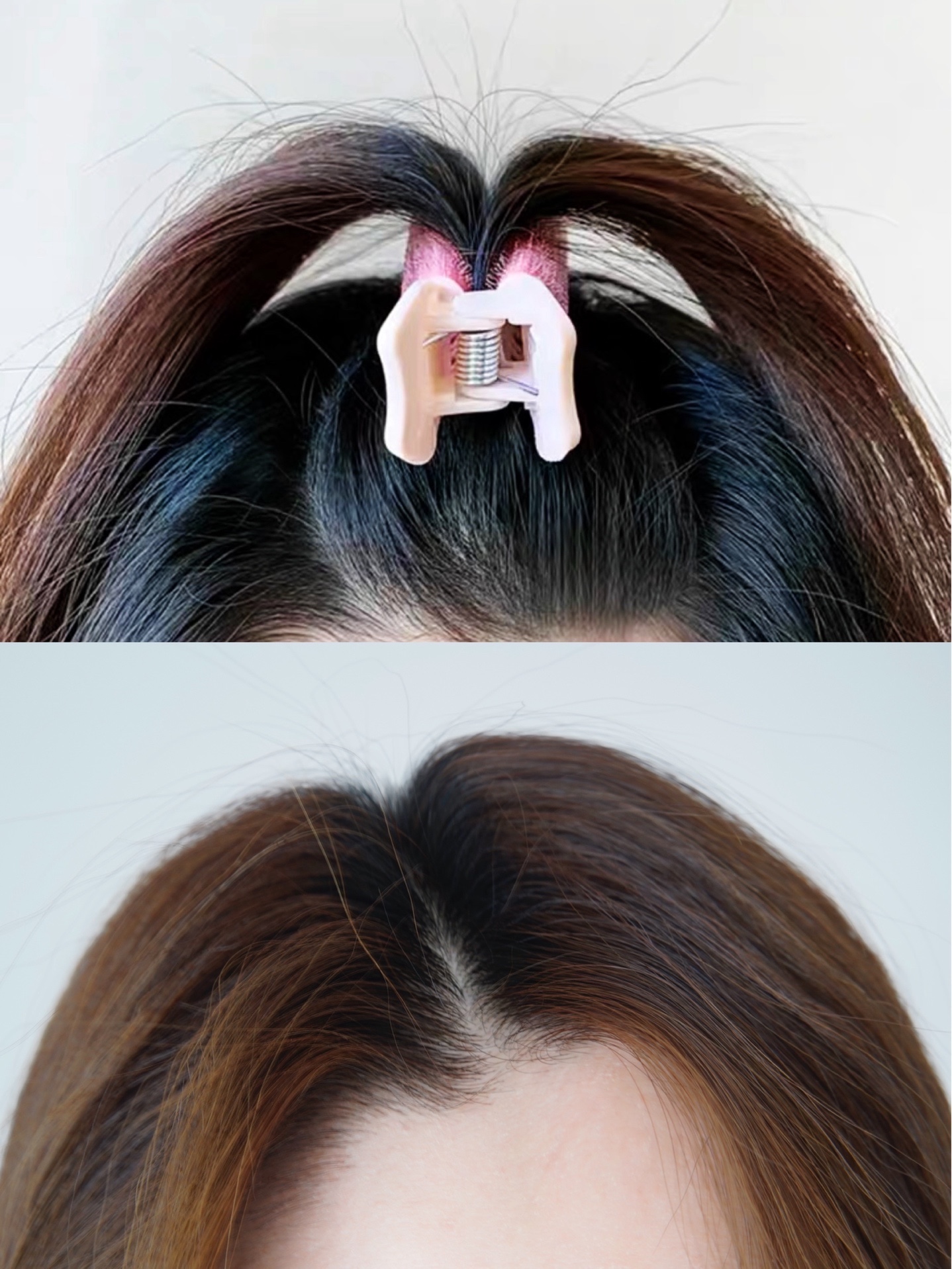 头发吹到半干状态时,注意一定半干⚠️!把蓬松夹固定在发缝根部。冷热风交替继续吹干头发。这样可以做出自然又好看的垫发根效果。