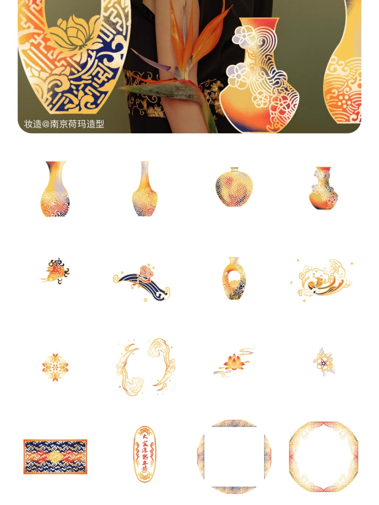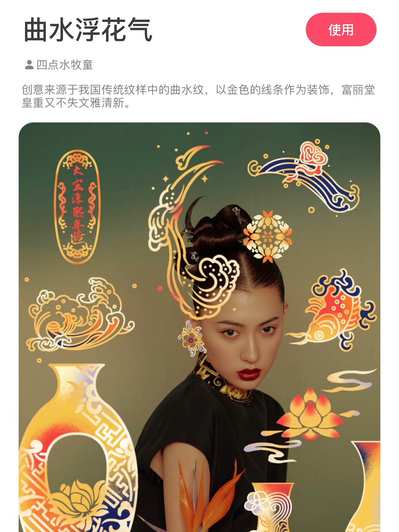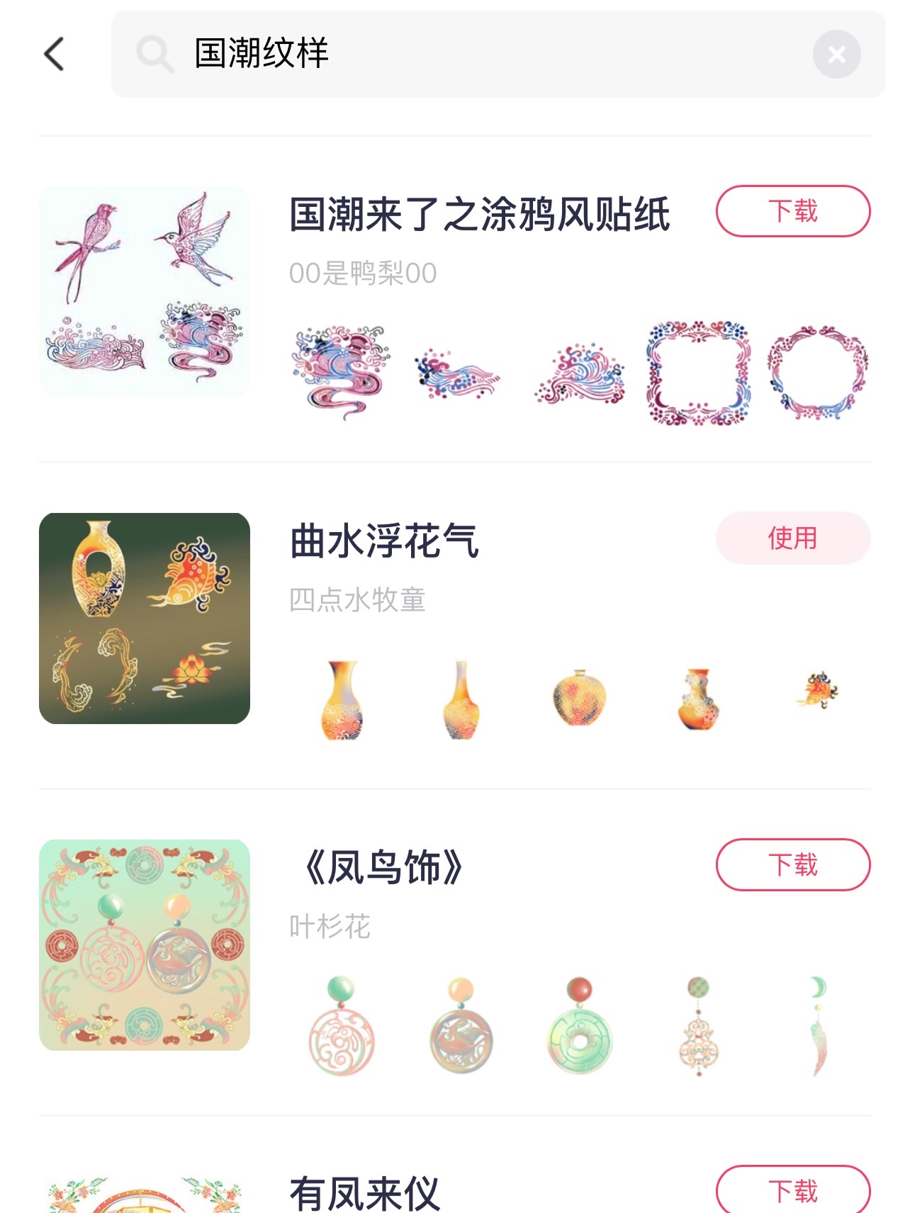 在美图秀秀的贴纸里搜索国潮纹样,往下翻翻,有一个叫曲水浮花气的专辑就是啦~