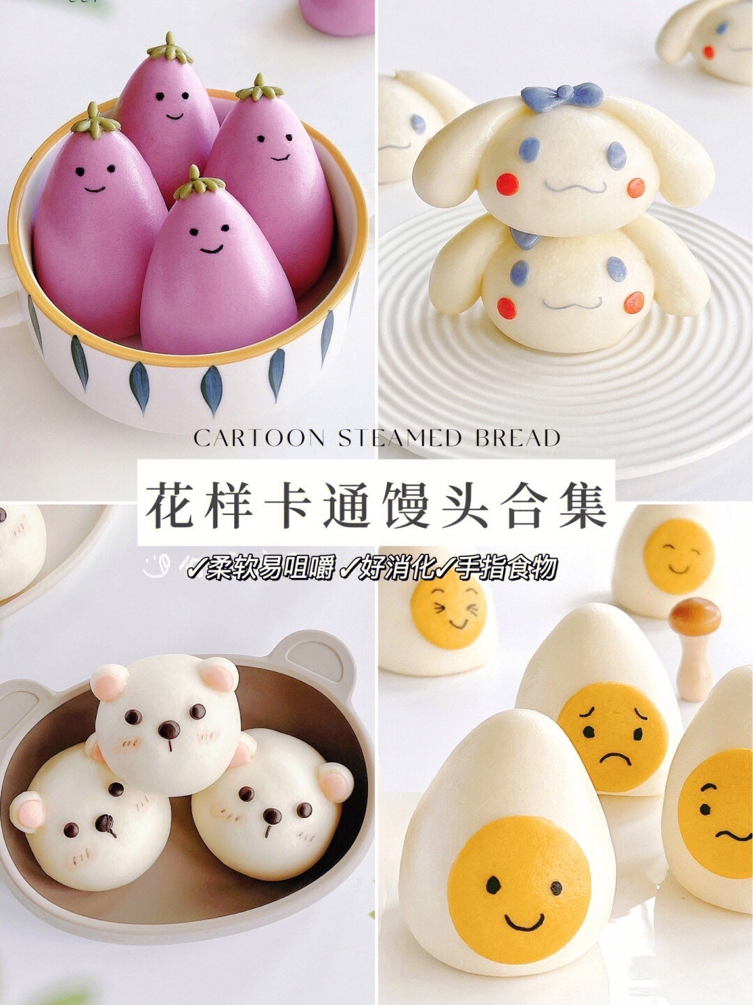 今天分享几款高颜值、蓬松喧软的卡通馒头给大家,茄子馒头、玉桂狗馒头、小熊馒头、水煮蛋馒头,造型可爱,柔软易咀嚼也好消化,是哄娃神器没错了,还可以当做手指食物放心的让宝宝抓着啃扯着吃都能锻炼小手🤚🏻灵活度,都快去安排吧~