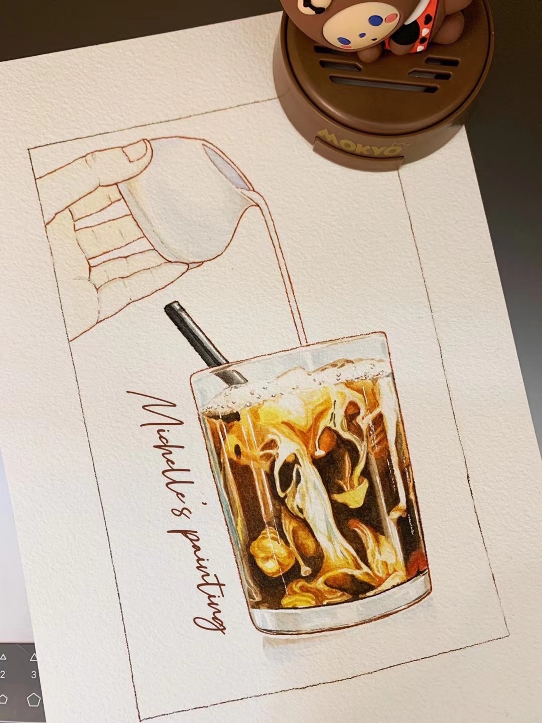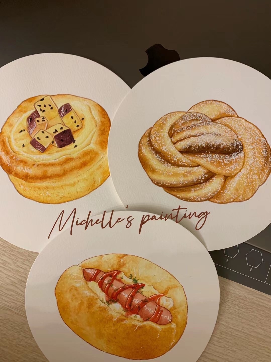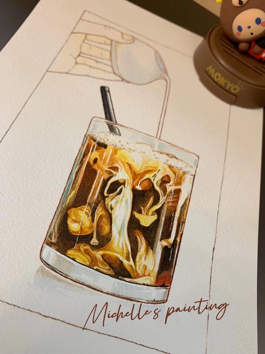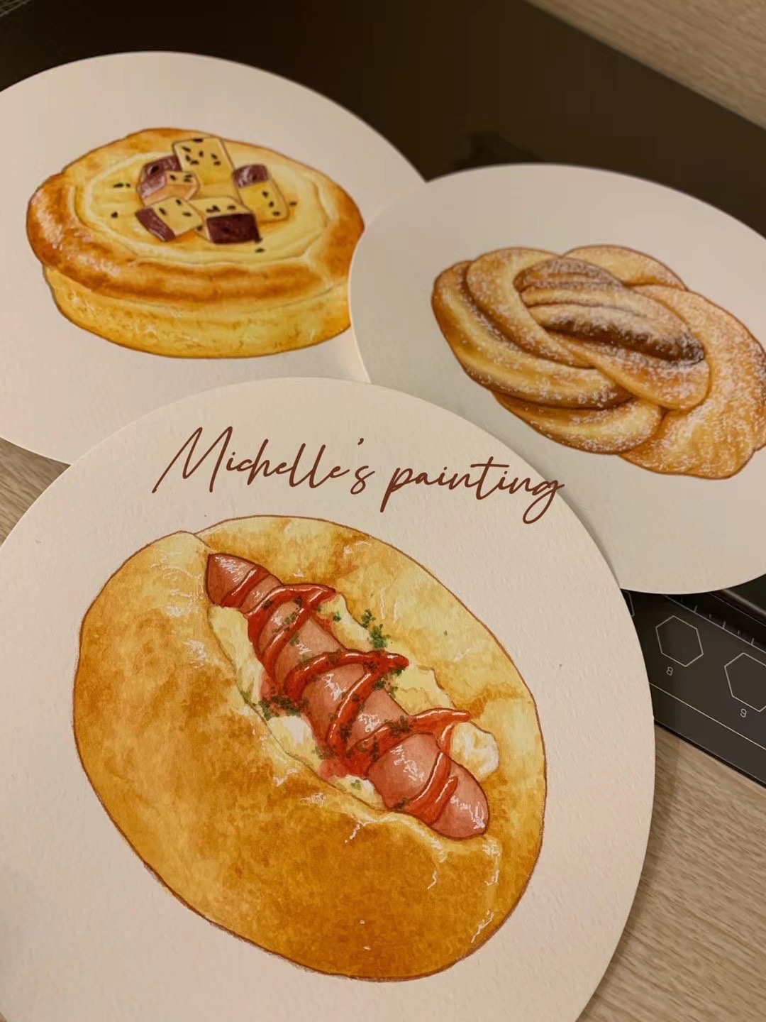 Michelle手绘水彩美食插画|面包和瀑布咖啡
