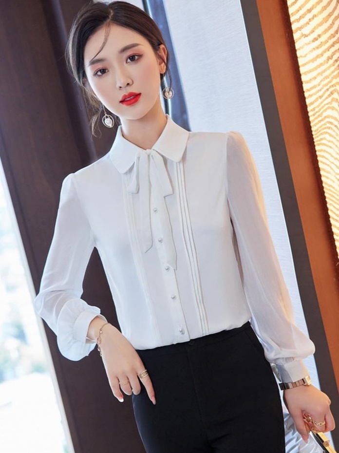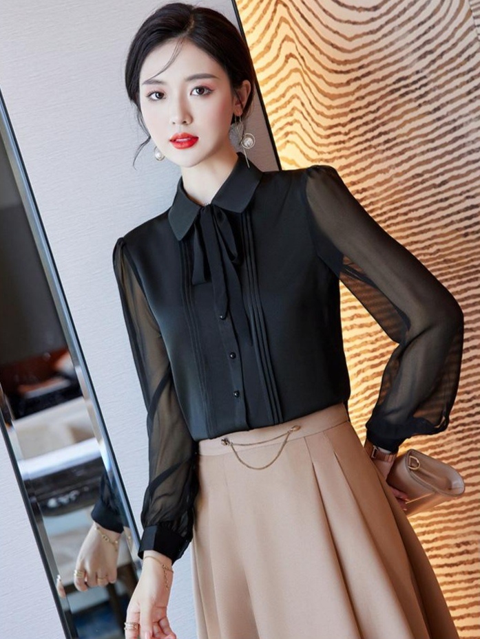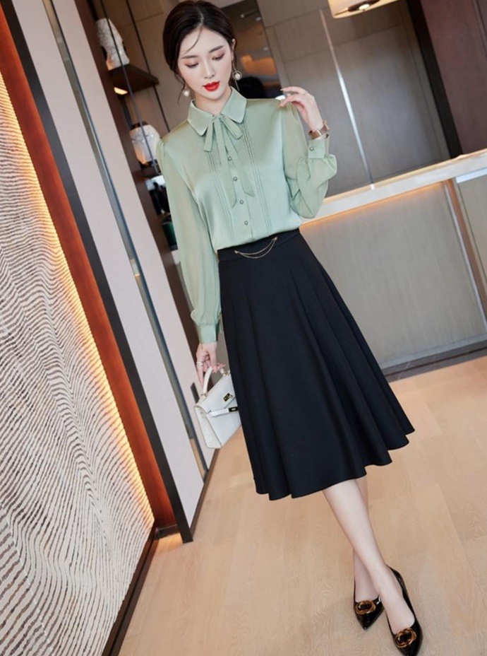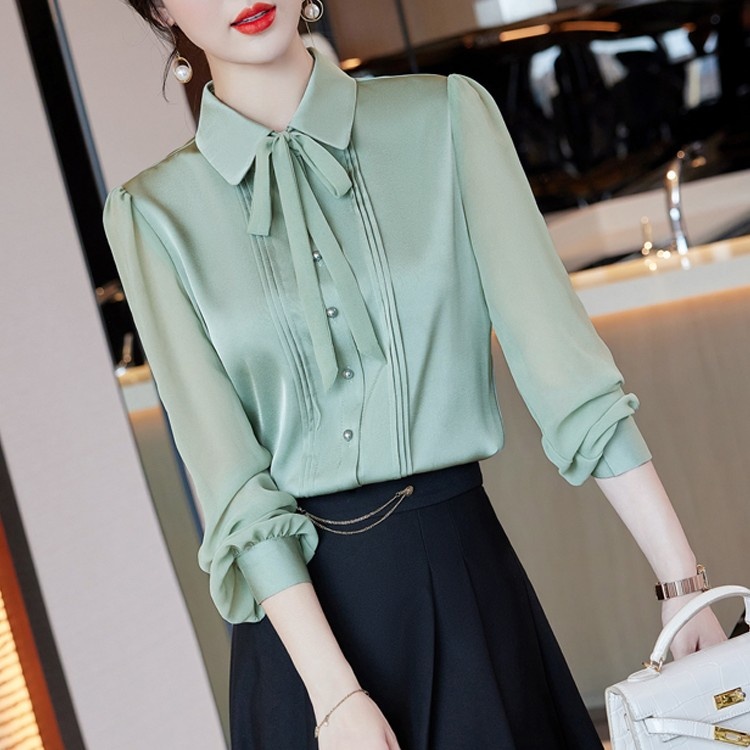 30+醋酸缎面时尚气质,长袖蝴蝶结衬衫穿搭,压褶+蝴蝶结装饰,不呆板更加耐看,搭配半身裙优雅唯美,上身非常显女人味!