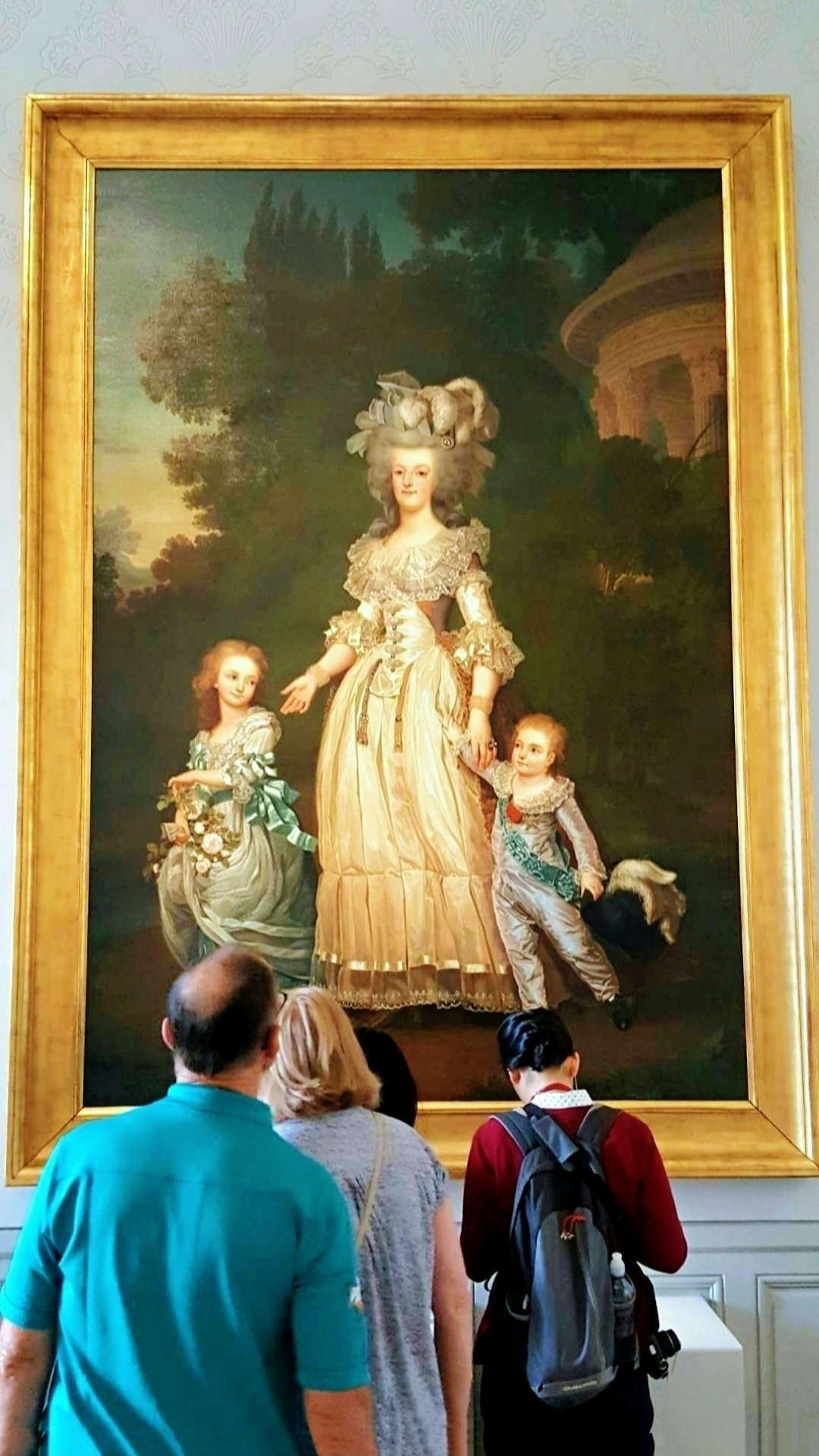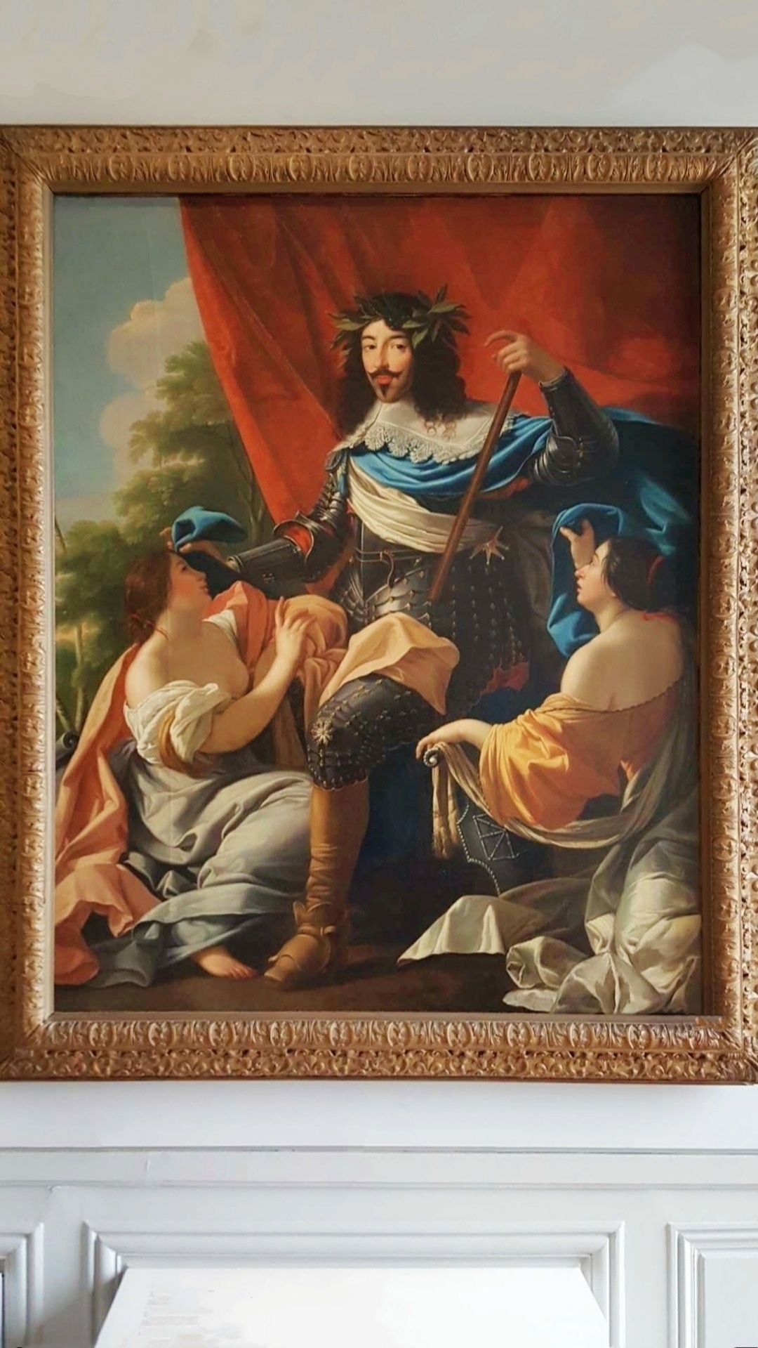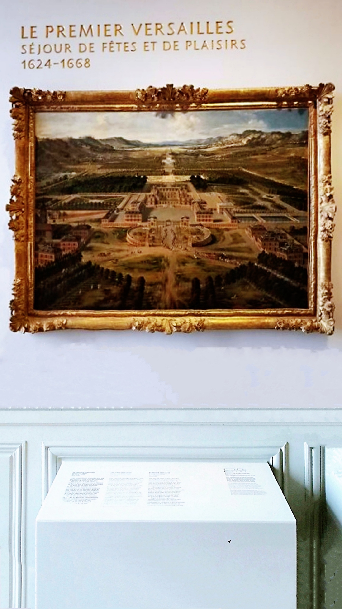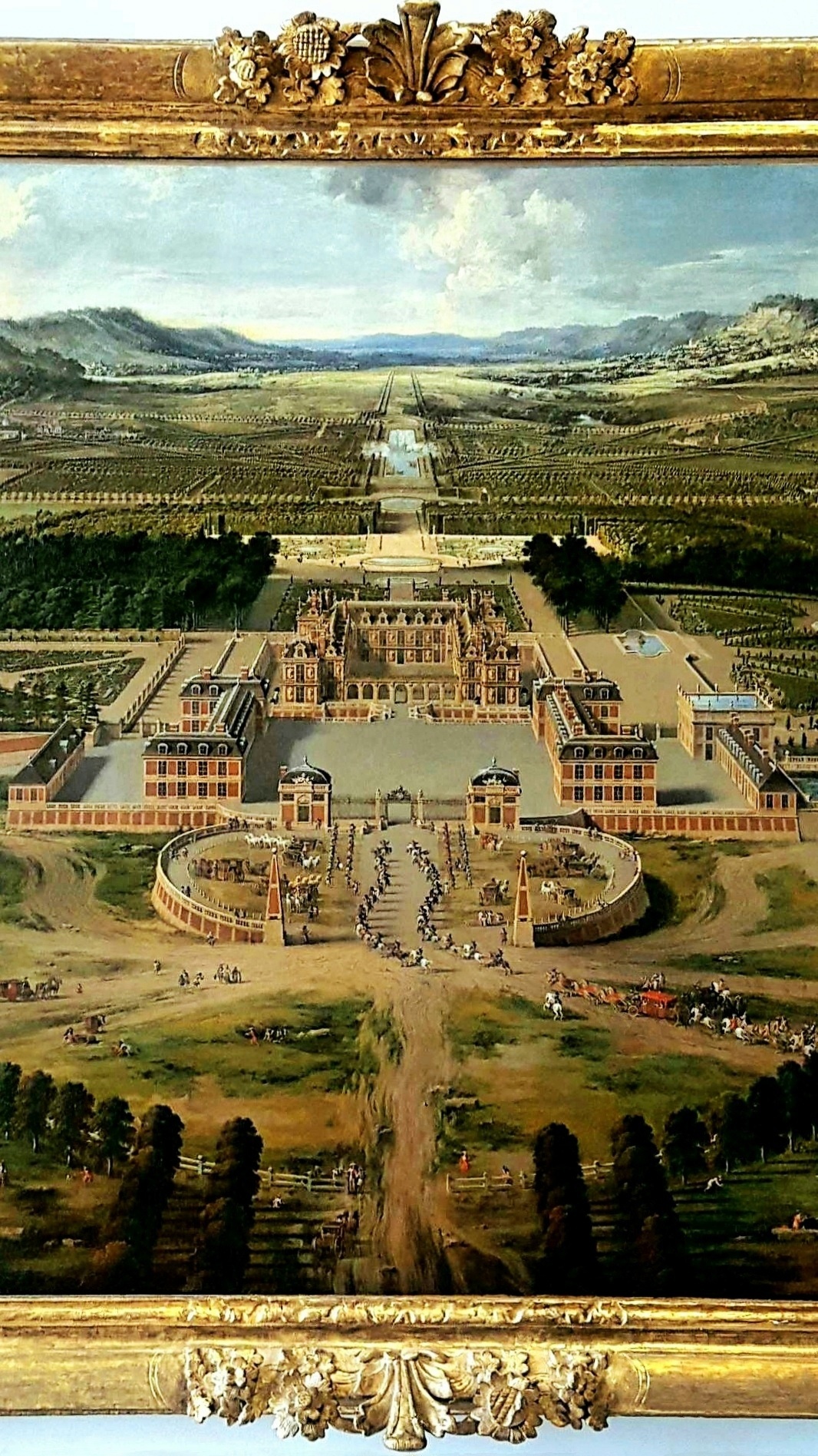 凡尔赛宫十七世纪厅为肖像油画展厅,可能那时没有相机的缘故,路易家族请了很多的著名画家为其作画。看看最后两张图片,虽说是当年画的是1664~1668年凡尔赛宫地全景,我把手机推上去再看,是不是这幅油画就跟航拍出来似的。