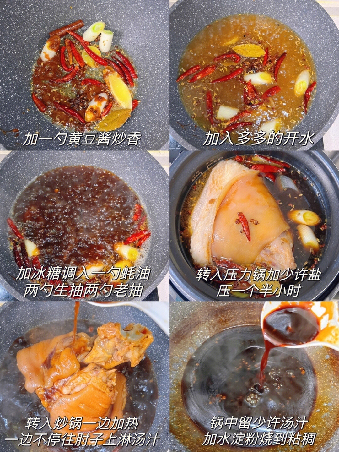 3、油热炒香葱姜和香料,加黄豆酱炒香。加入多多的开水和冰糖。调入一勺蚝油两勺生抽两勺老抽少许盐。跟肘子一起转到压力锅内,压一个半小时左右。