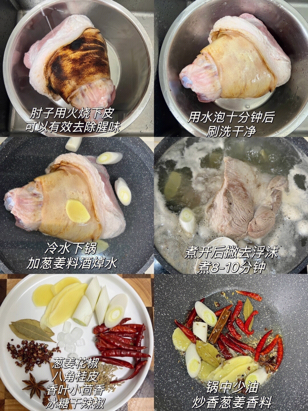 1、肘子火烧一下外皮,水泡十分钟左右后,刷洗干净。烧过后的肘子更好的去除腥味。