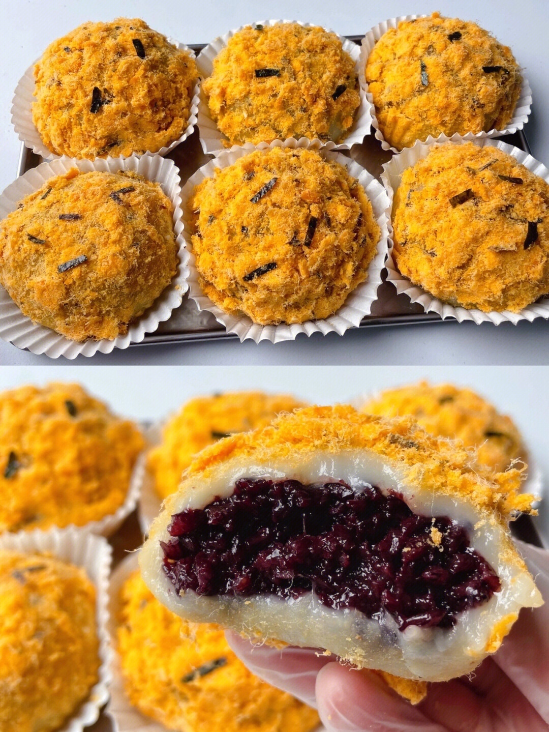 好吃的紫米肉松麻薯团就做好了!