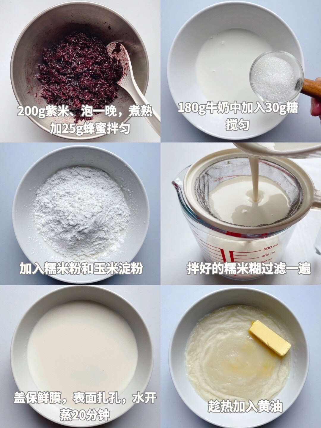 2、牛奶、糖、玉米淀粉、糯米粉混合,搅拌均匀,过滤一遍更细腻。盖保鲜膜,扎小孔排气,水开蒸20分钟。