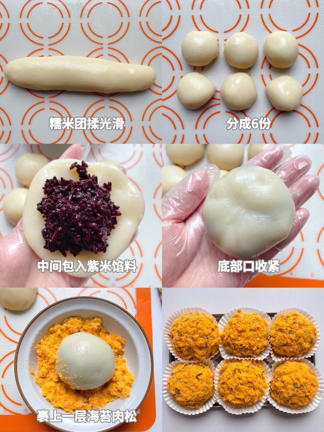 3、趁热加入黄油,冷却一点带手套揉成光滑的糯米团,分成6个剂子,压扁,包入紫米馅,底部口收紧,表面裹上一层肉松。