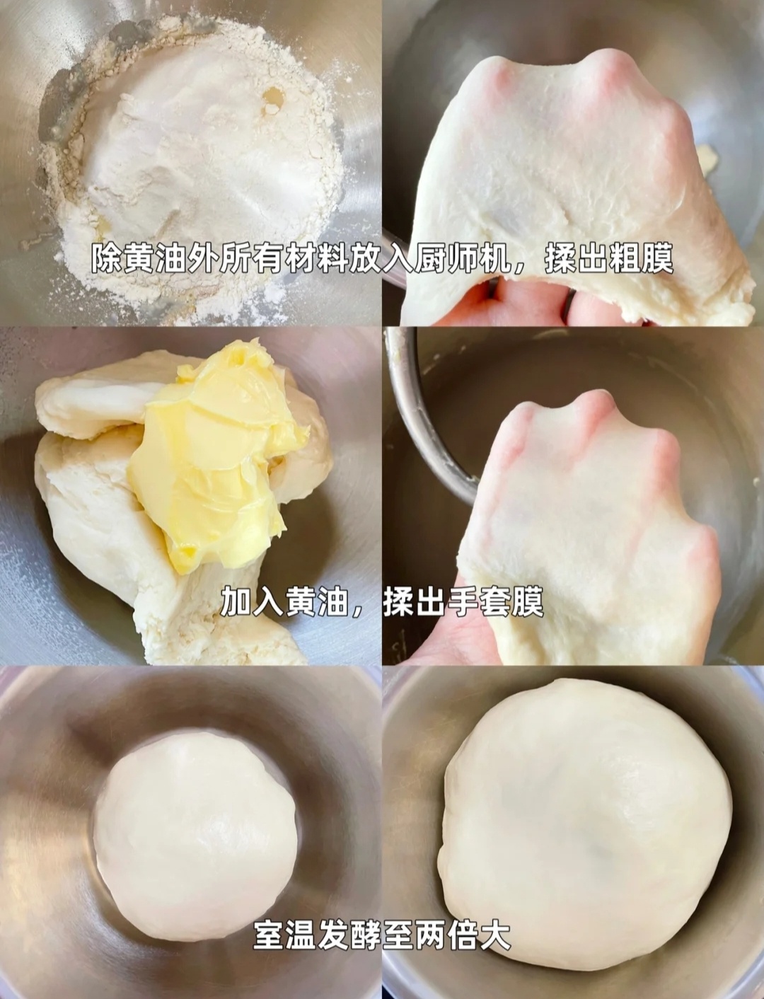 1⃣将除黄油外,所有材料放入厨师机,揉出粗膜,加入黄油揉出手套膜