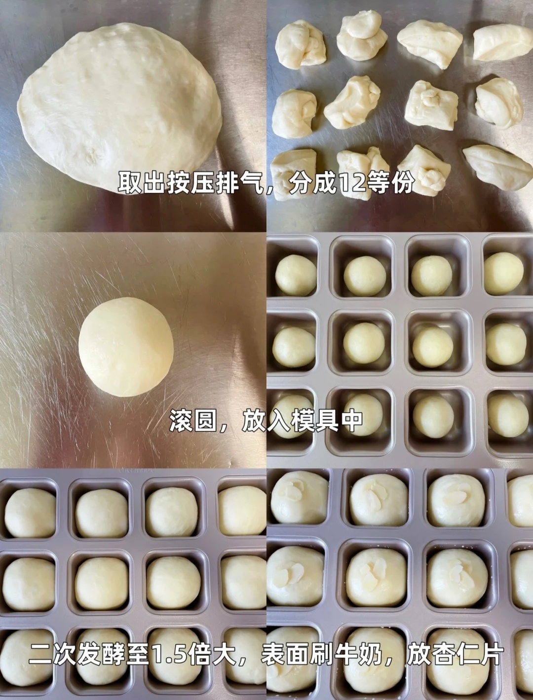 2⃣盖保鲜膜发酵至两倍大,取出按压排气分成12等份,滚圆,放入模具中