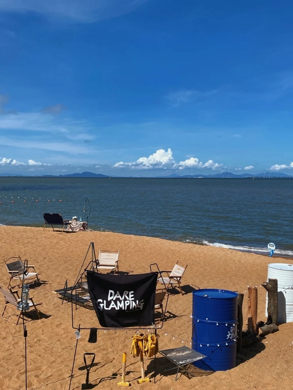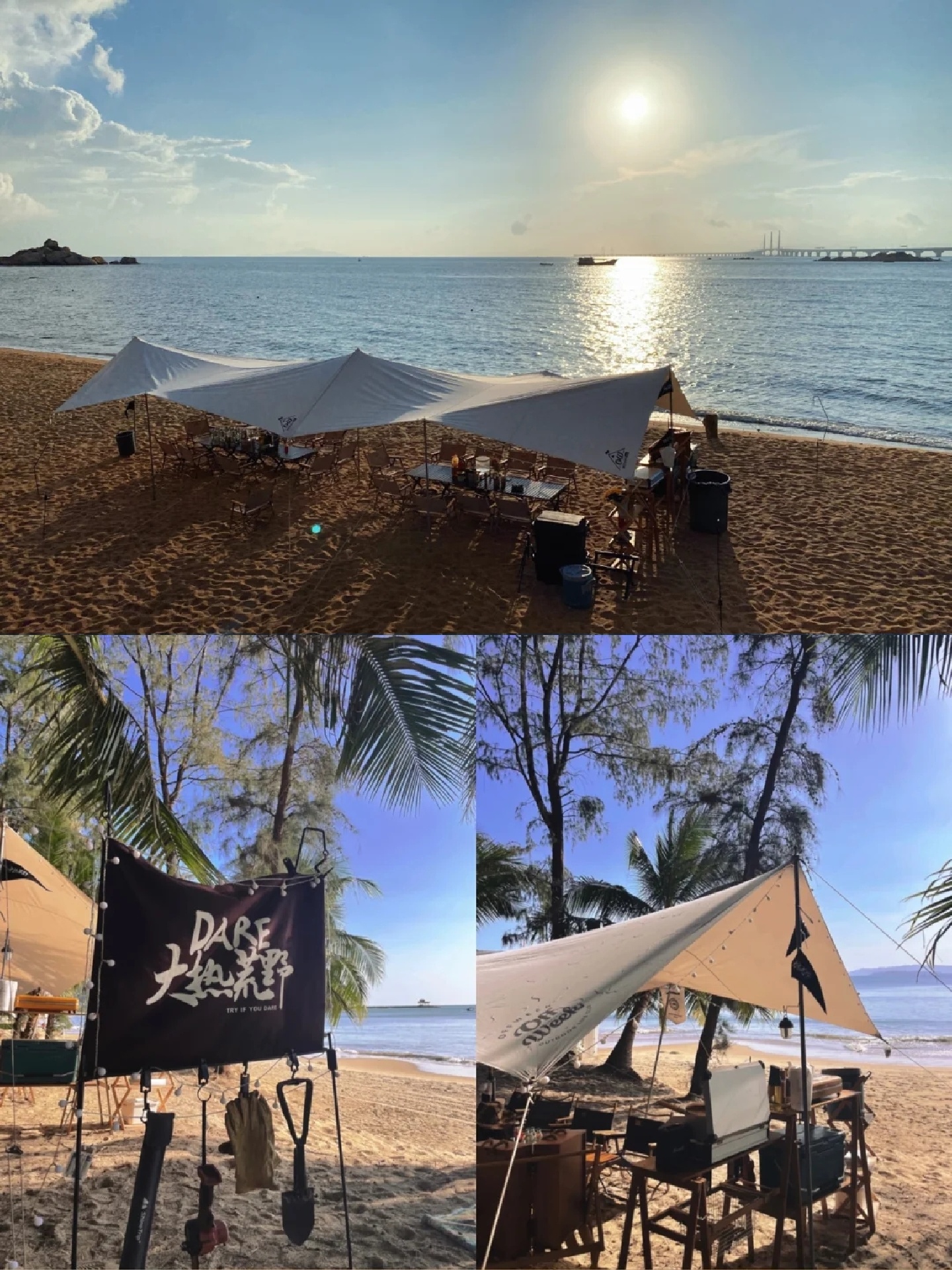 不出省也能拥有明星三亚同款沙滩露营!🥳九洲岛营地对岸就是港珠澳大桥🌁,岛上悠闲露营,收获搭建帐篷体验(有教练指导)✅,帐篷内的用品由团队准备,非常齐全~ 晚上的氛围简直绝绝子,一个人呆着也很舒服~沙滩上的海边日出🌅和日落🌇足够让人心动🥰🥰,还可以去岛上转转打卡不一样的风景📸📸