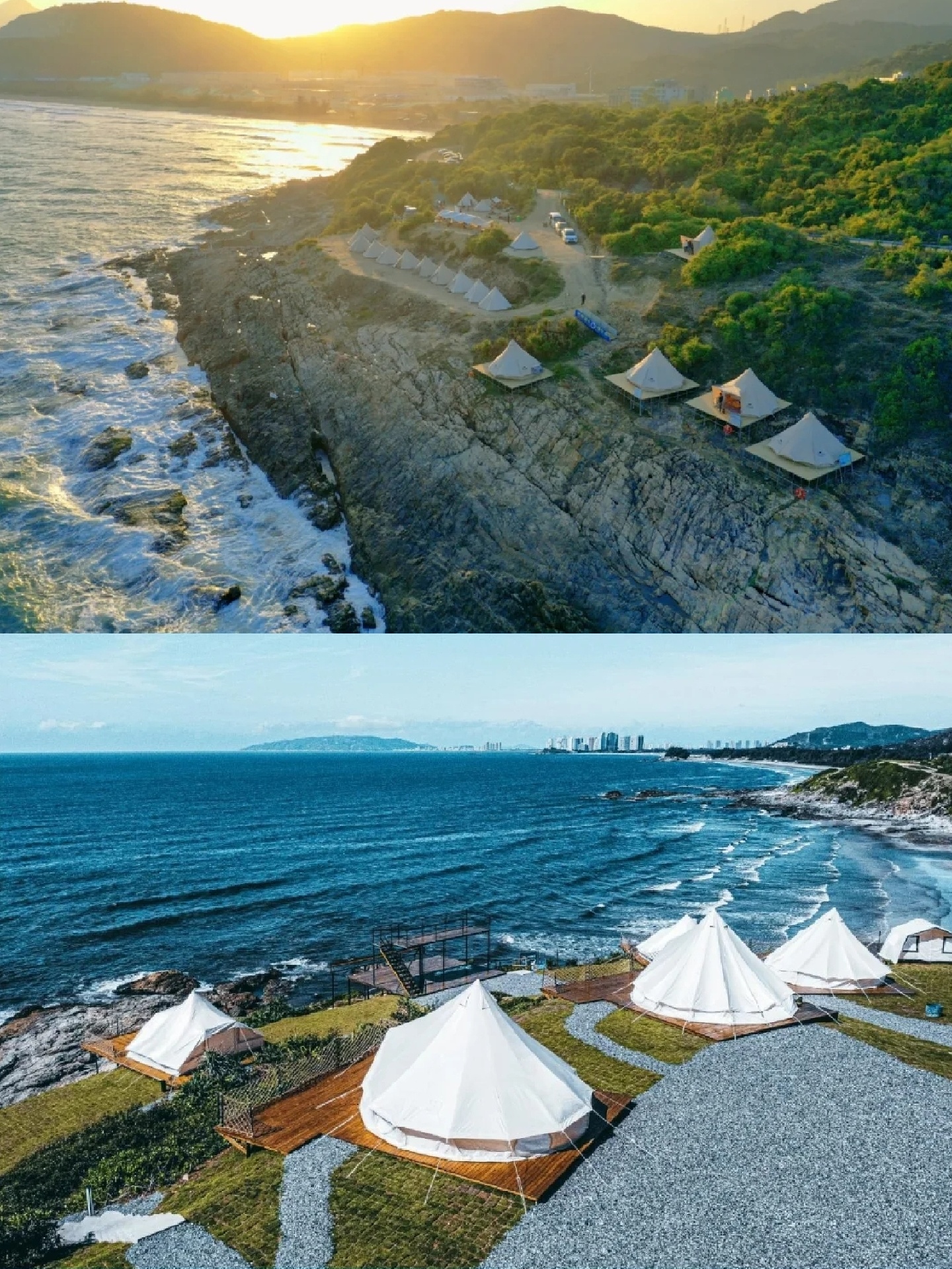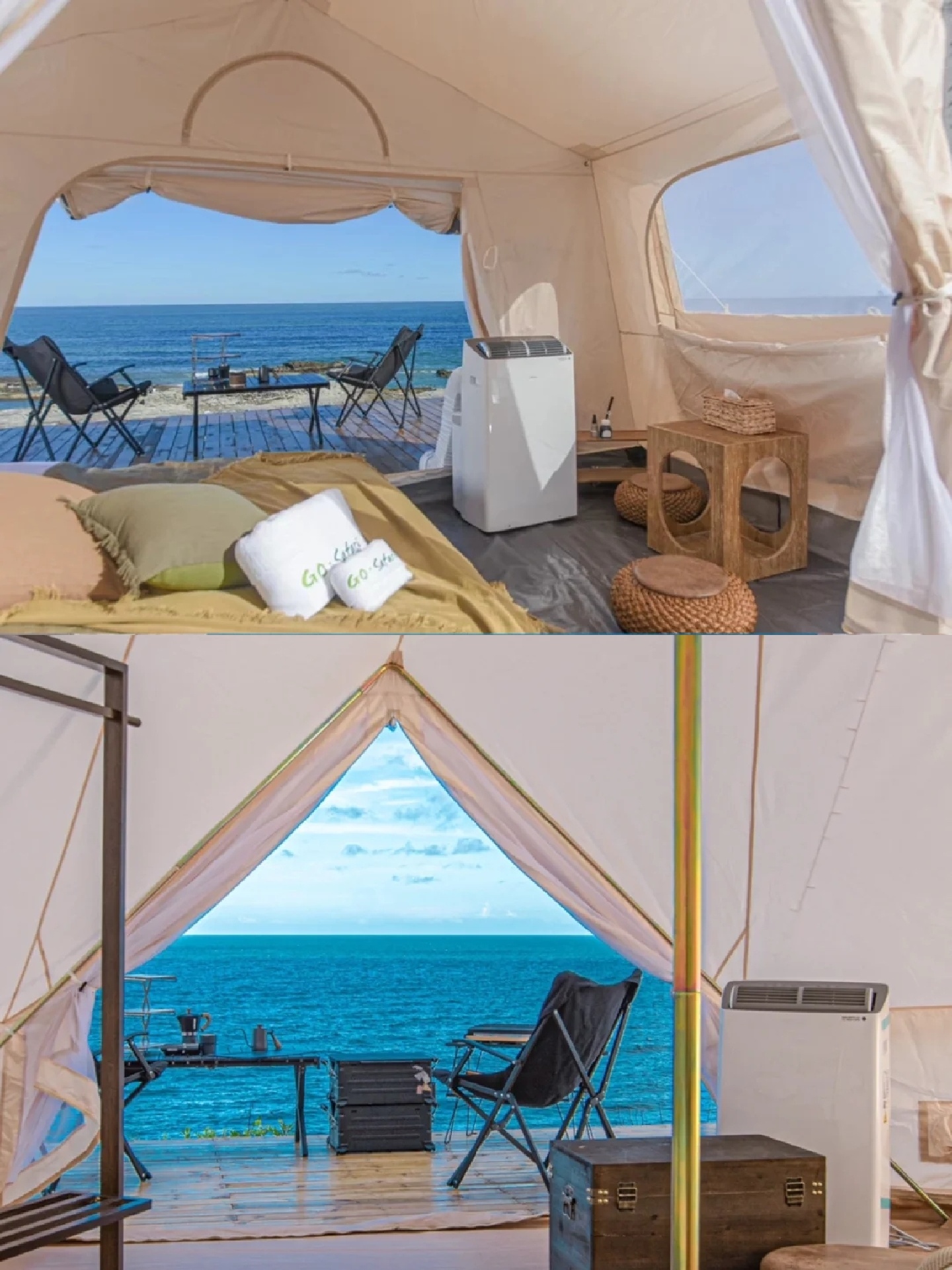 一线悬崖海景🌊,无敌海景日出🌅&日落,每一顶帐篷阶梯式分布都是面朝大海,重点是还都配有独立空调,广东人在这里根本不怕热~ 营地设备也齐全,独立卫生间和淋浴间💯,精致下午茶和自助烧烤晚餐🍢,夜晚参加篝火晚会、一起看露天电影、听海浪声入睡,我愿称之为躺平式露营,只管放心享受精致的露营时光~😌😌
