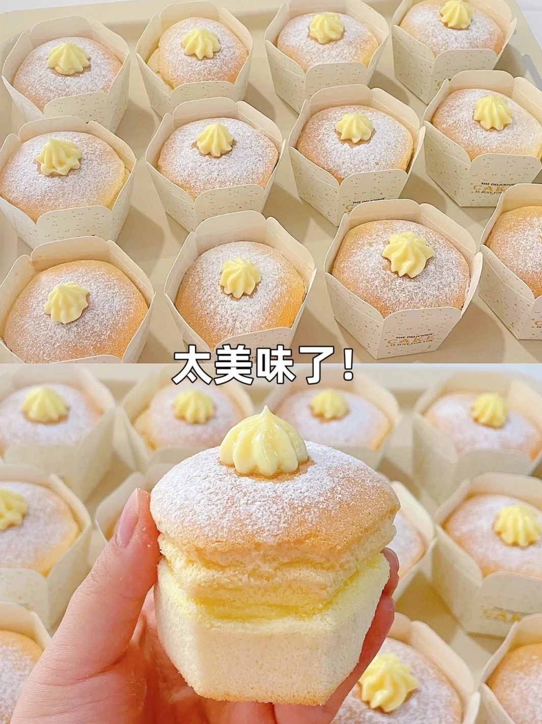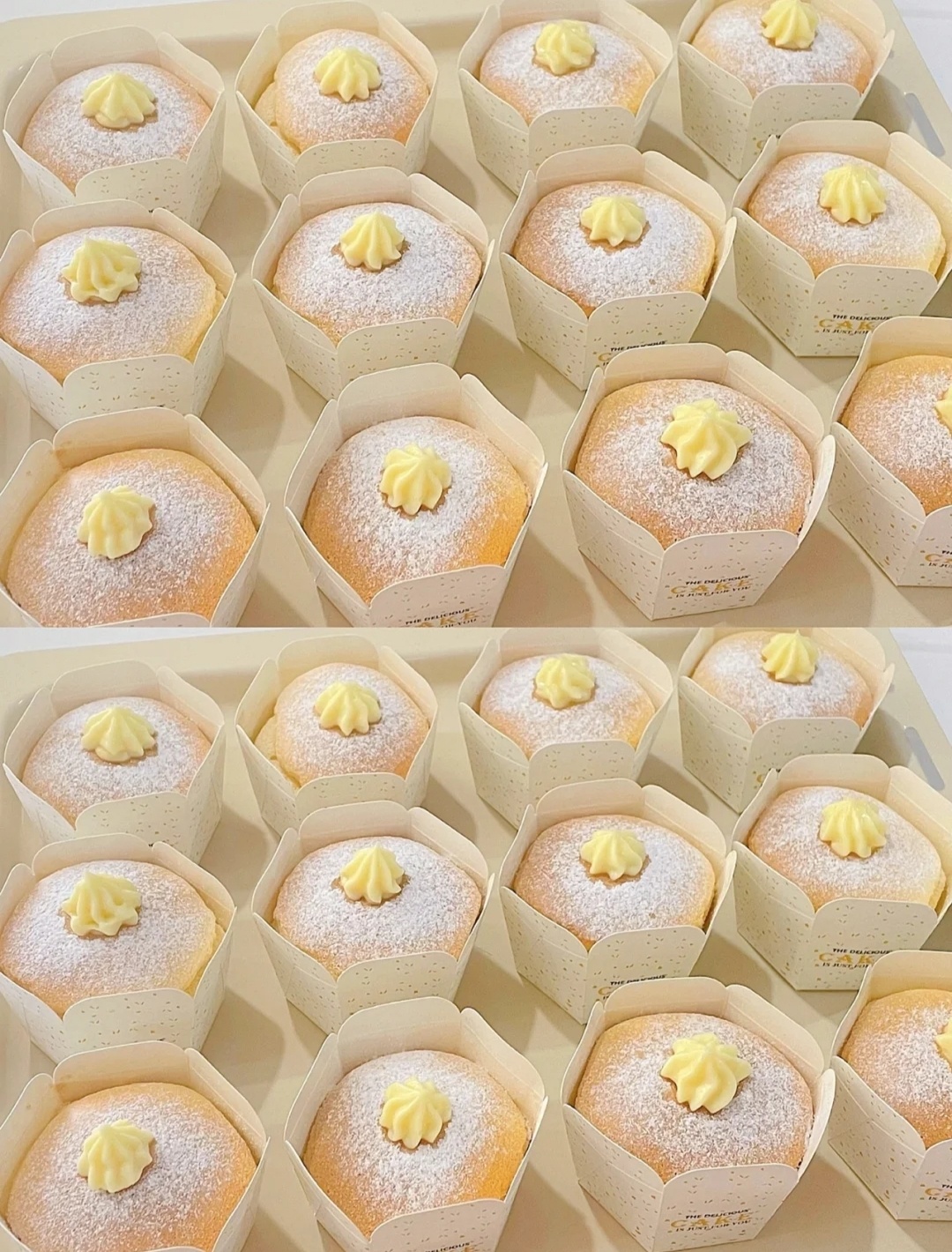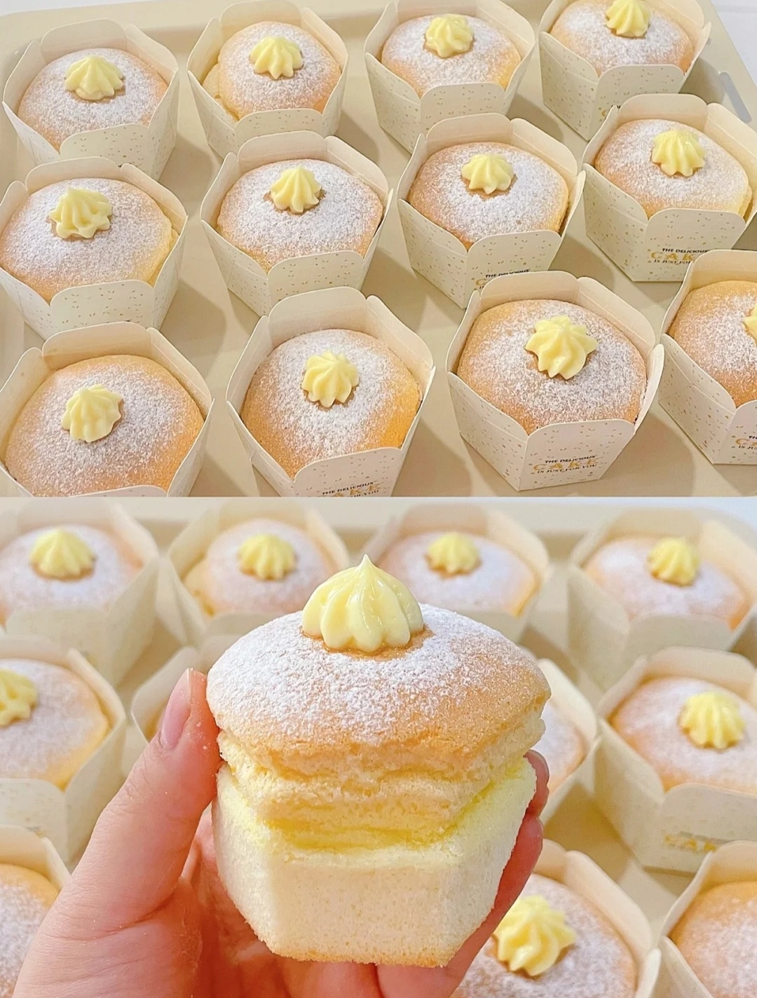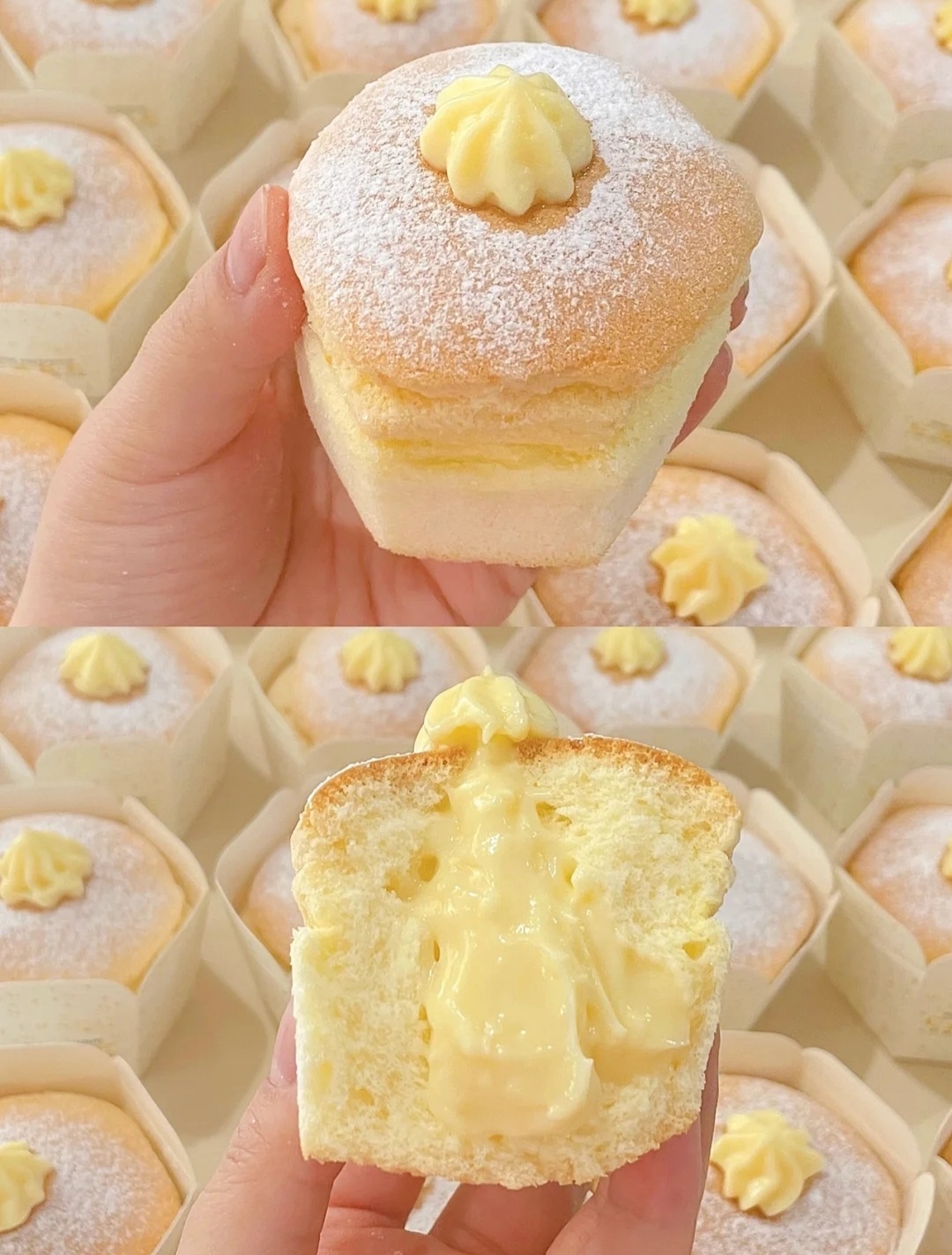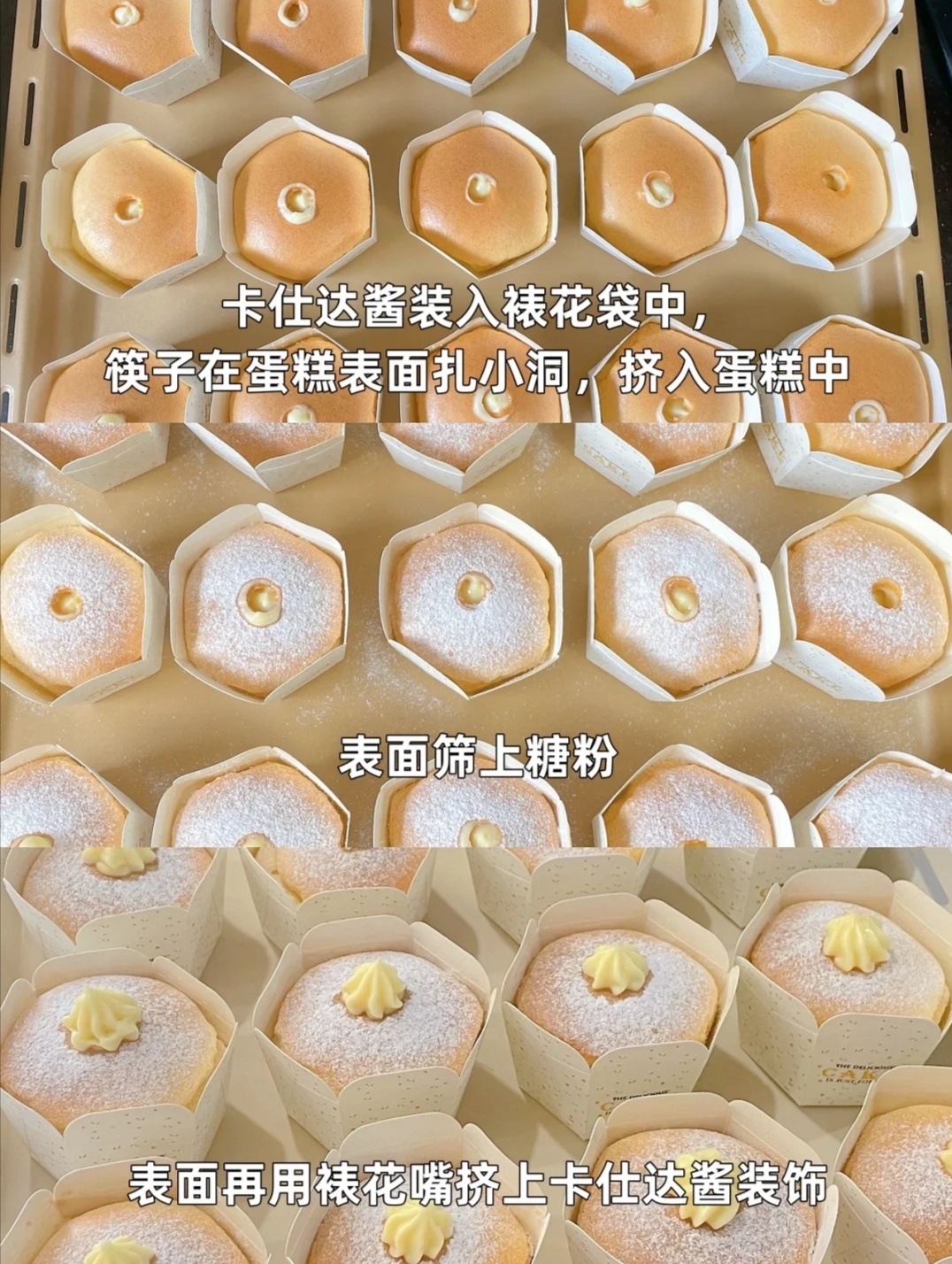 6⃣卡仕达酱装入裱花袋中,用筷子在蛋糕表面戳小洞,挤入蛋糕中,撒上糖粉,用裱花嘴挤上卡仕达酱装饰