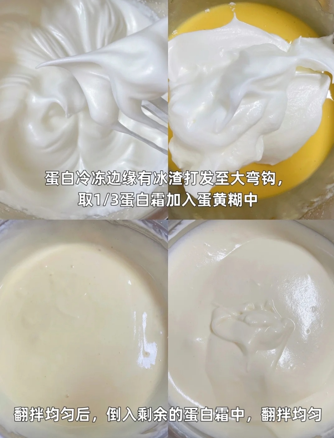 3⃣取1/3蛋白加入蛋黄糊中,翻拌均匀,倒入剩余的蛋白霜中,翻拌均匀
