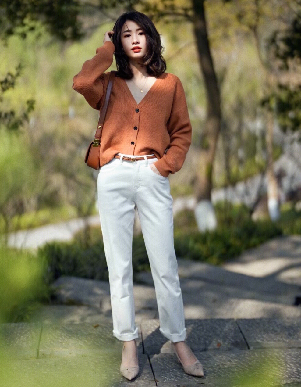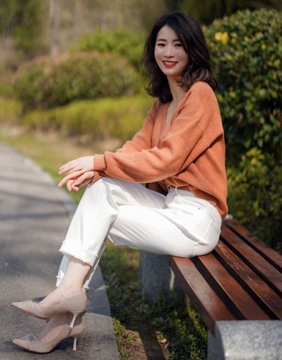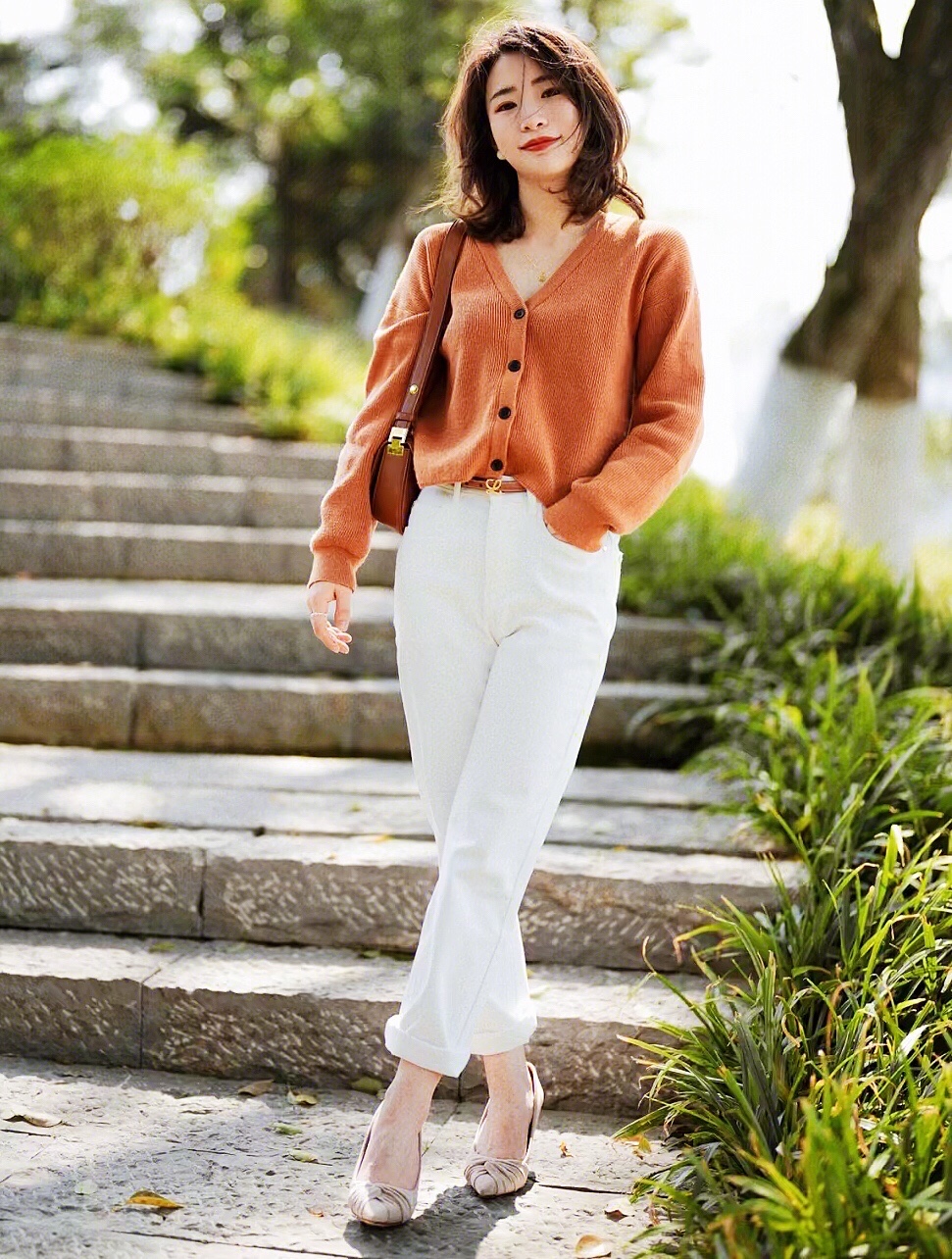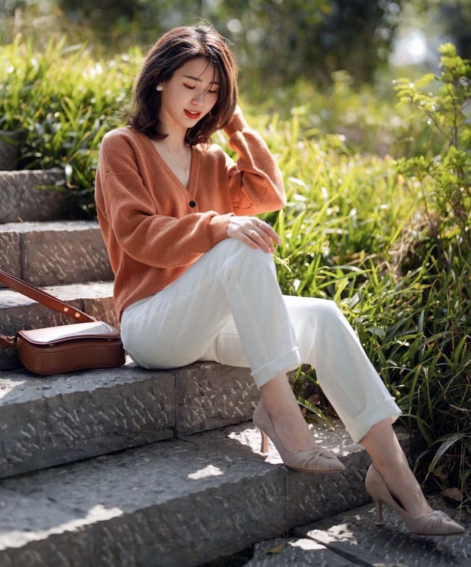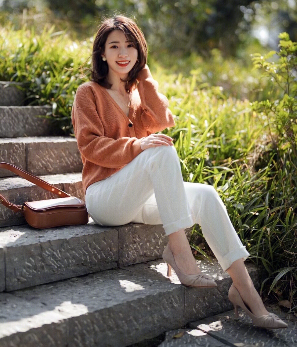 橘色的针织开衫和白色牛仔裤搭配经典温柔,靓丽时髦,更多了几分简约和洒脱清爽的气质感!