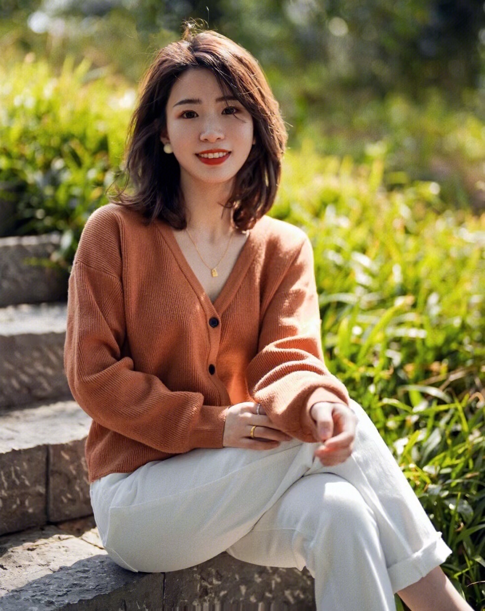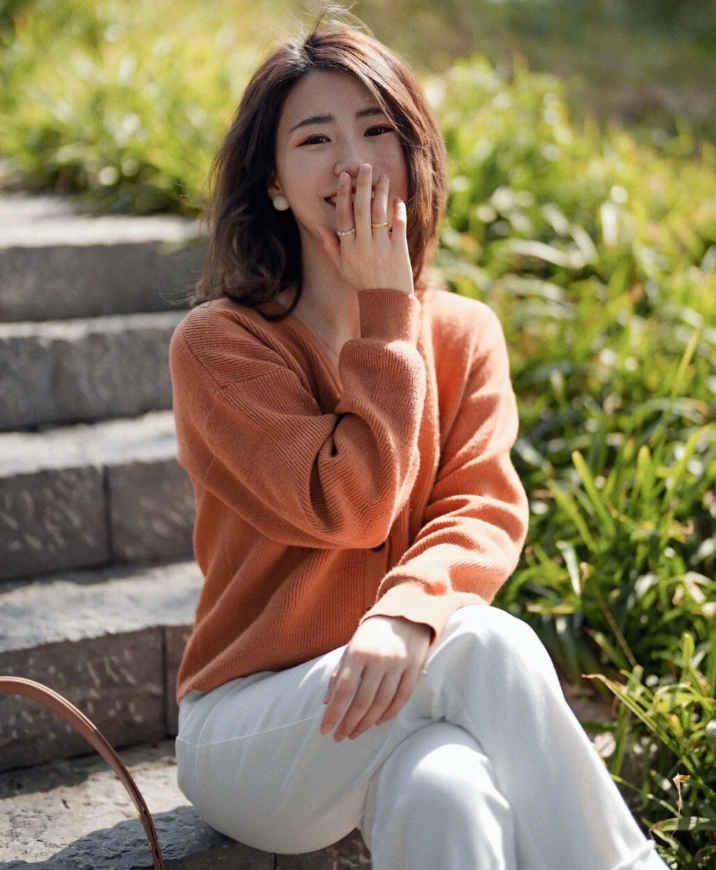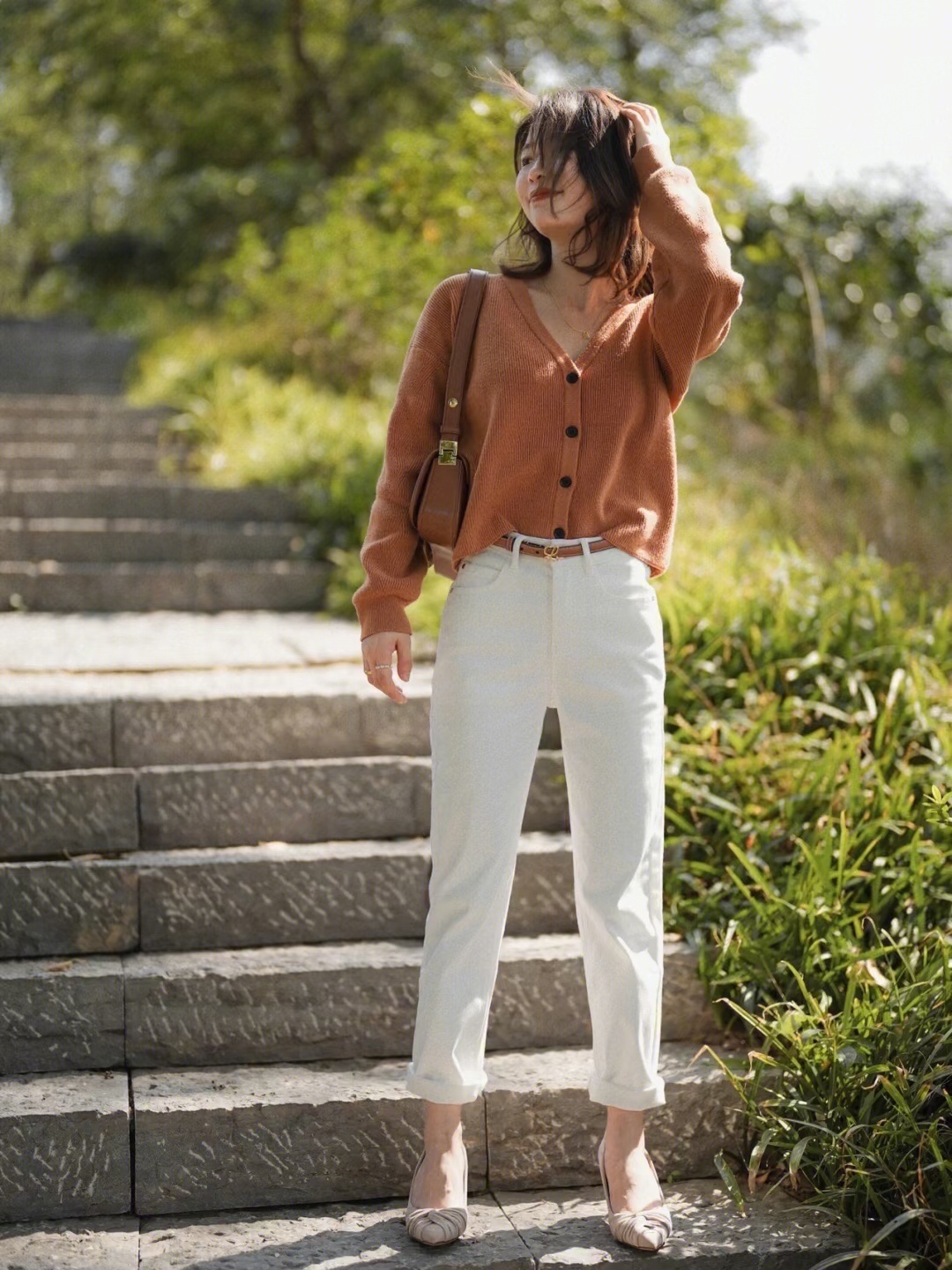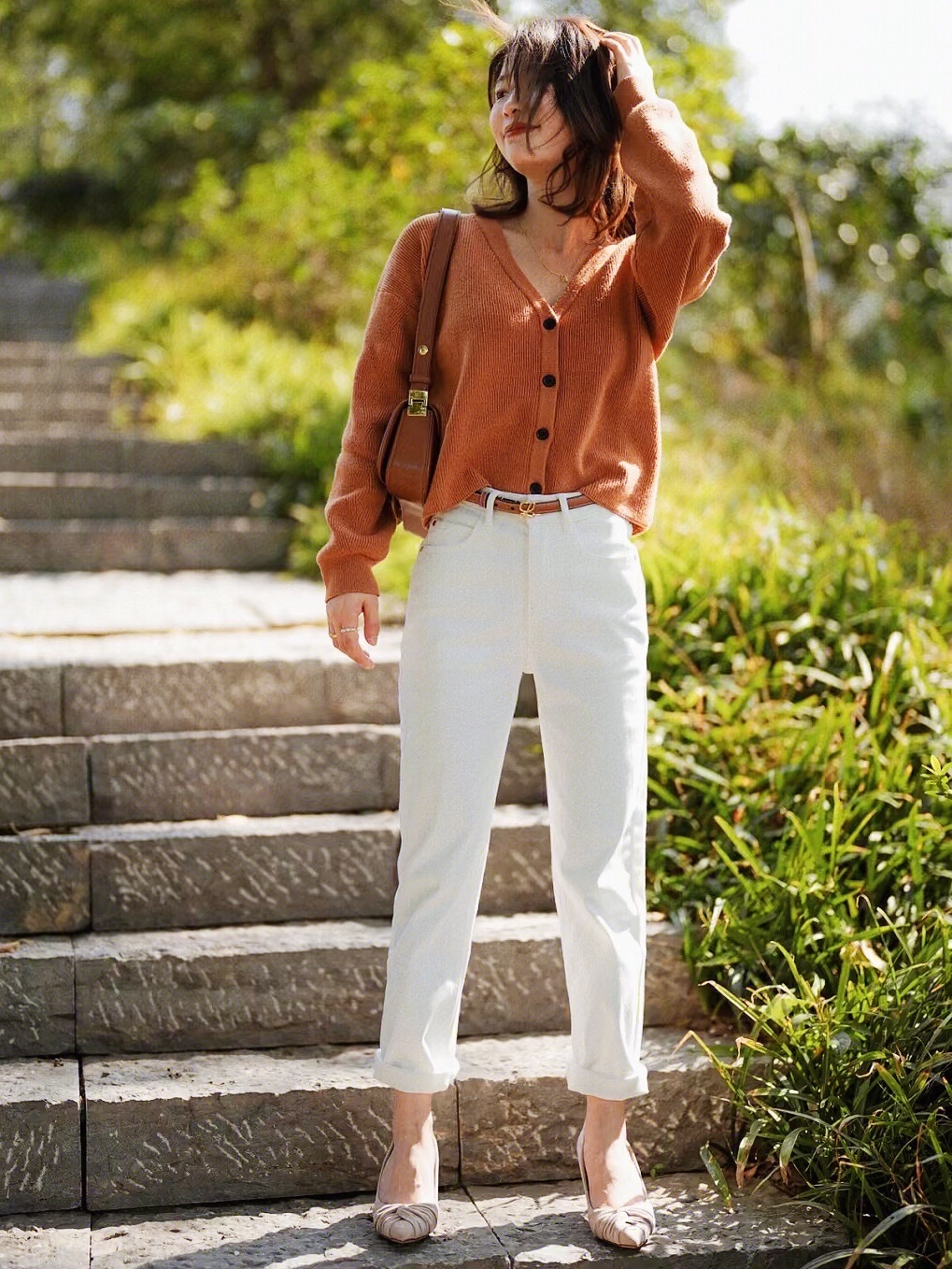 橘色的针织开衫和白色牛仔裤搭配经典温柔,靓丽时髦,更多了几分简约和洒脱清爽的气质感!