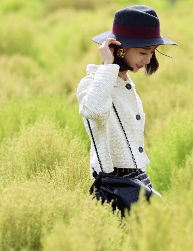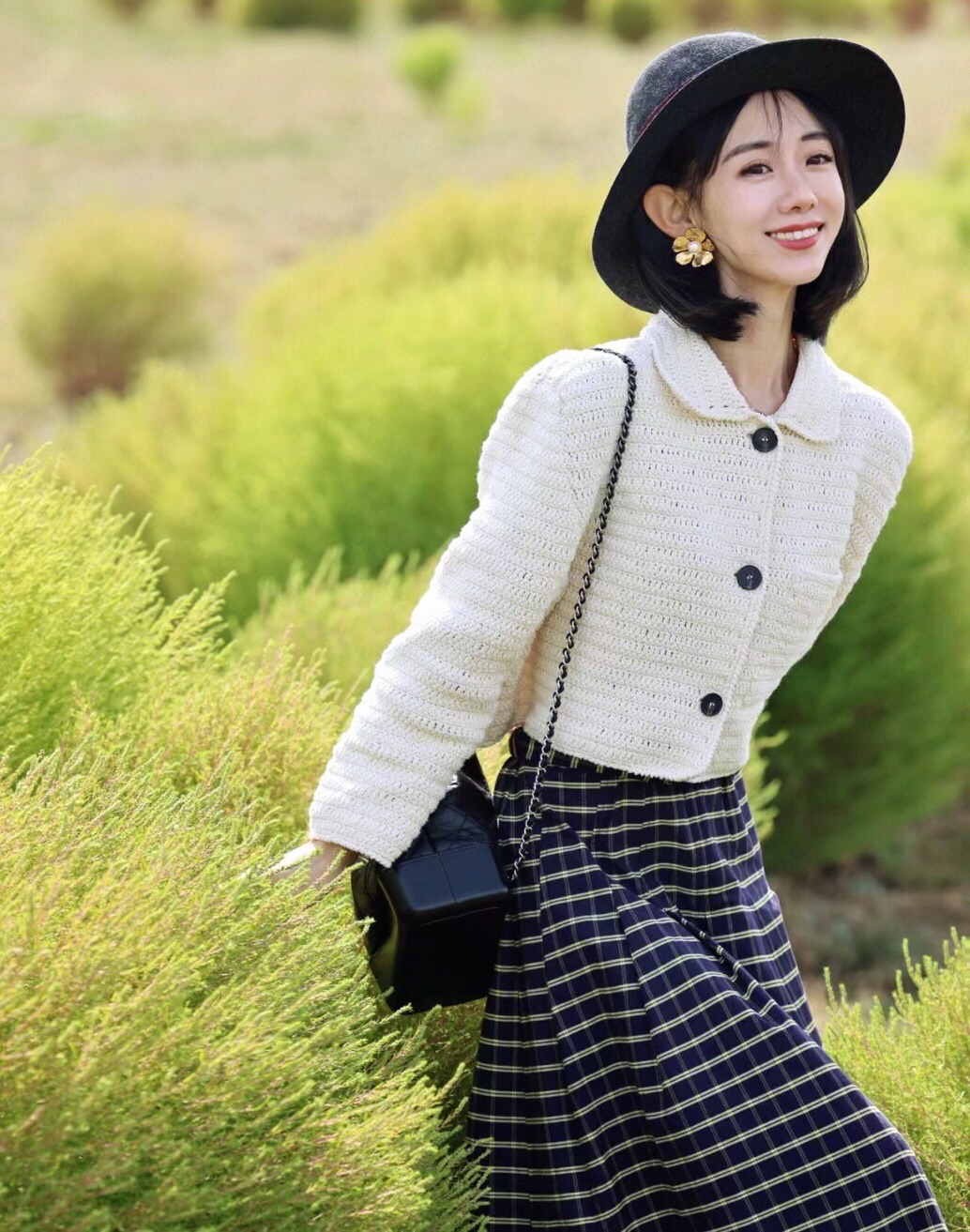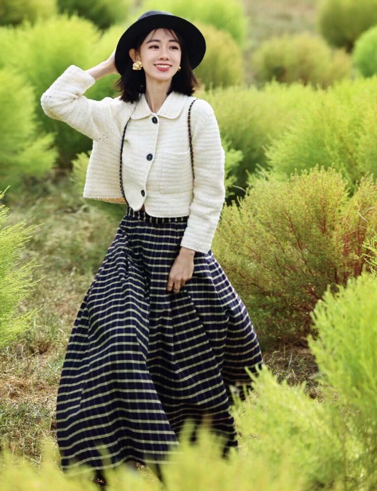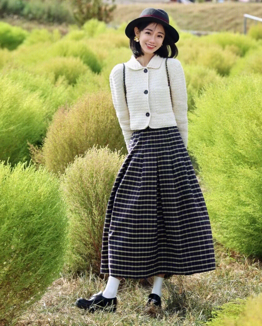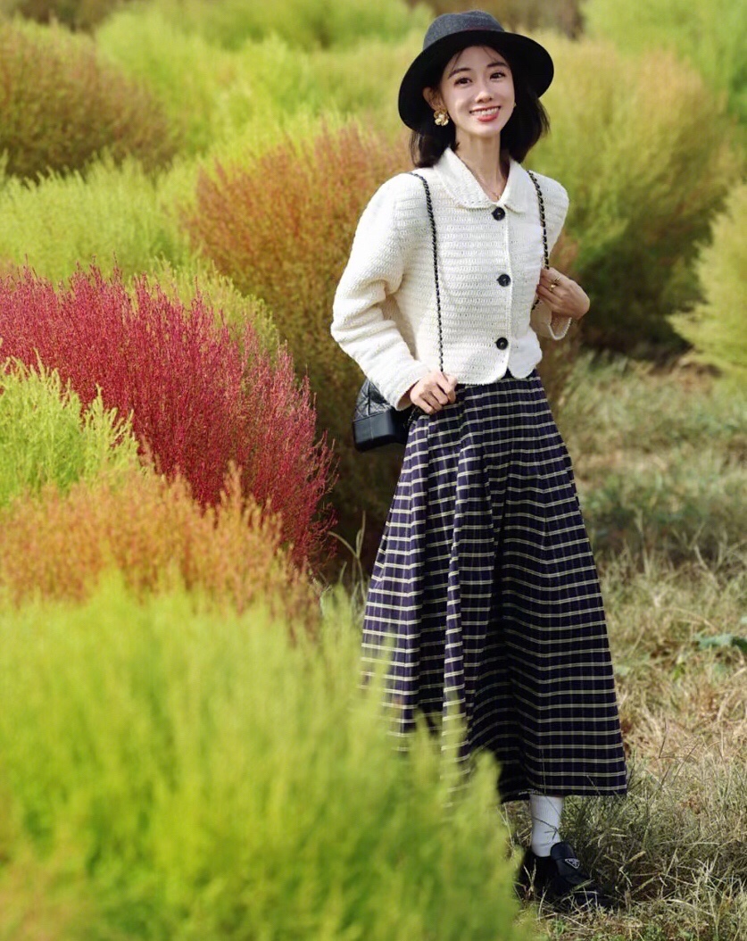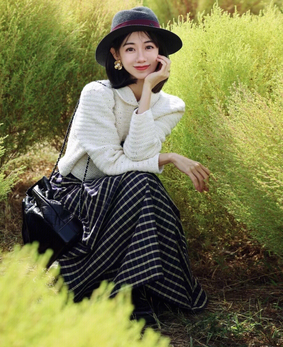 白色的钩针小外套搭配格纹长裙,复古精致,真的是美到骨子里了,超有法式气息的。