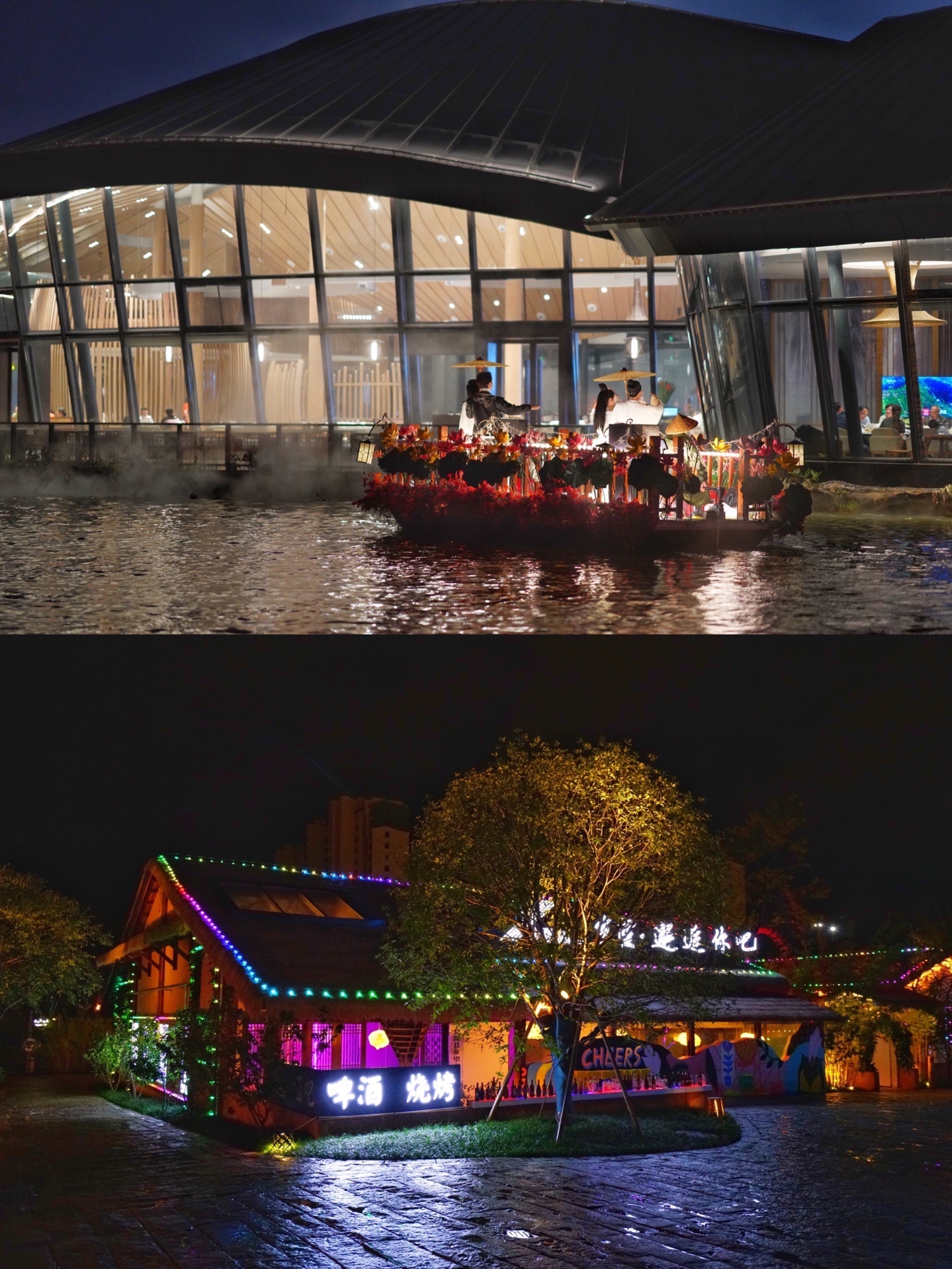 想欣赏夜景,推荐湖水中央的水上餐厅,可以边看花船歌舞表演。